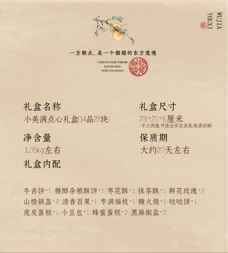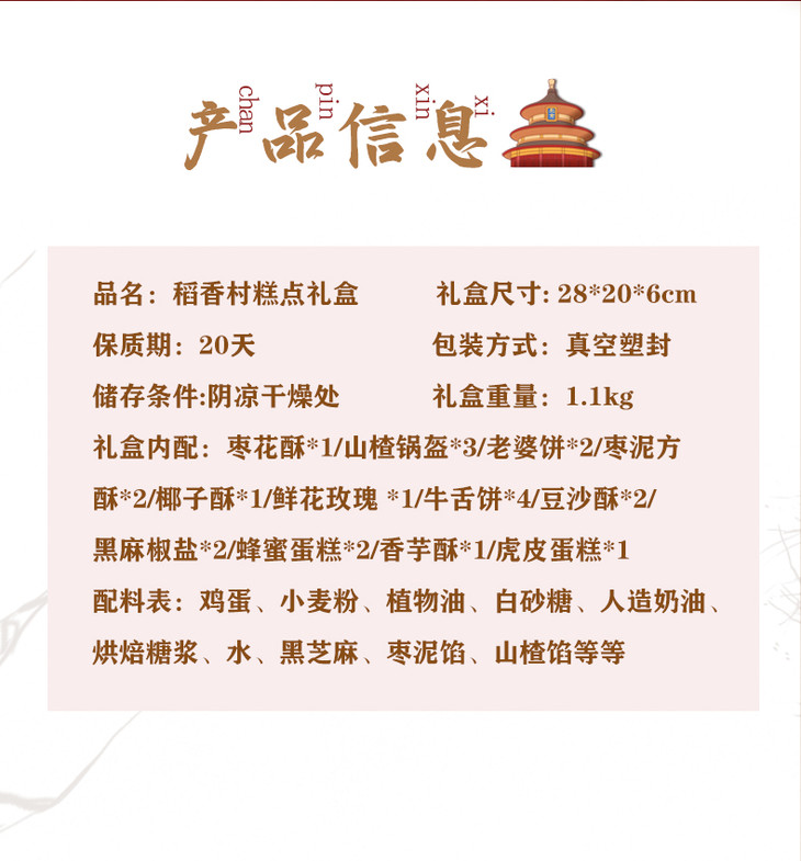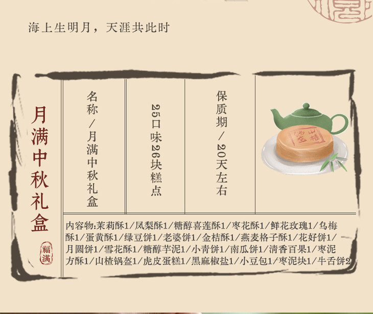 | 稻香村月满中秋百宝礼1.2kg 共26块 | 茉莉酥*1/凤梨酥*1/糖醇喜莲酥*1/枣花酥*1/鲜花玫瑰*1/乌梅酥*1/蛋黄酥*1/绿豆饼*1/老婆饼*1/金桔酥*1/燕麦格子酥*1/花好饼*1/月圆饼*1/凤梨蛋黄酥*1/糖醇芋泥*1/小青饼*1/南瓜饼*1/清香百果*1/枣泥方酥*1/山楂锅盔*1/虎皮蛋糕*1/黑麻椒盐*1/小豆包*1/枣泥块*1/牛舌*2 |