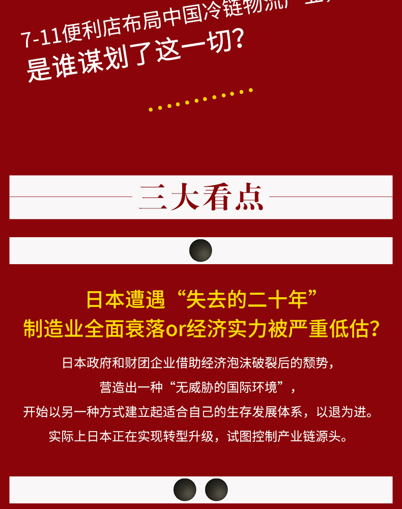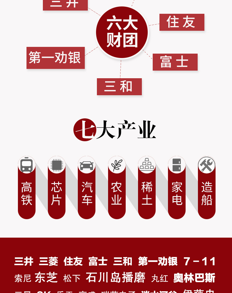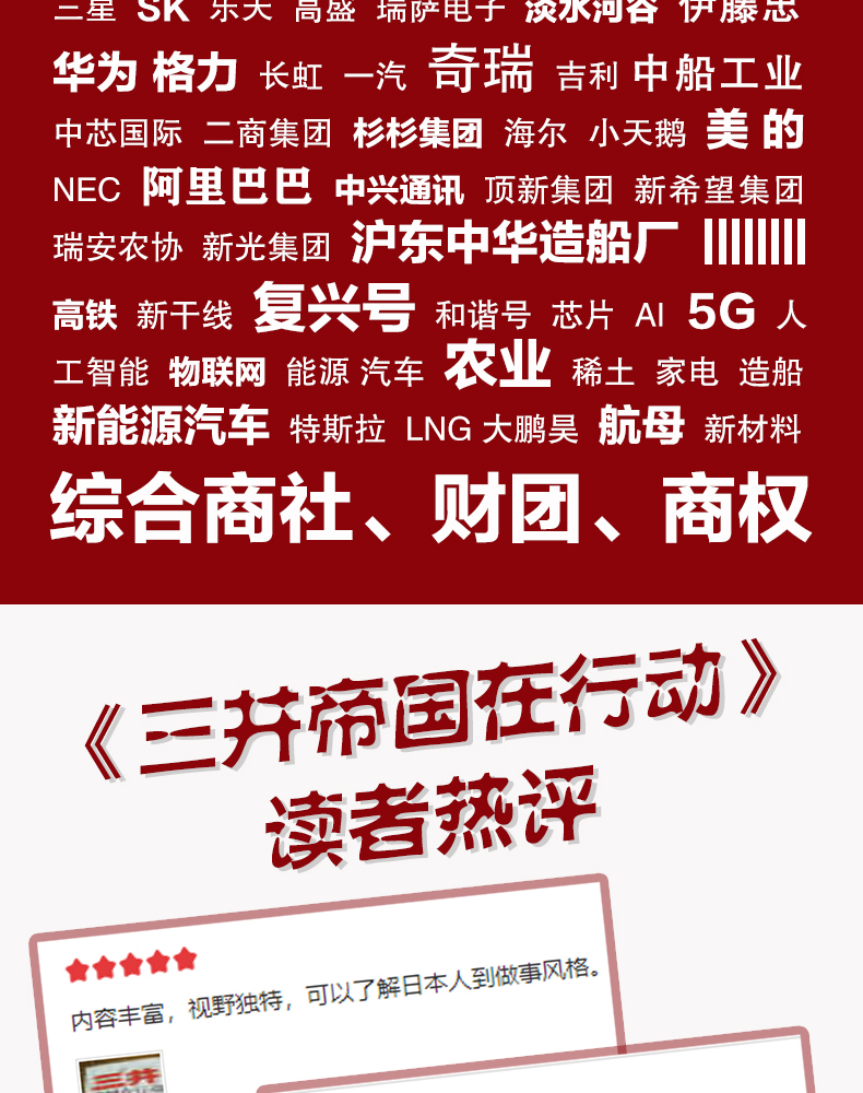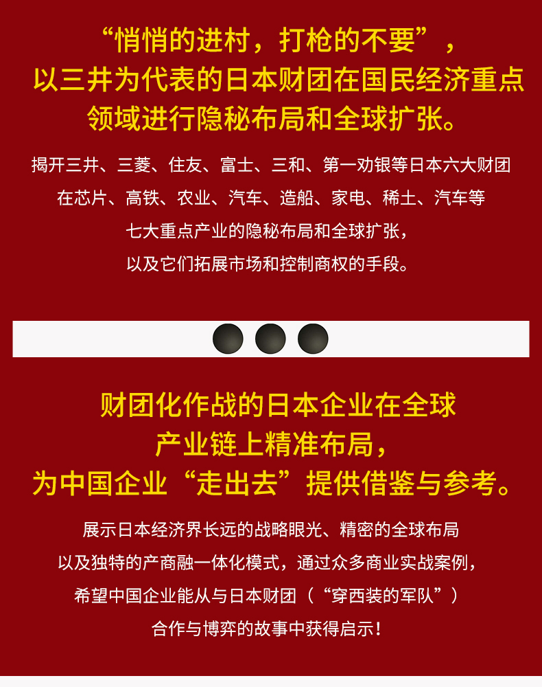 《三井帝国在布局》一书不仅揭开了这些三井财团企业的身世之谜,更重要的是暴露出它们之间互相配合在众多产业上的隐秘布局和扩张策略,以及它们拓展市场和控制商权的手段,从而展现三井财团在高铁、芯片、汽车、农业、稀土、家电等国民经济的重要产业上开辟出的一个又一个战场。