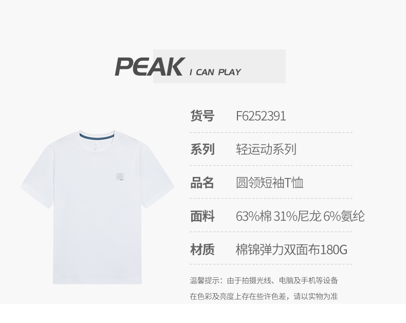 匹克2025年新款轻运动系列男款圆领短袖T恤F6252391