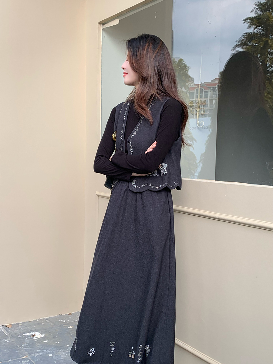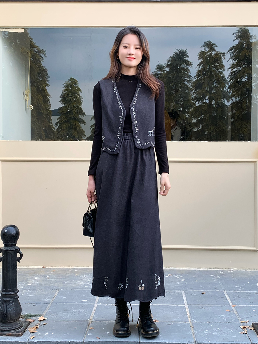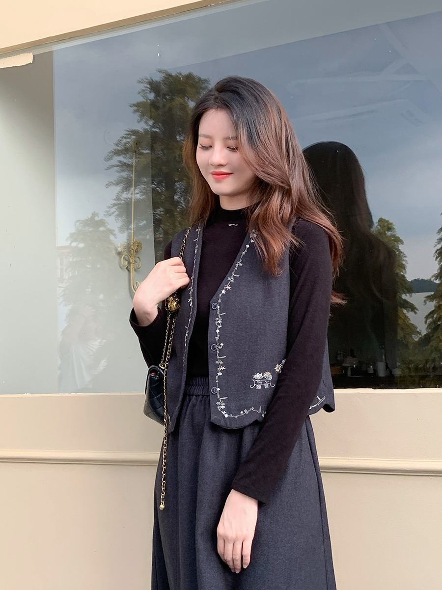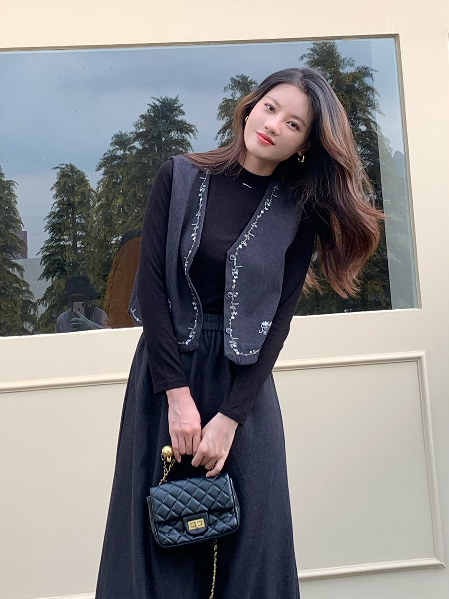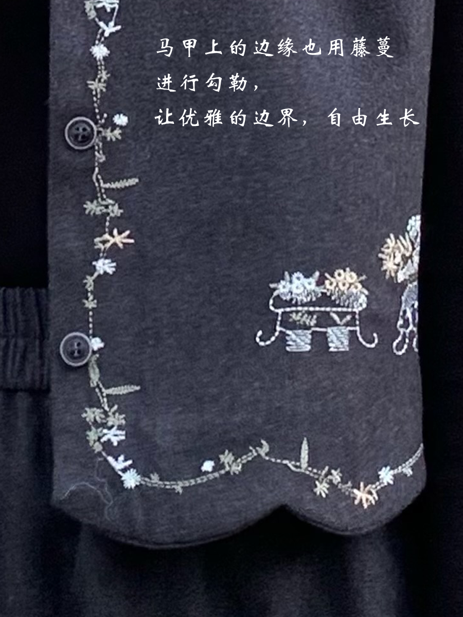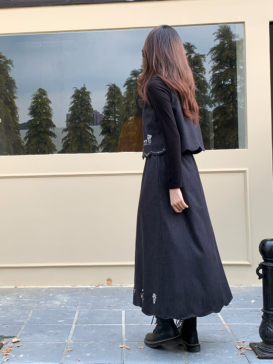 【百图lulu定制】【花蔓套装】【一套299元】花朵刺绣 波浪边马甲 高弹T长袖T恤 A字摆半裙