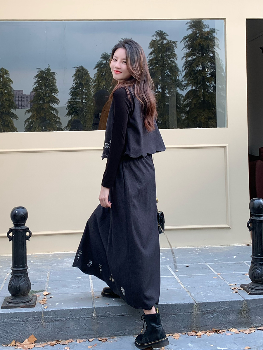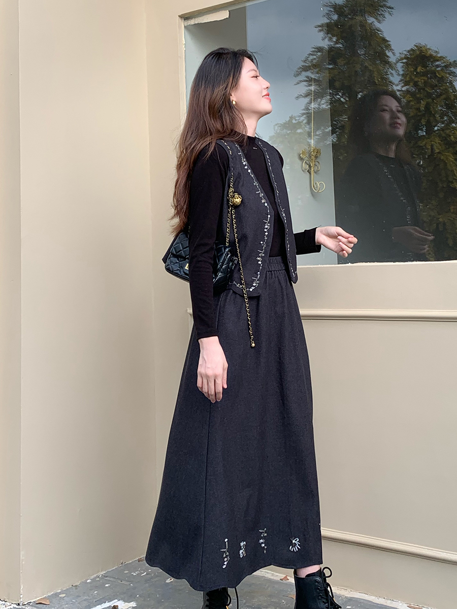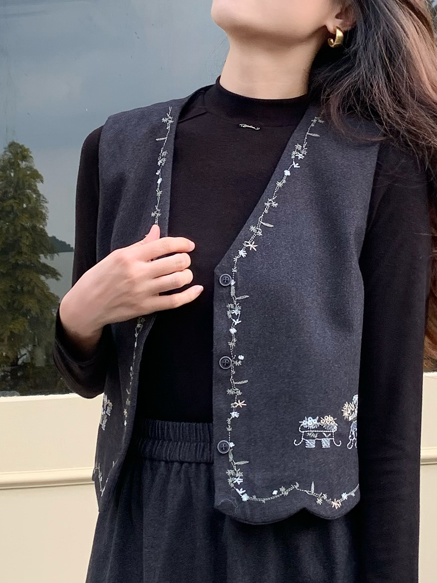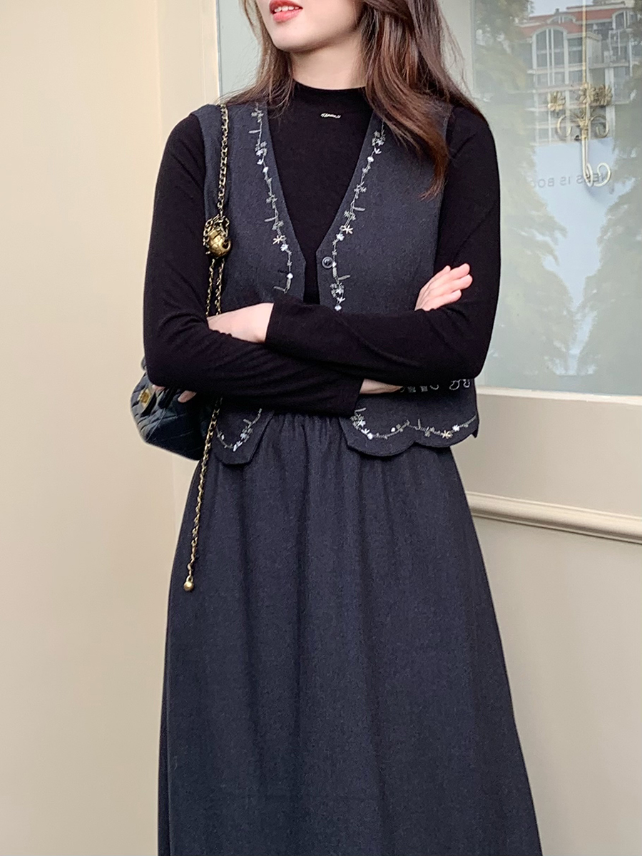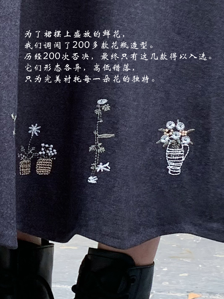 【百图lulu定制】【花蔓套装】【一套299元】花朵刺绣 波浪边马甲 高弹T长袖T恤 A字摆半裙