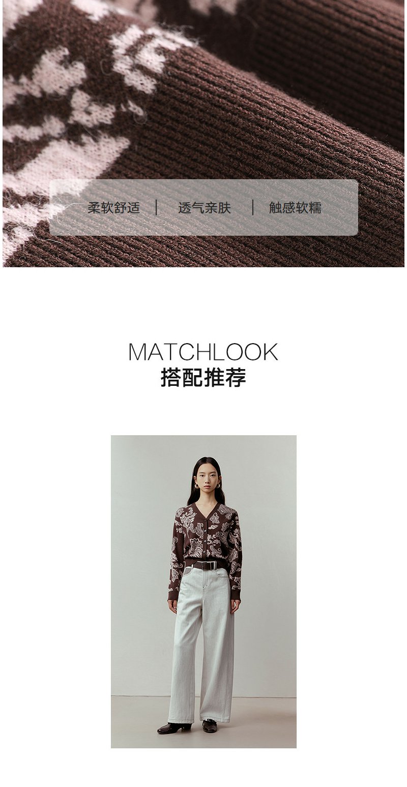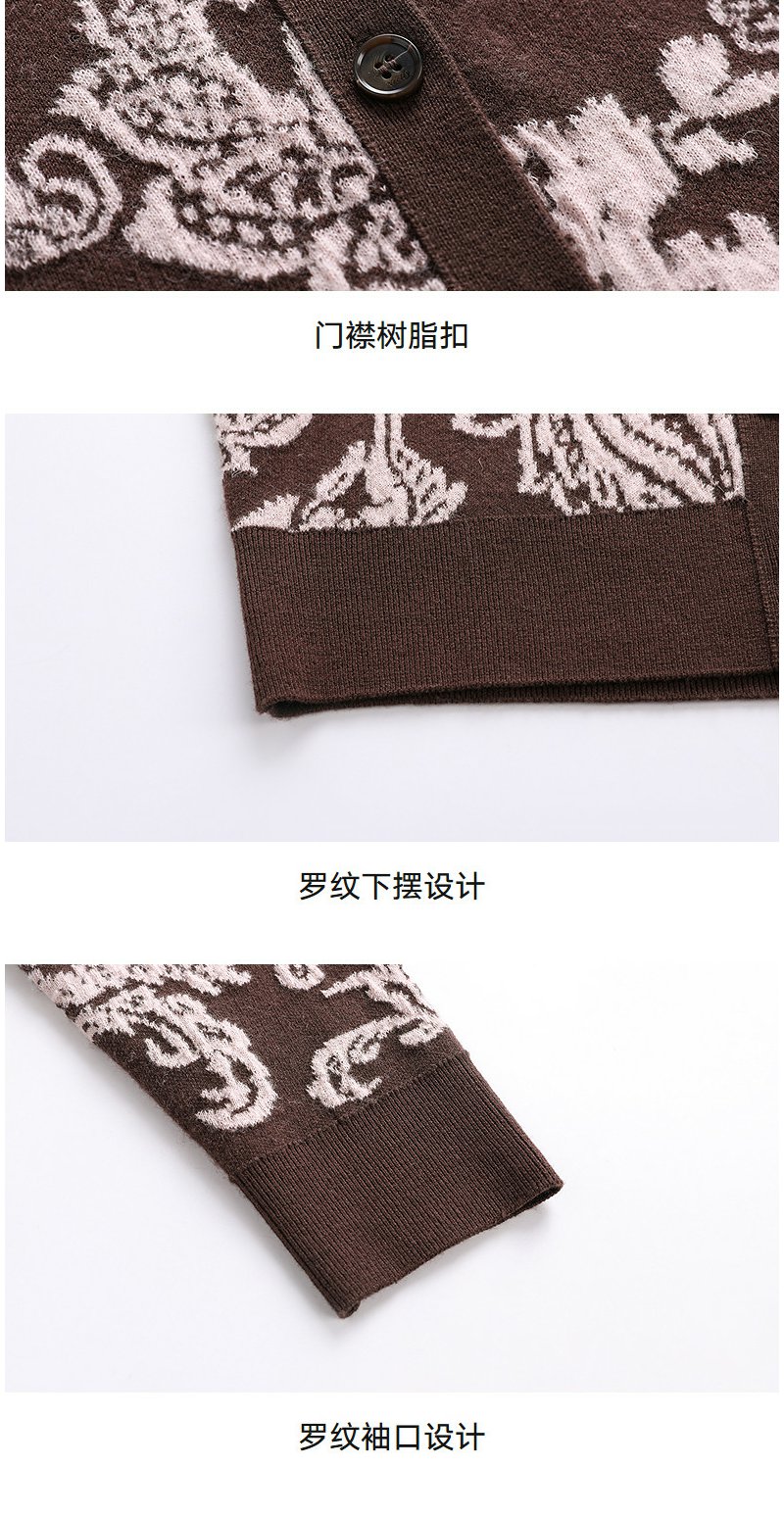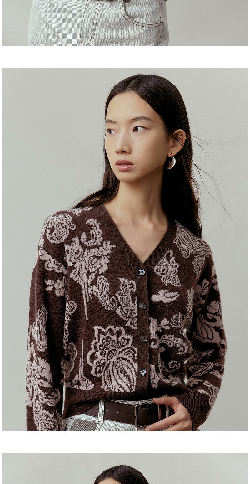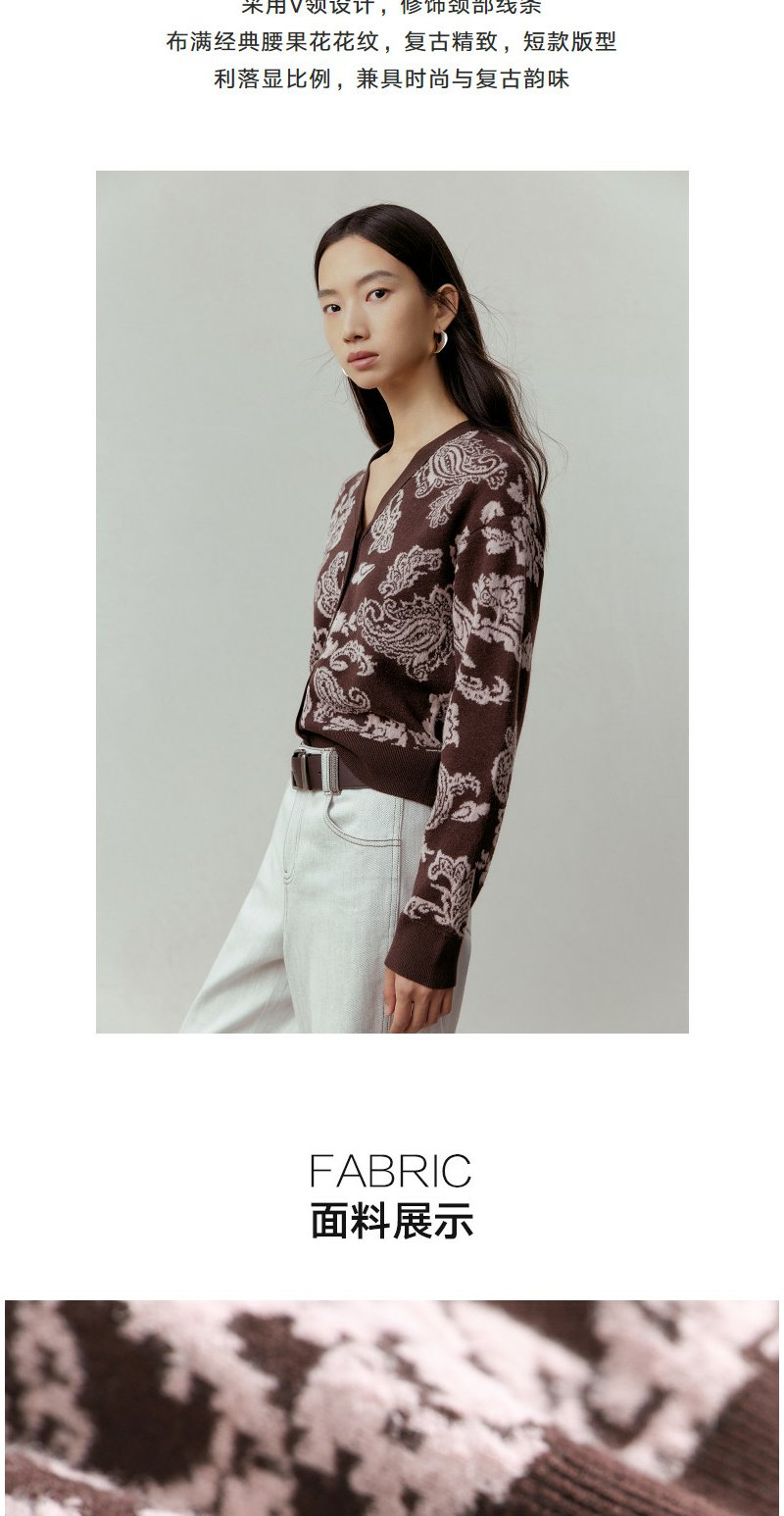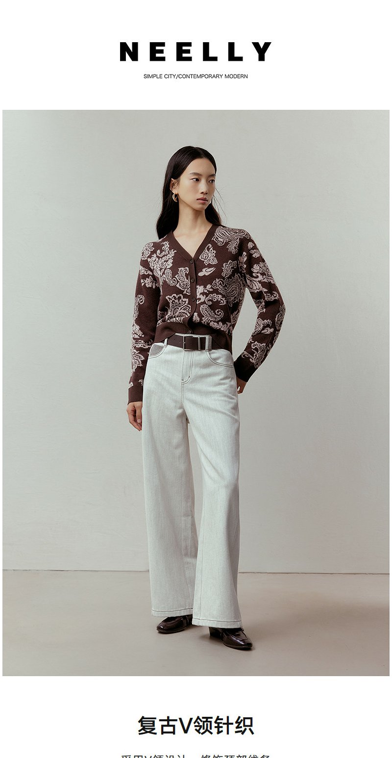 NEELLY纳俪商场同款春季新款复古V领花纹针织开衫女慵懒休闲上衣N26012A01024