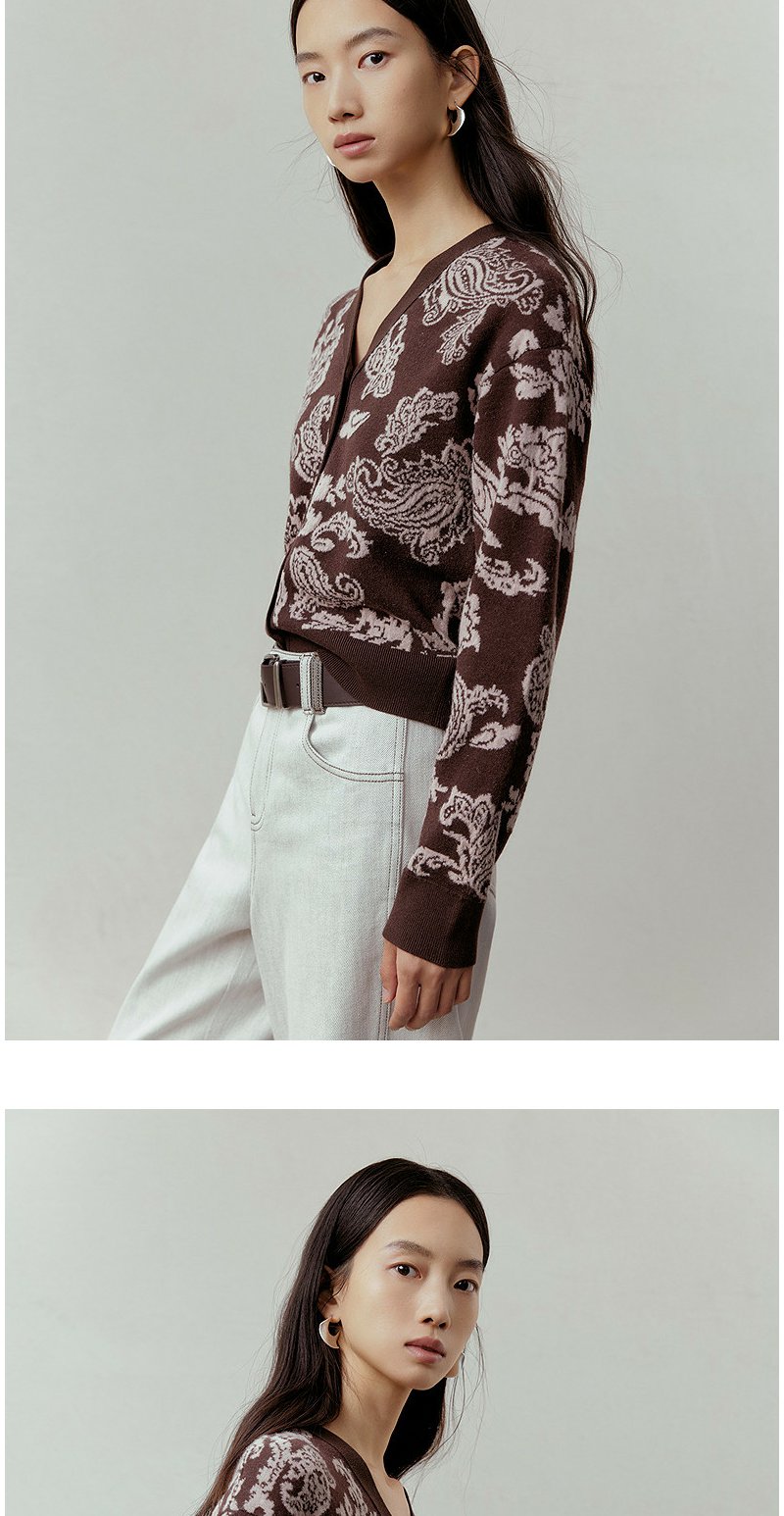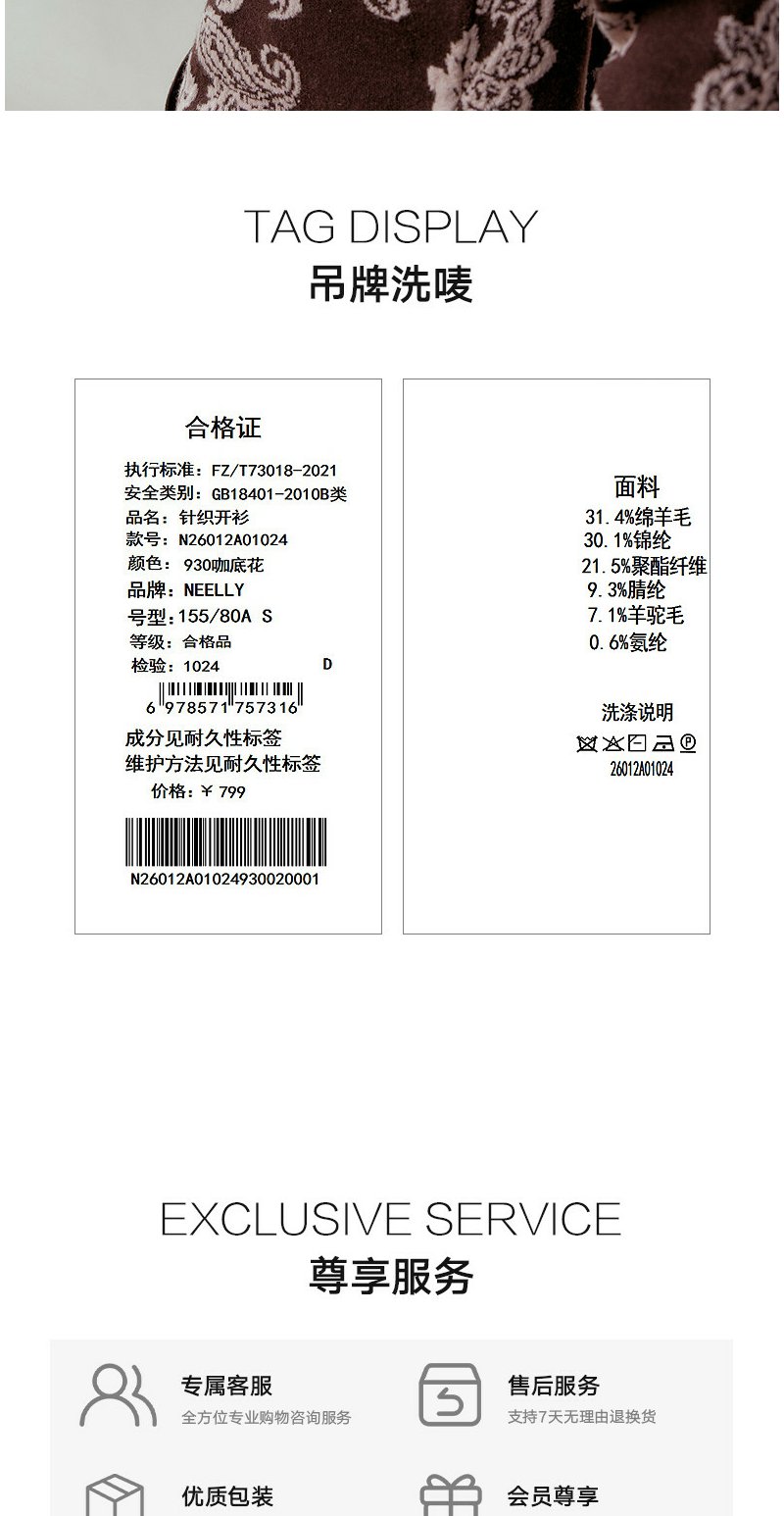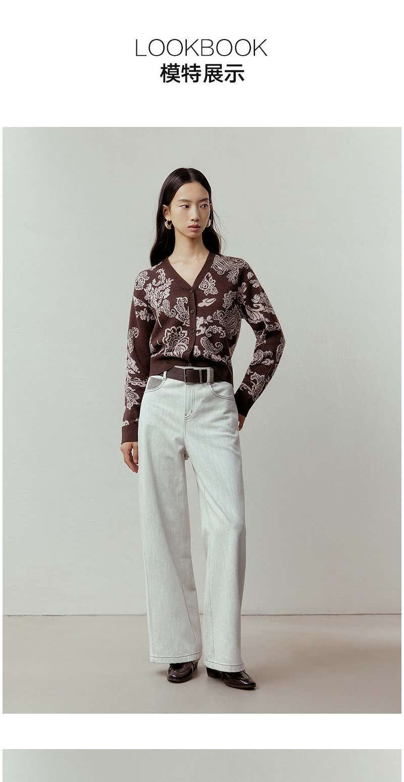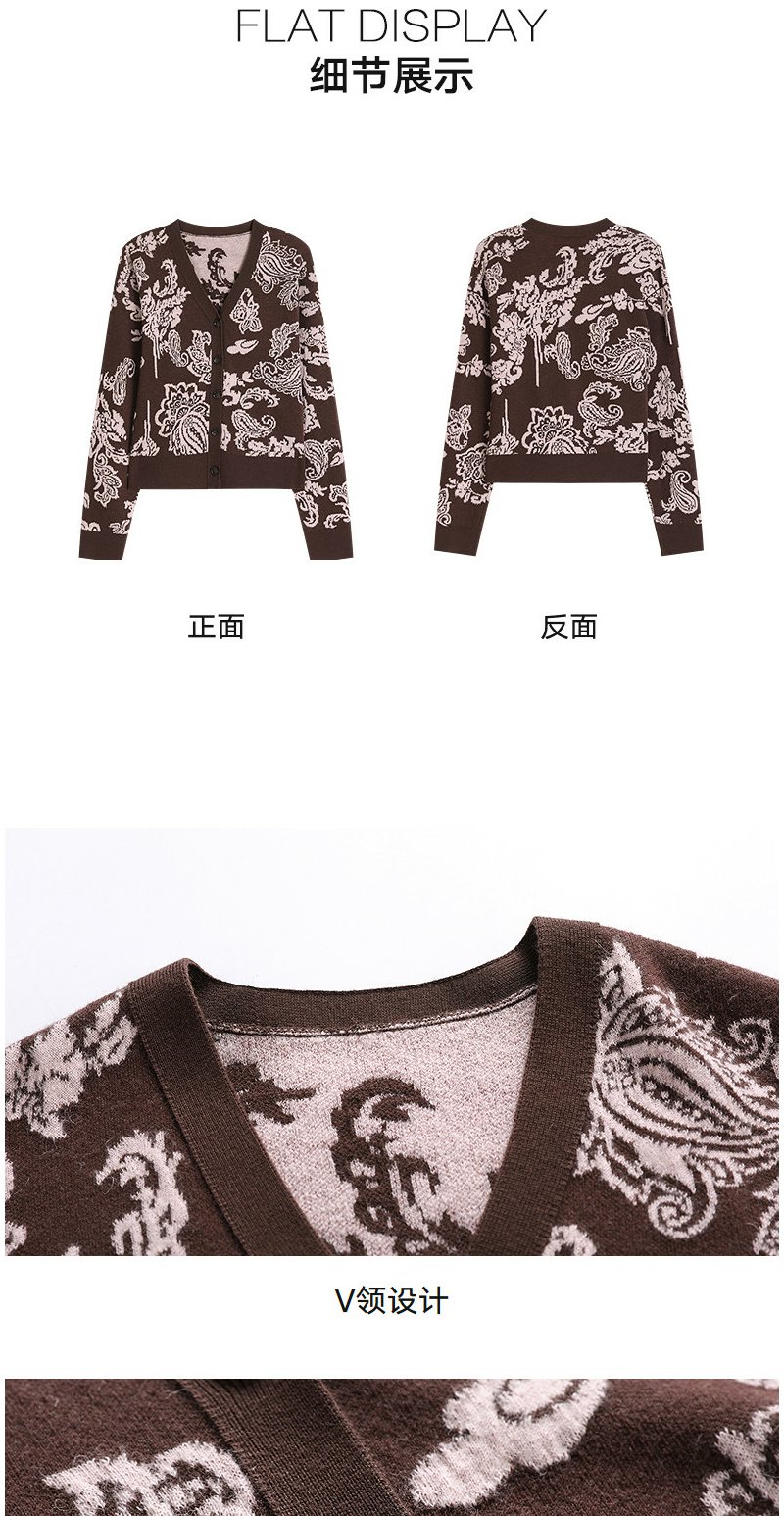 NEELLY纳俪商场同款春季新款复古V领花纹针织开衫女慵懒休闲上衣N26012A01024