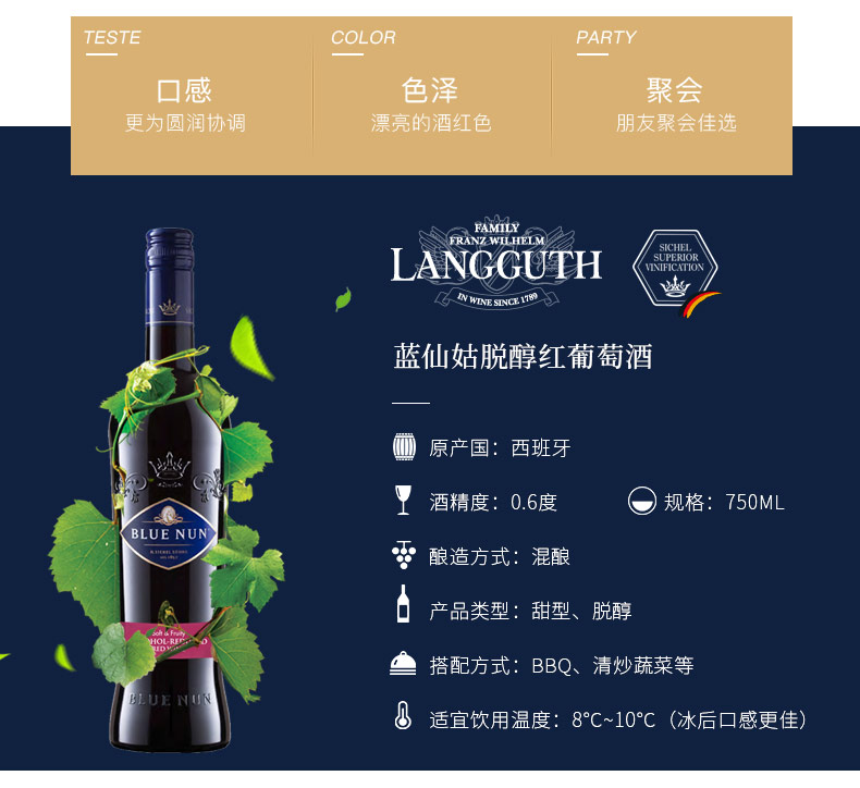 德国蓝仙姑脱醇红葡萄酒750ml/011641 口感更为圆润协调商务宴会婚庆喜宴朋友聚会
