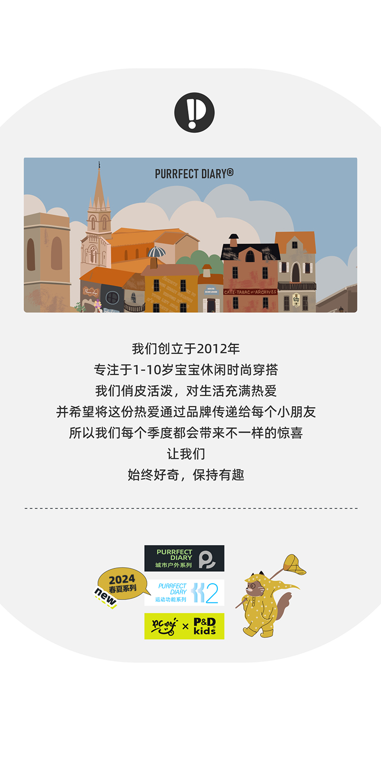- Purrfect-Diary专注于贴近自然随性的穿着概念,轻奢平价的童装文化传播,在产品设计上更加注重婴童穿着的舒适性、安全性、更出众的国际化品牌,将欧美的育婴文化在中国进行深入的传播与推广。