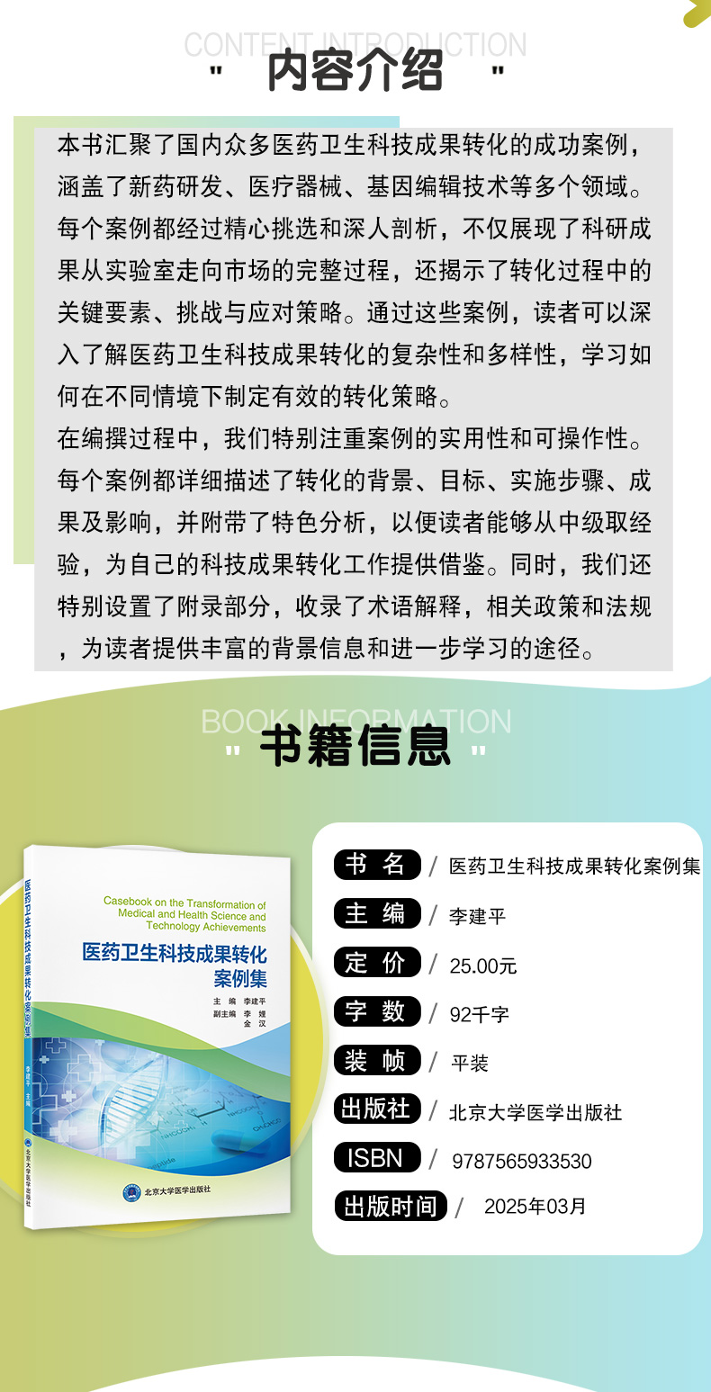 医药卫生科技成果转化案例集 李建平 主编 涵盖了新药研发 医疗器械 基因编辑技术等多个领域9787565933530北京大学医学出版社