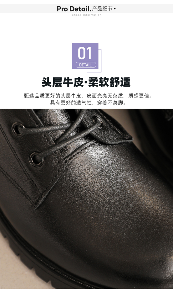 头层牛皮.柔软舒适甄选品质更好的头层牛皮,皮面光亮无杂质,质感更佳。具有更好的透气性,穿着不臭脚。