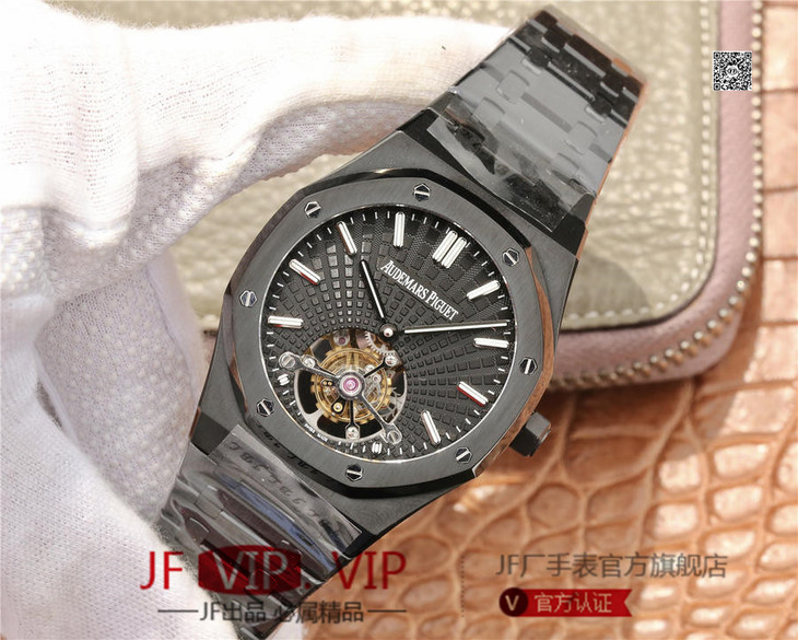 R8爱彼黑武士陀飞轮。型号:26522CE.00.1225CE.01探索全新途径,心灵与眼眸共同领略的同时用心打造不一样传奇。黑色表盘镌刻“Tapisserie Evolutive”格绞装饰,白金荧光立体指针、采用瑞士超强夜光...搭配Cal.2924一体陀飞轮、非加甲版。动力储存为80小时,表壳直径41mm厚度仅限10.6毫米。