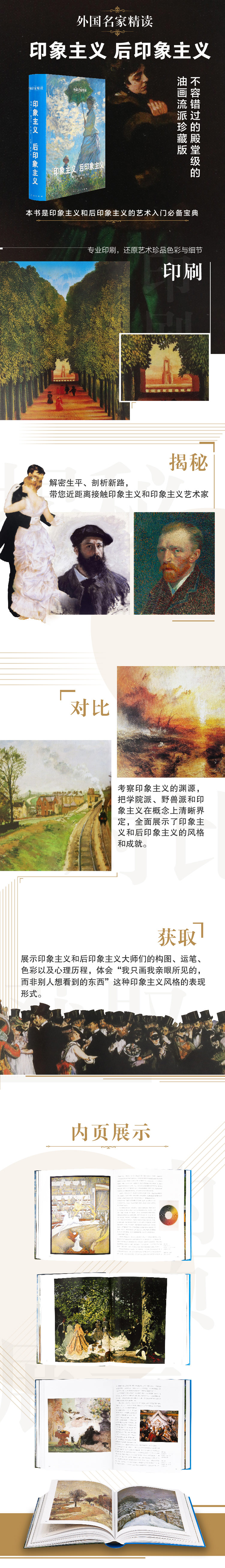 《外国名家精读:印象主义 后印象主义》考察了对印象主义的渊源,把它和学院派绘画做了对比;对后印象主义也做了概念上的清晰界定,和新印象主义、纳比画派的关系也做了评述。300幅爱德华·马奈、克劳德·莫奈、皮埃尔·奥古斯特·雷诺阿、阿尔弗雷德·西斯莱、卡米耶·毕沙罗、埃德加·德加、贝尔特·摩里索、保罗·塞尚、文森特·凡·高、保罗·高更、亨利·卢梭、亨利德图卢兹·劳特累克的作品全面展示了印象主义和后印象主义的风格和成就。