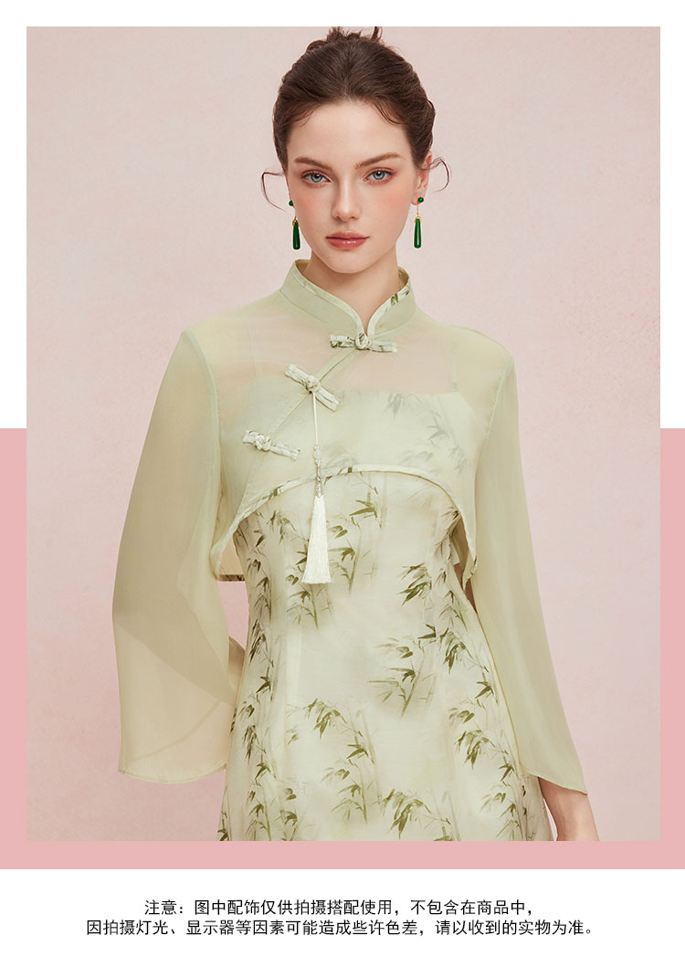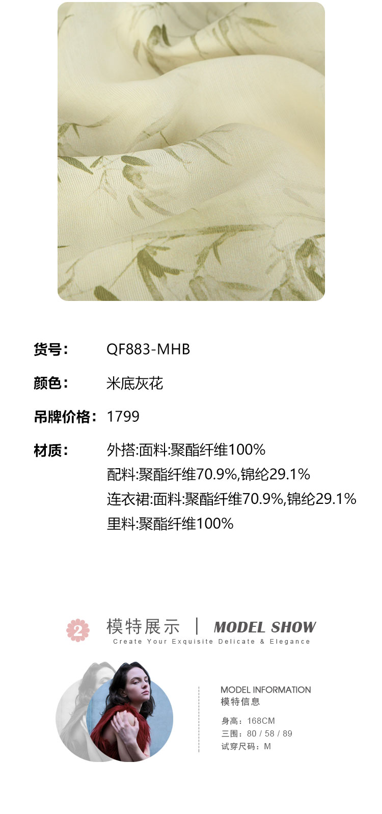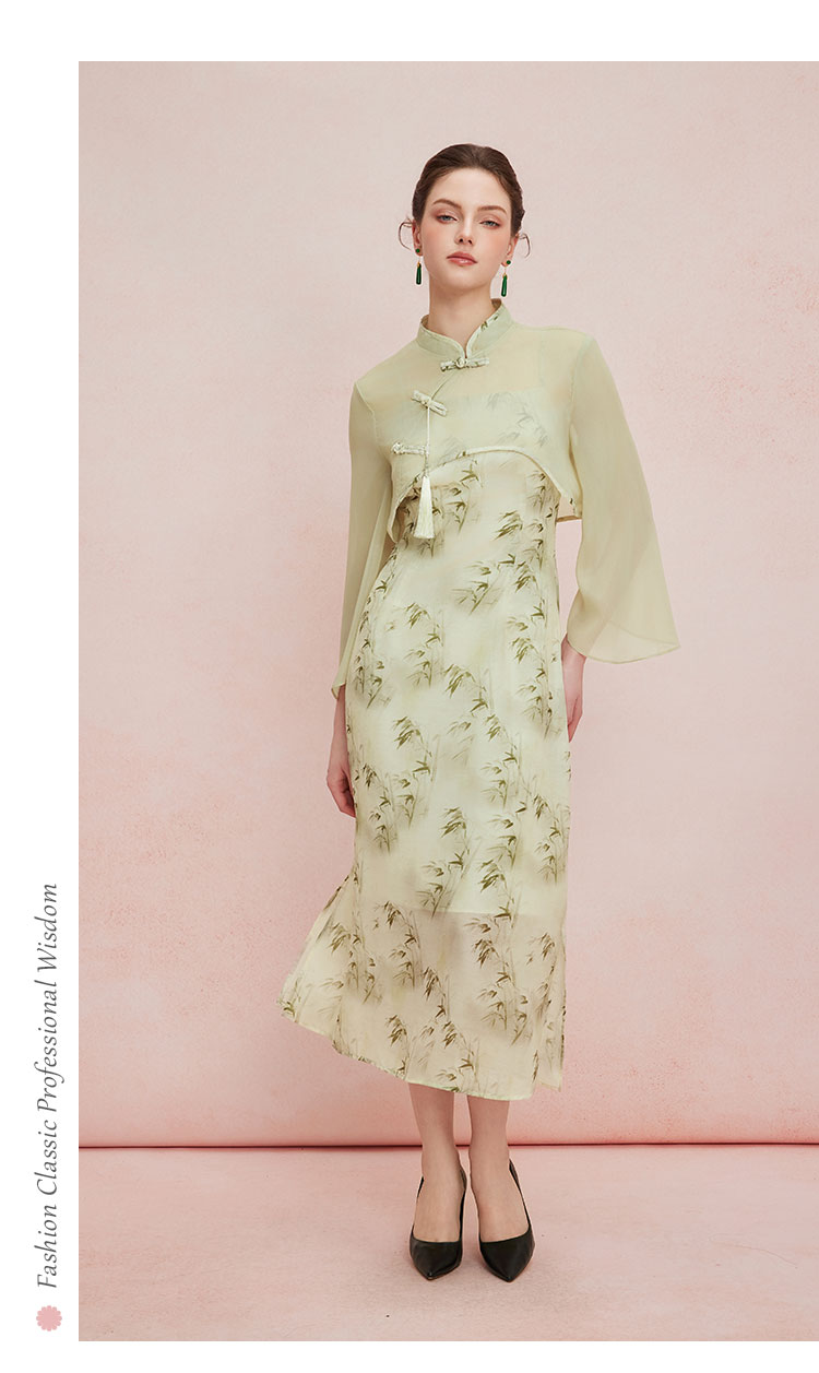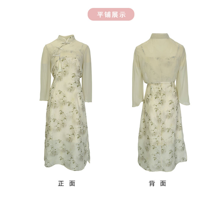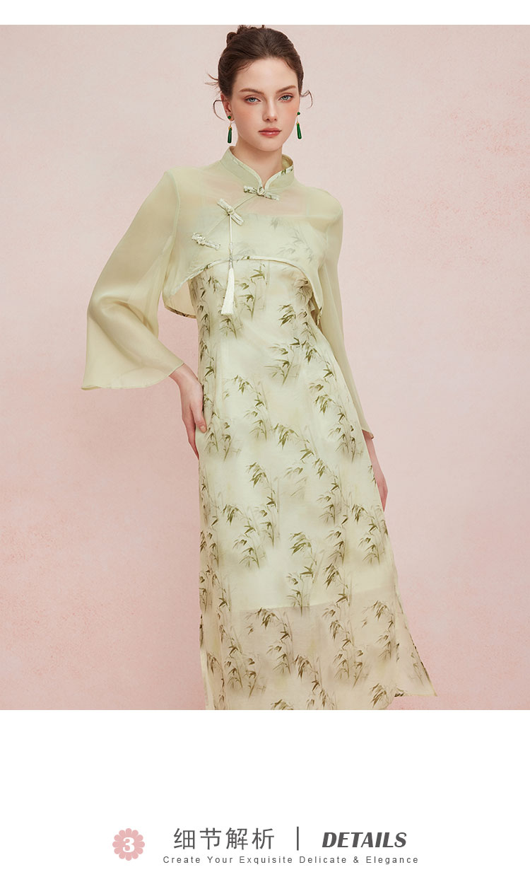 QF883斯尔丽25新款改良版旗袍抛袖薄纱上衣搭配印花内搭连衣裙两件套装