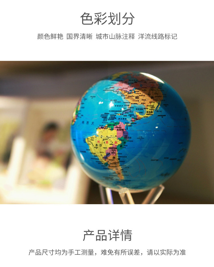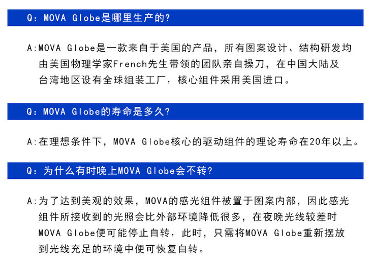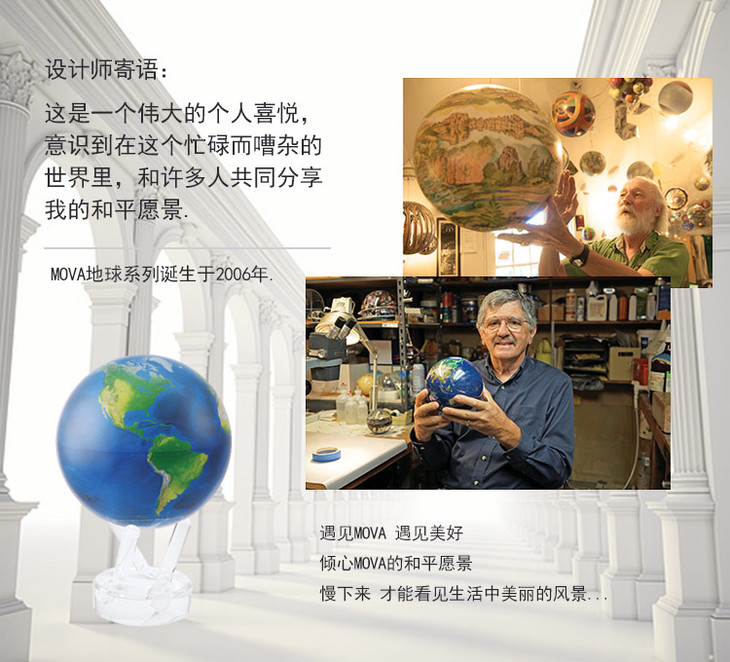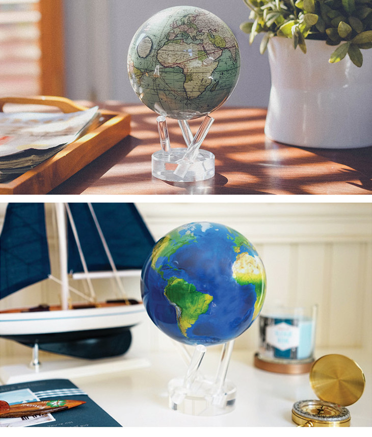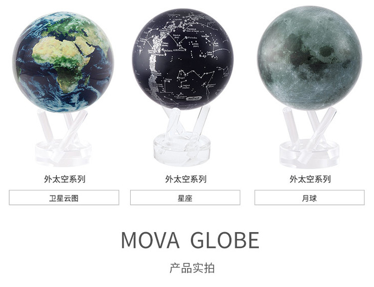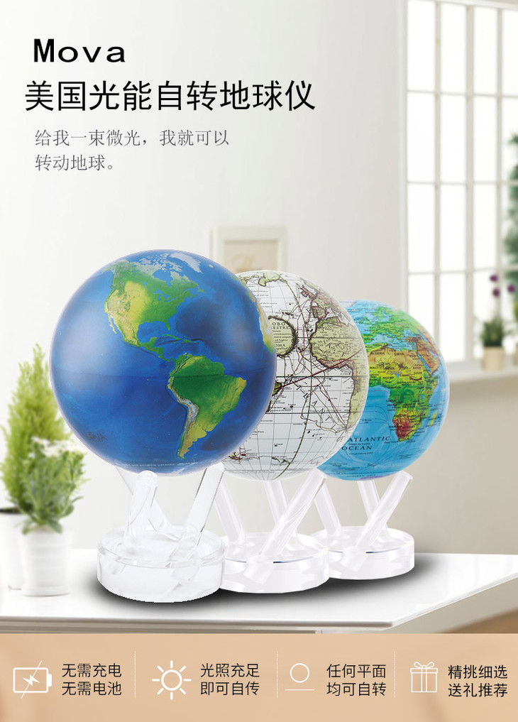 MOVA Globe是由美国托特科技有限公司设计的、世界上第一款可以依靠光能及磁场自传的创意地球仪。依靠其双层球体悬浮的独特构造,MOVA Globe在任意角度均可保证图案水平。MOVA Globe同时拥有超低摩擦自传马达技术、低耗太阳能驱动技术、液体辅助光学投影技术、精密微体积光学液体悬浮技术、3D球体印刷成型技术、零气泡液体灌装技术、成品精密封装技术等7大核心专利技术,并且荣获纽约国际礼品展最佳创意产品奖、拉斯维加斯最佳新技术等多项国际大奖。堪称真正的“21世纪高科技创新礼品”