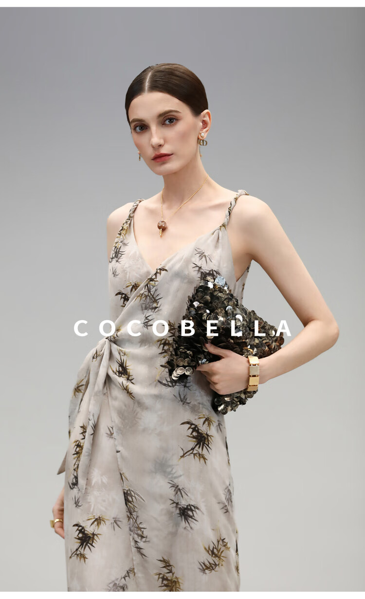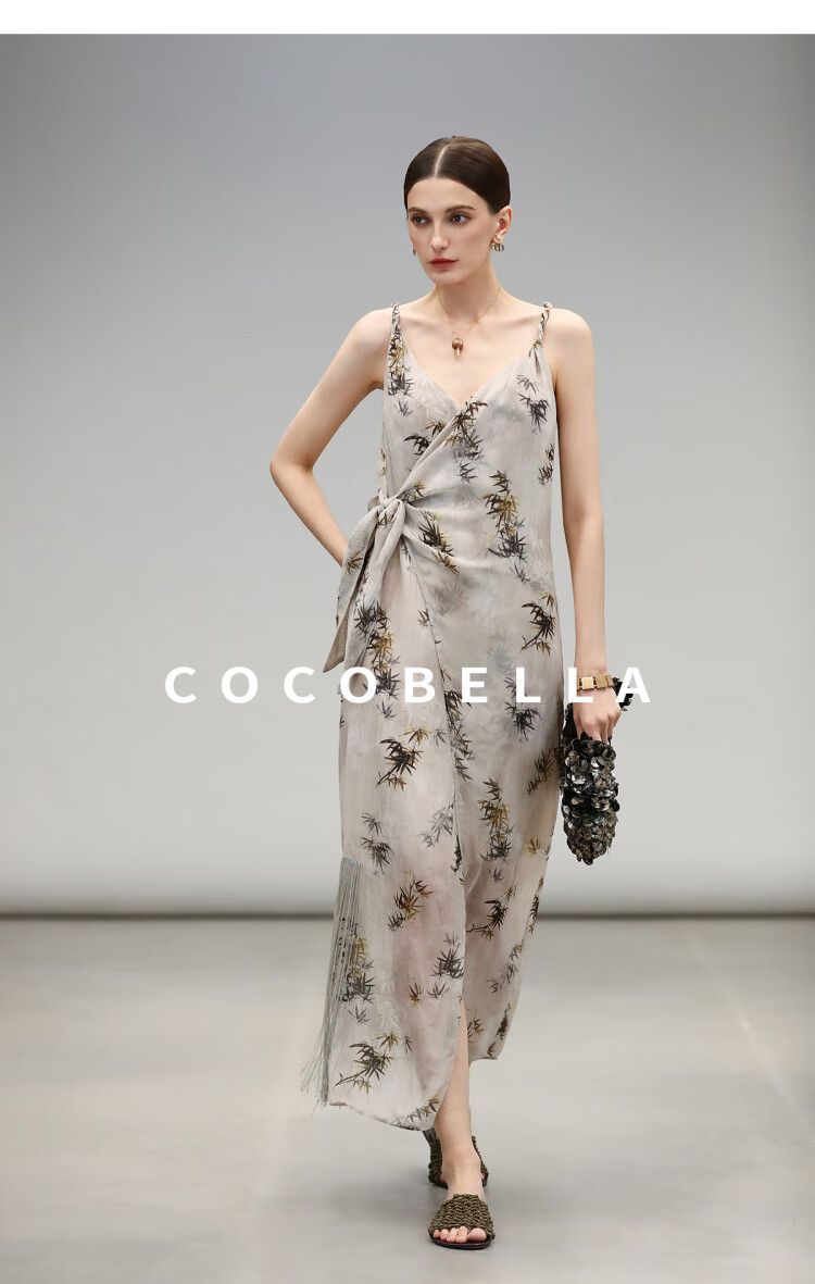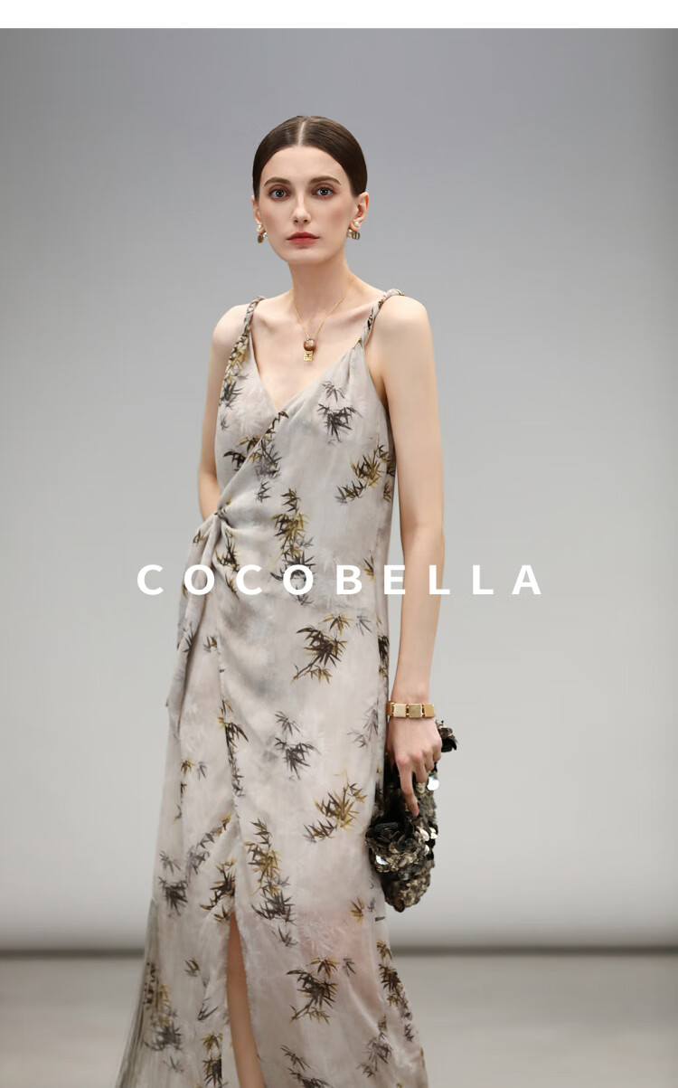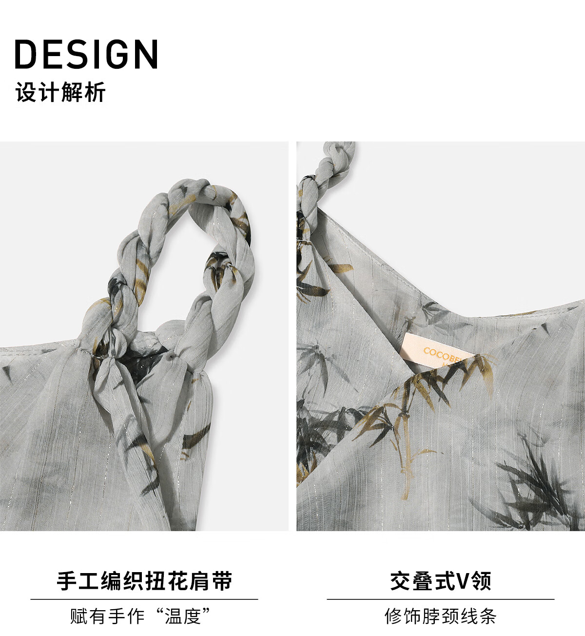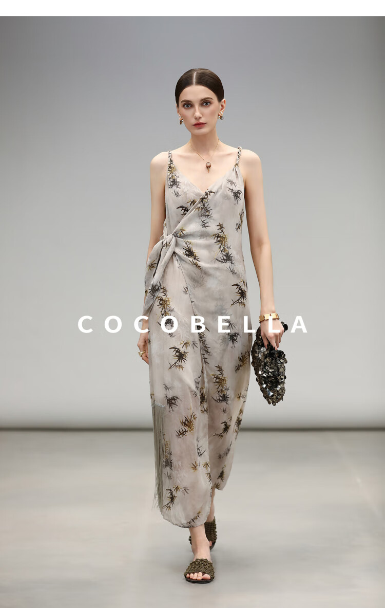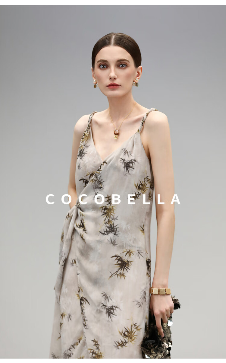 COCOBELLA新中式金葱雪纺竹子印花绑带连衣裙国风吊带裙FR7027