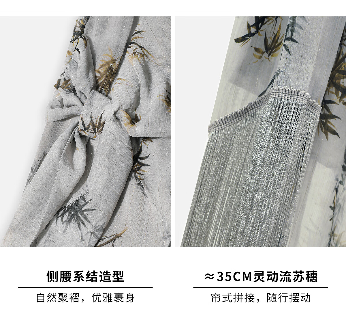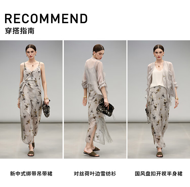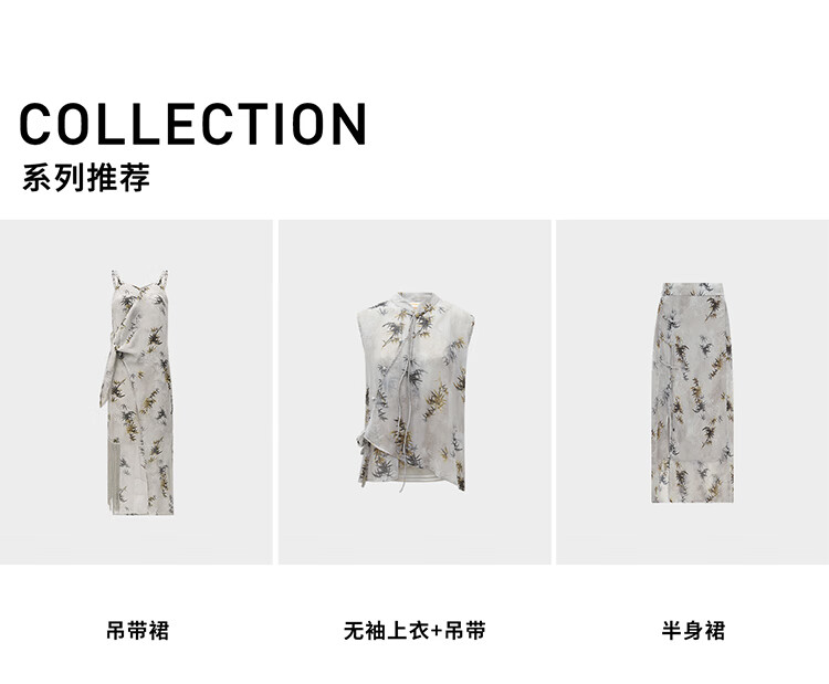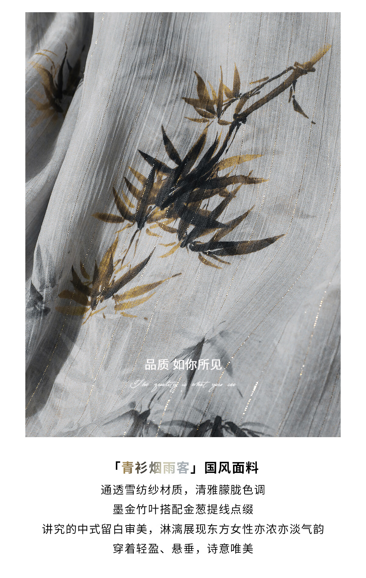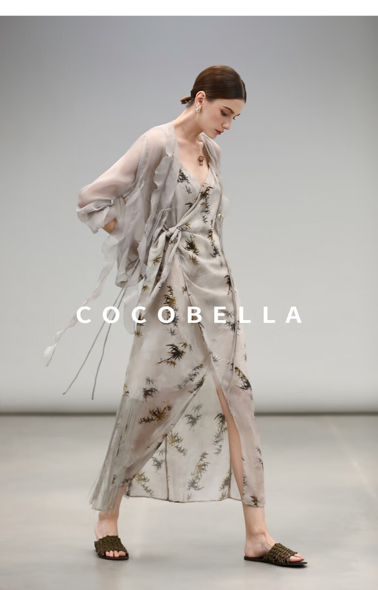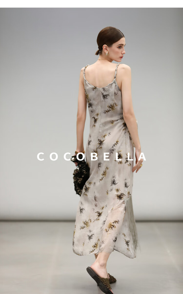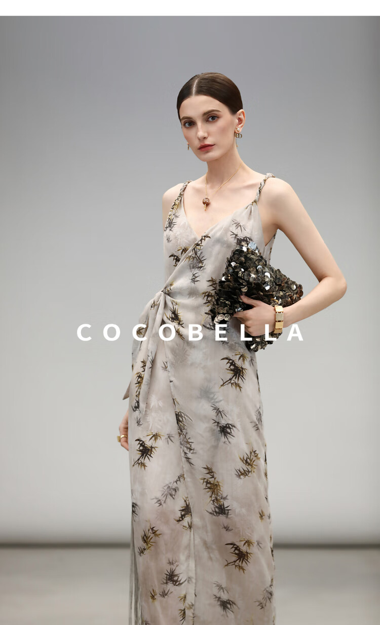 COCOBELLA新中式金葱雪纺竹子印花绑带连衣裙国风吊带裙FR7027