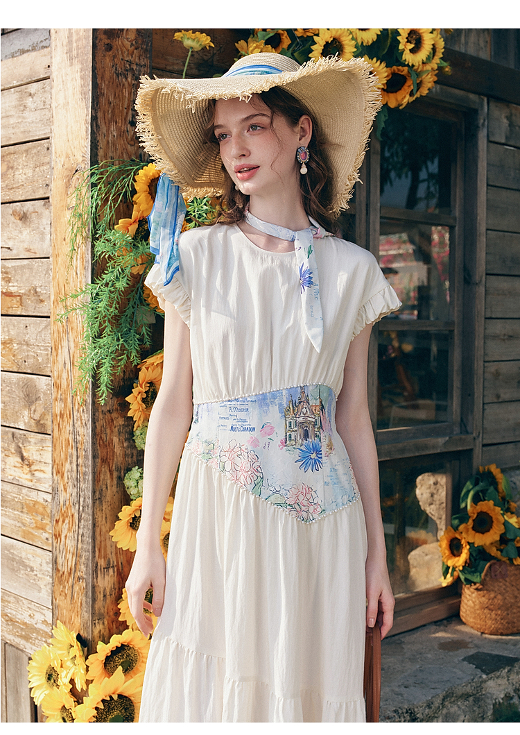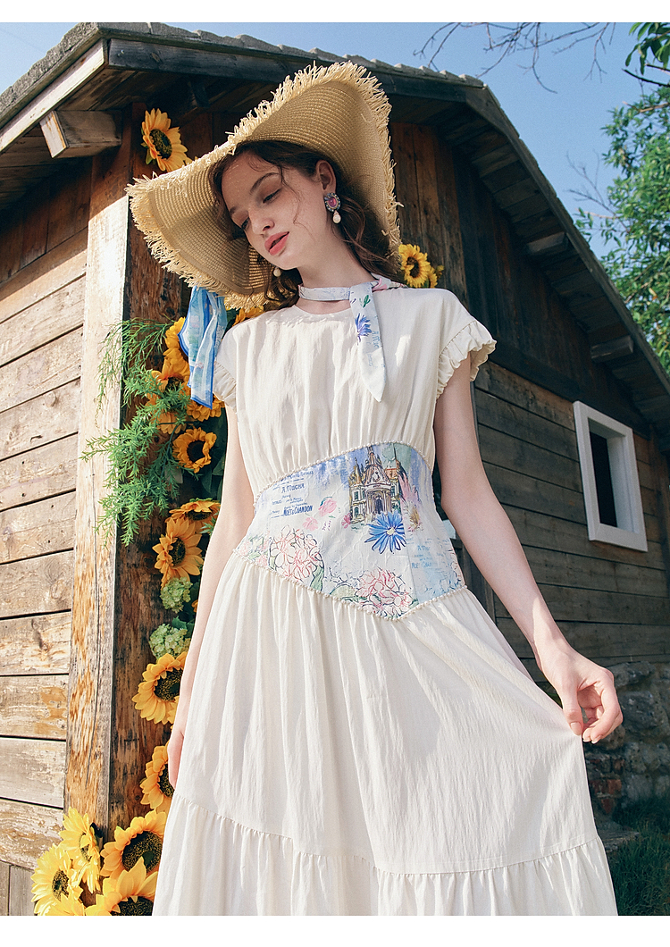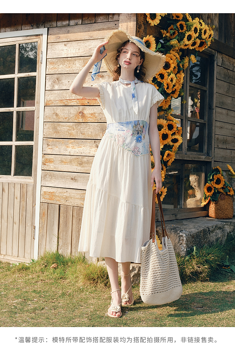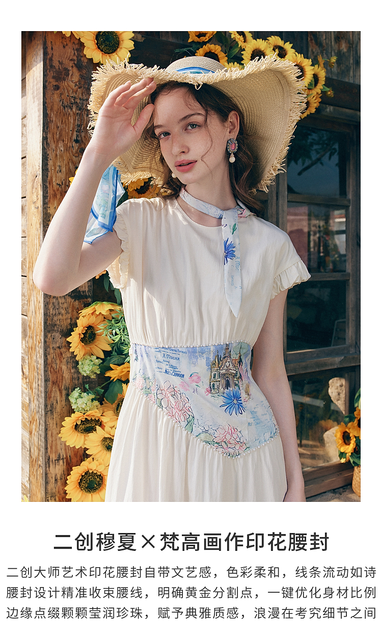 两三事梵高文艺微光恋曲2026春新款可拆领带印花假腰封拼接连衣裙
