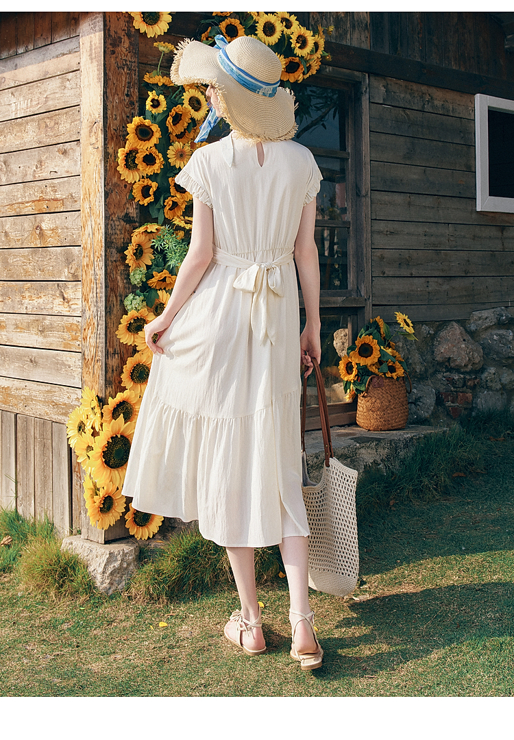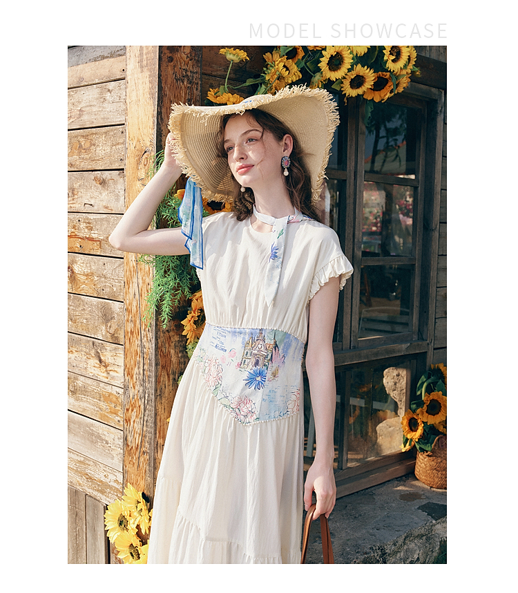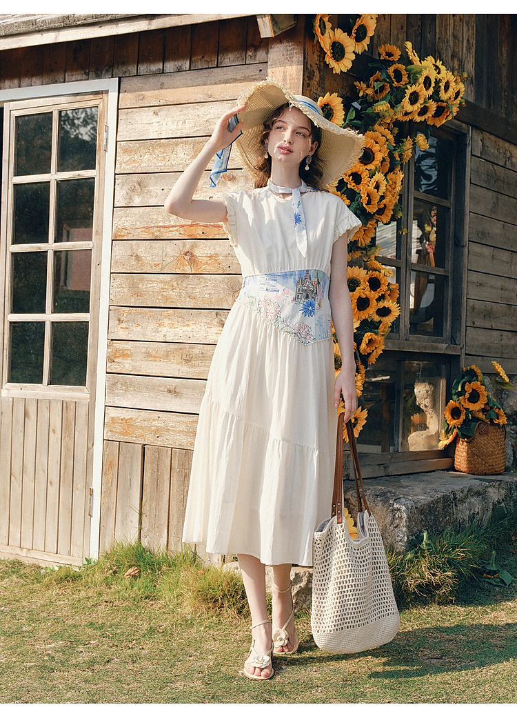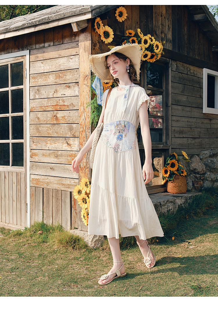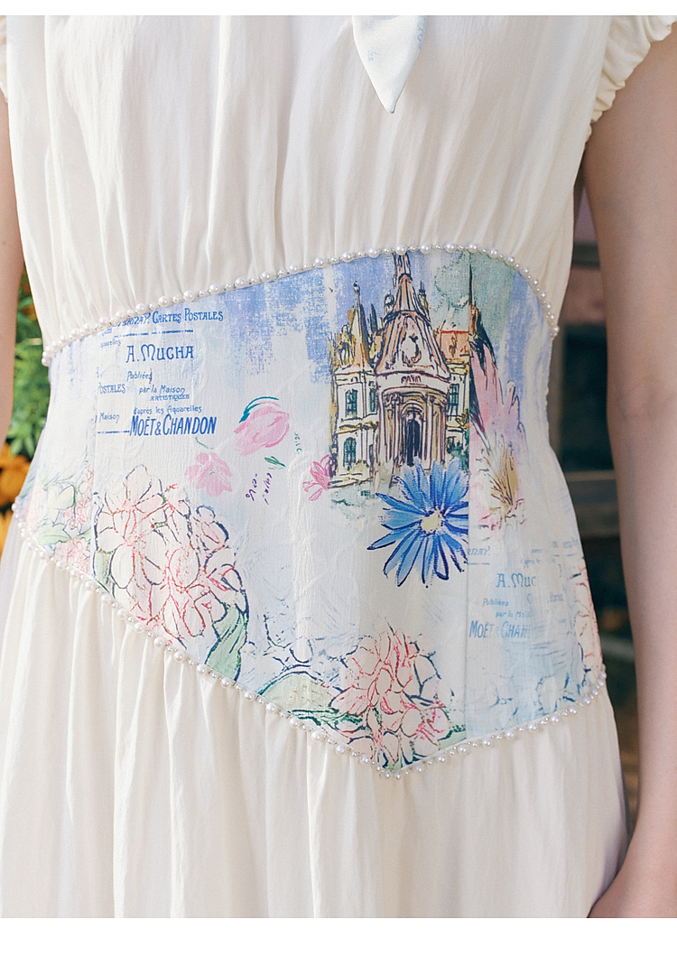 两三事梵高文艺微光恋曲2026春新款可拆领带印花假腰封拼接连衣裙