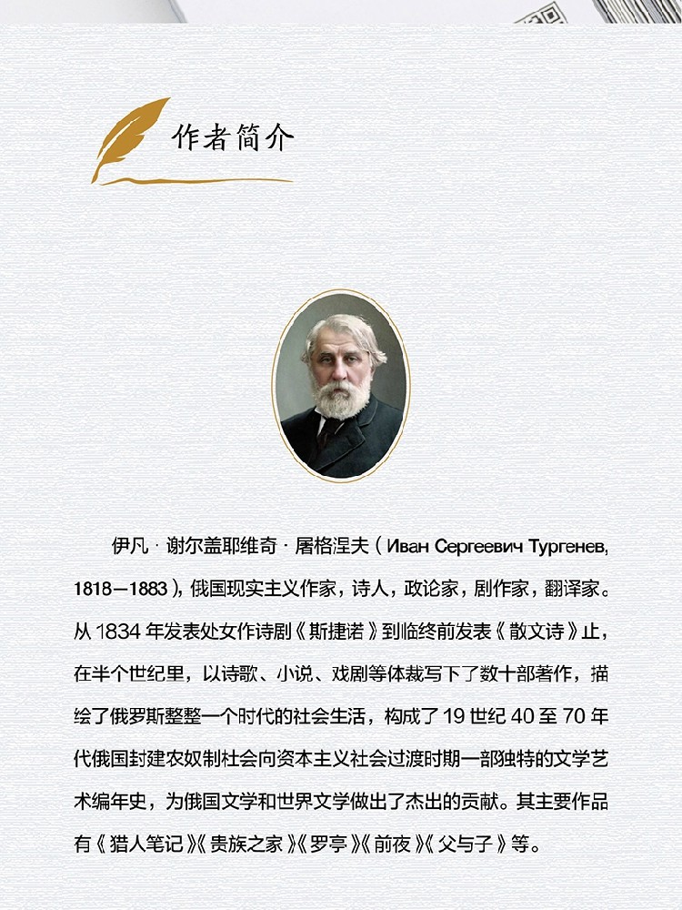 伊凡•谢尔盖耶维奇•屠格涅夫(Иван Сергеевич Тургенев,1818﹘1883),俄国现实主义作家,诗人,政论家,剧作家,翻译家。从1834年发表处女作诗剧《斯捷诺》到临终前发表《散文诗》止,在半个世纪里,以诗歌、小说、戏剧等体裁写下了数十部著作,描绘了俄罗斯整整一个时代的社会生活,构成了19世纪40至70年代俄国封建农奴制杜会向资本主义社会过渡时期一部独特的文学艺术编年史,为俄国文学和世界文学做出了杰出的贡献。其主要作品有《猎人笔记》《贵族之家》《罗亭》《前夜》《父与子》等。