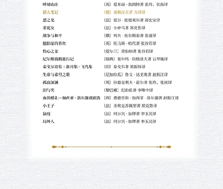 第一辑30种:《伊索寓言》《一千零一夜》《托尔梅斯河的拉撒路》《培根随笔全集》《伯爵家书》《弃儿汤姆•琼斯史》《少年维特的烦恼》《傲慢与偏见》《红与黑》《欧也妮•葛朗台 高老头》《普希金诗选》《巴黎圣母院》《大卫•考坡菲》《双城记》《呼啸山庄》《猎人笔记》《恶之花》《茶花女》《战争与和平》《德伯家的苔丝》《伤心之家》《尼尔斯骑鹅旅行记》《泰戈尔诗集:新月集•飞鸟集》《生命与希望之歌》《孤寂深渊》《泪与笑》《血的婚礼:加西亚•洛尔迦戏剧选》《小王子》《鼠疫》《局外人》。