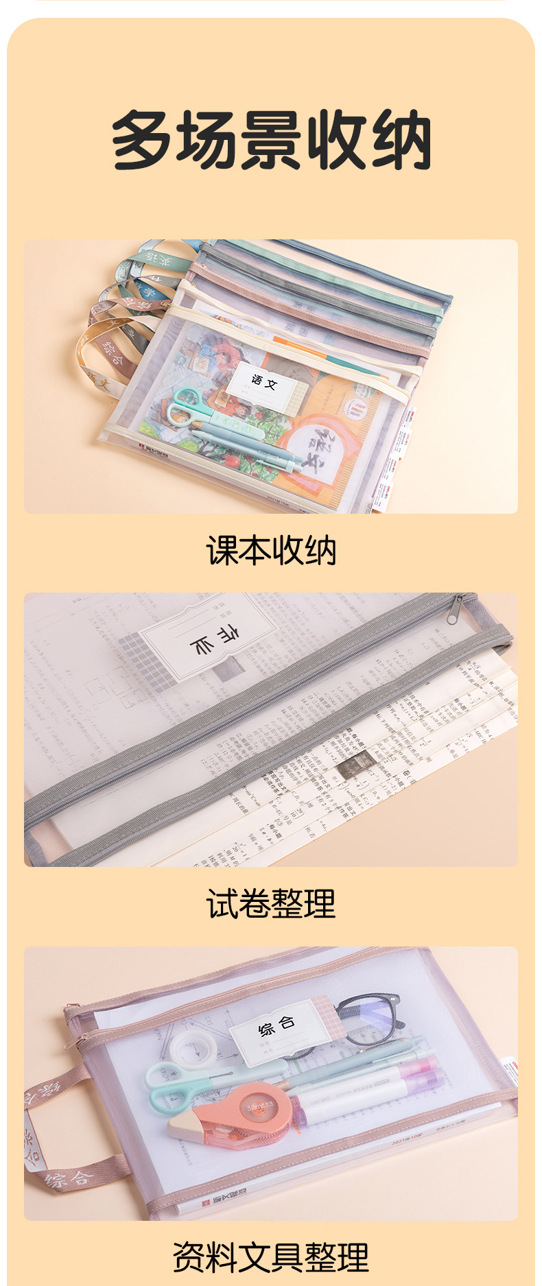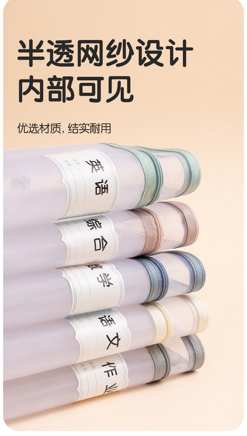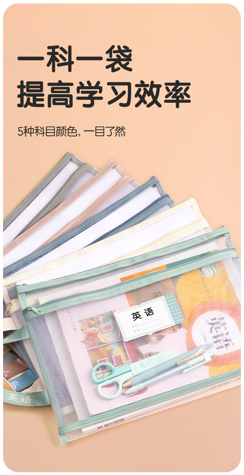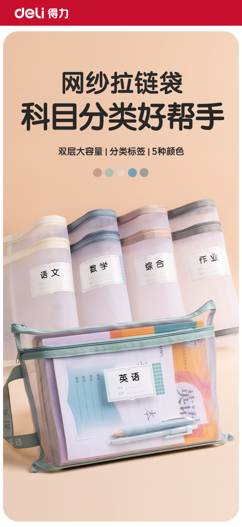 【科目分类好帮手!网纱拉链袋】得力学科科目分类文件袋小学生拉链式试卷双层收纳袋透明网纱袋子,一科一袋,提高学习效率。ry