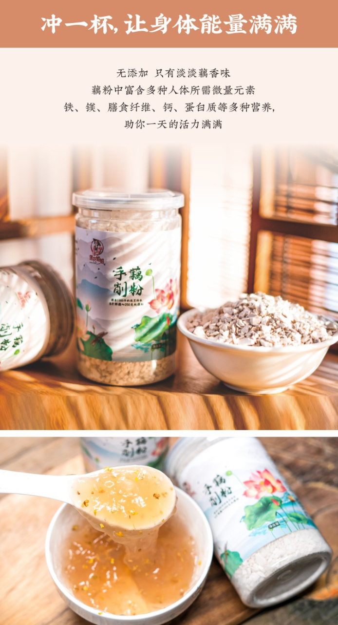 莲花姐姐家的藕粉采用优质鲜藕制作,冲调后呈半透明糊状,入口细腻顺滑。加入桂花、温润之外清香扑鼻,老少皆宜😉