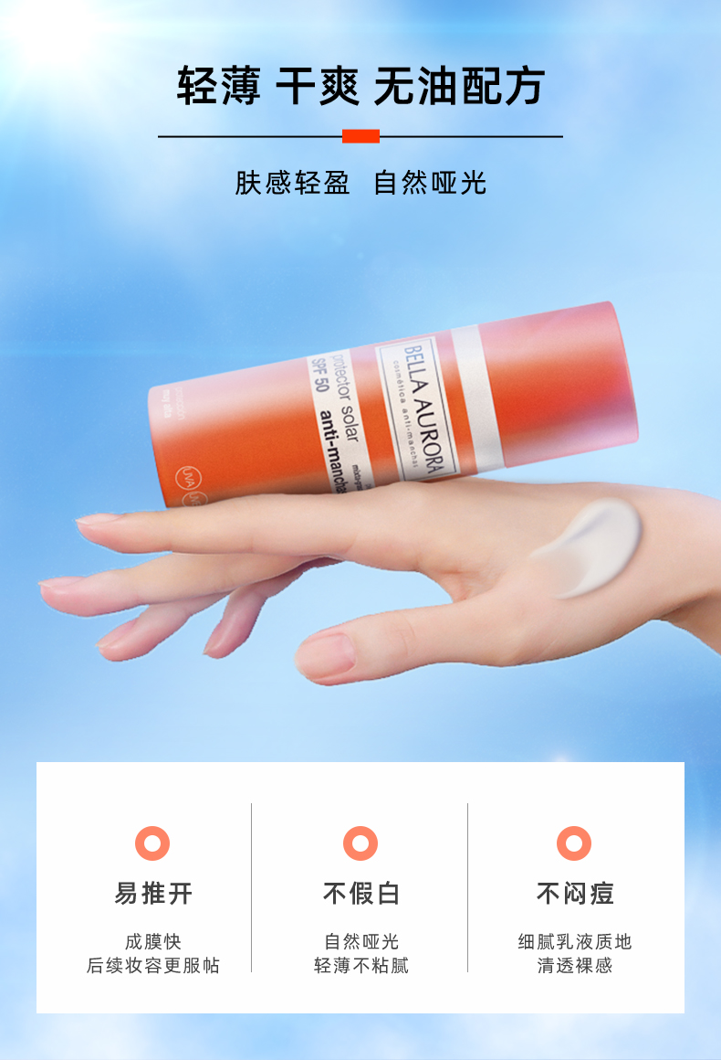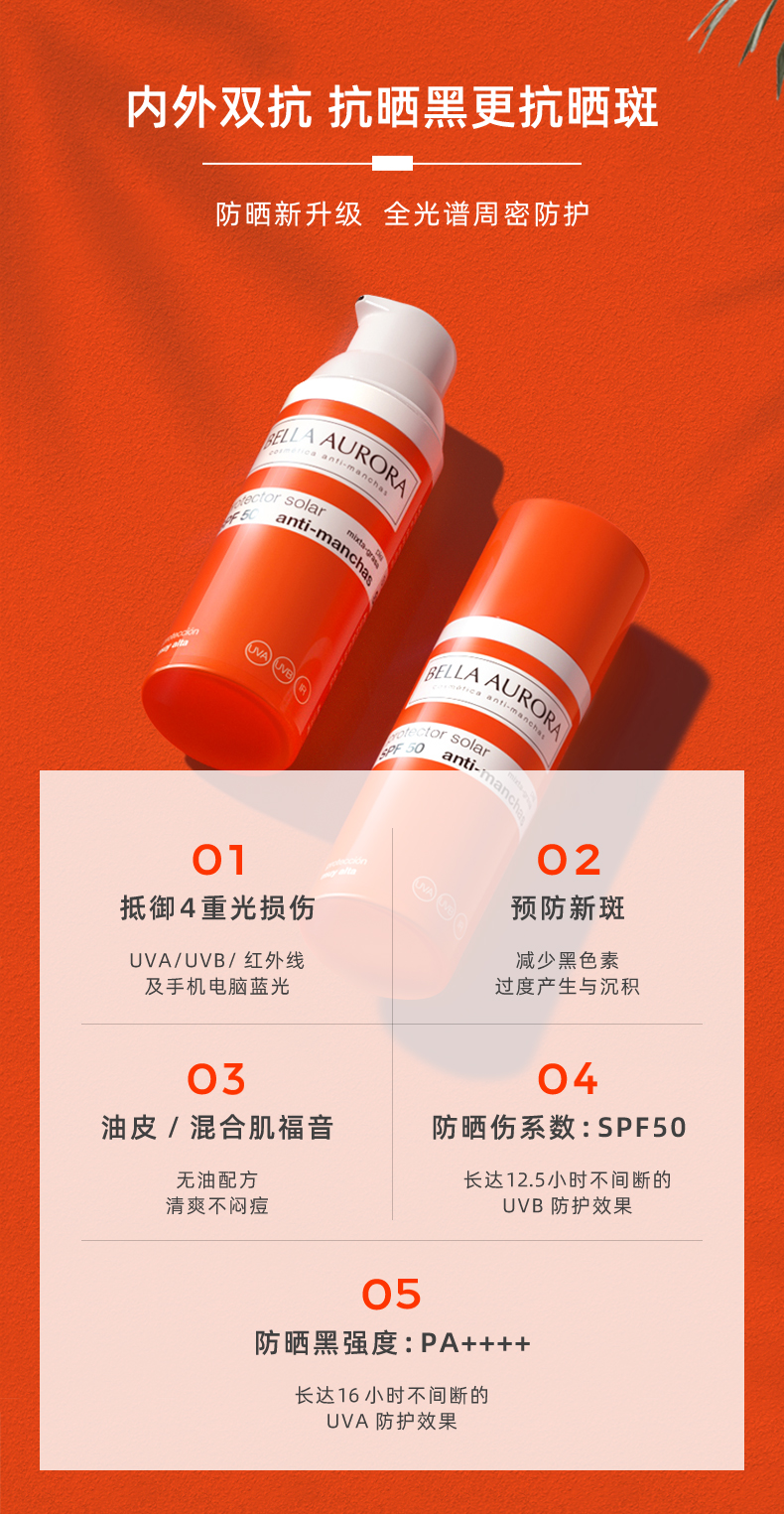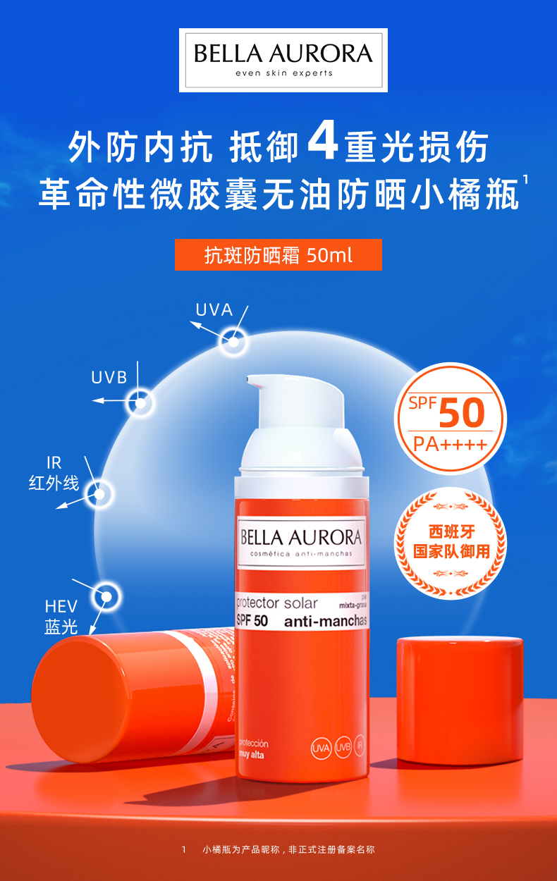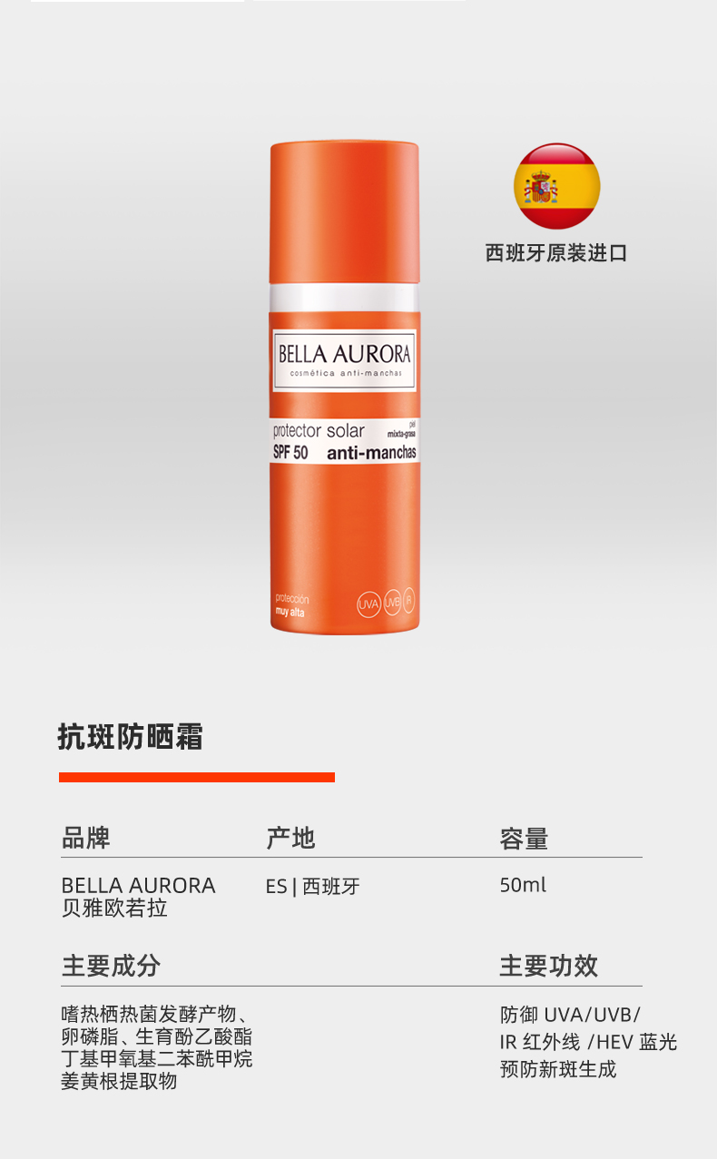【亢斑 抵御光损伤 物化结合 清爽长效】亢斑小橘瓶防晒霜50ml SPF50+ 西班牙 Bella Aurora贝雅欧若拉