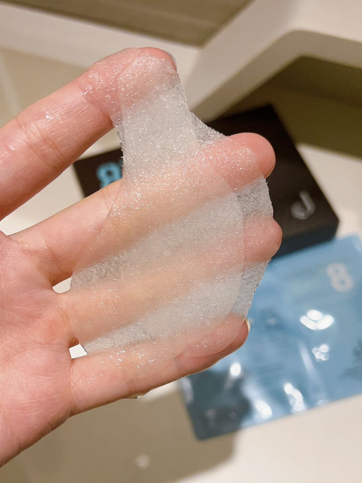 敷2-3分钟就会感受到膜布有收紧的感觉,紧密的附着在肌肤上,像绷带一样,有提拉的力量。
