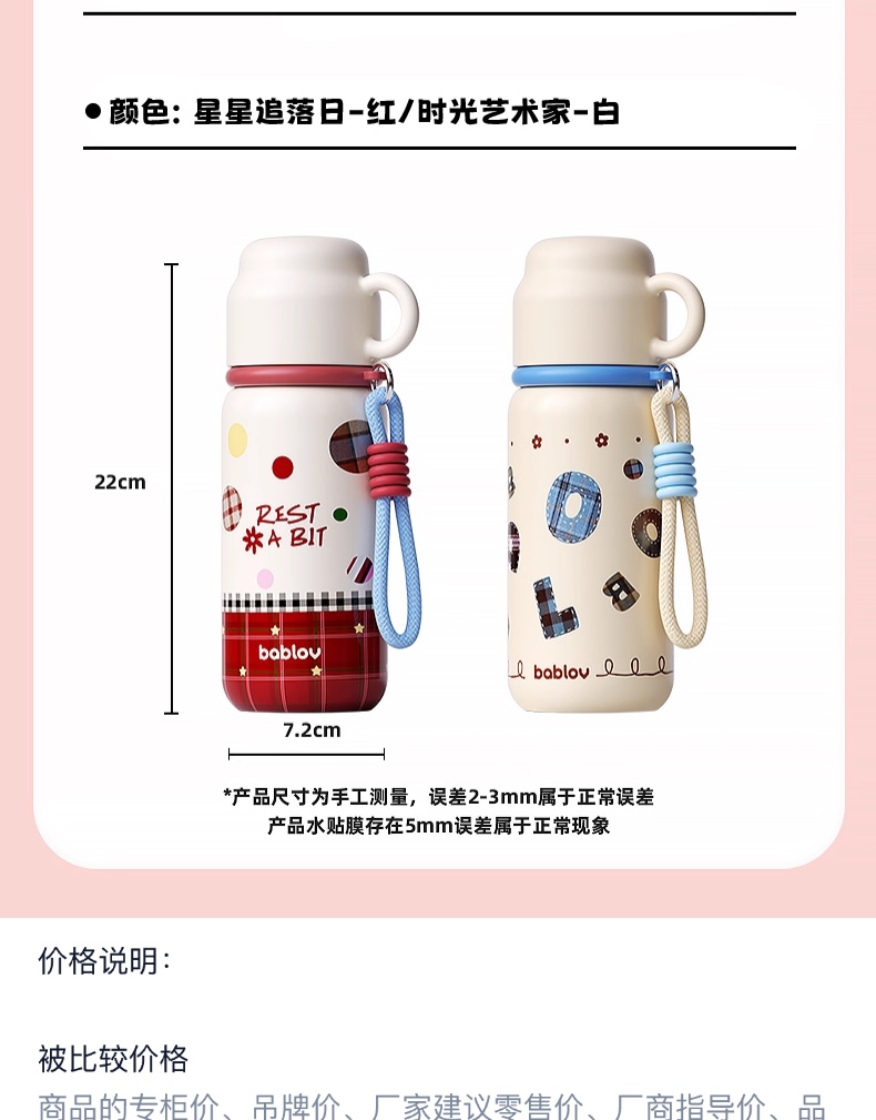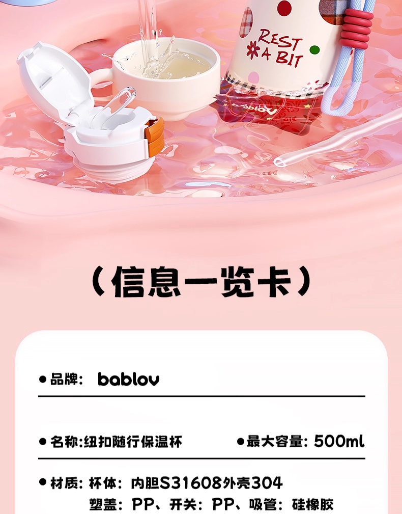 - BABLOV关注中国人的饮水健康,更不断探索未知可能性,专注于新生代自我个性表达,创造玩味新潮的产品体系。希望将水杯带入Z世代年轻人的生活,传递更多“饮”响力。