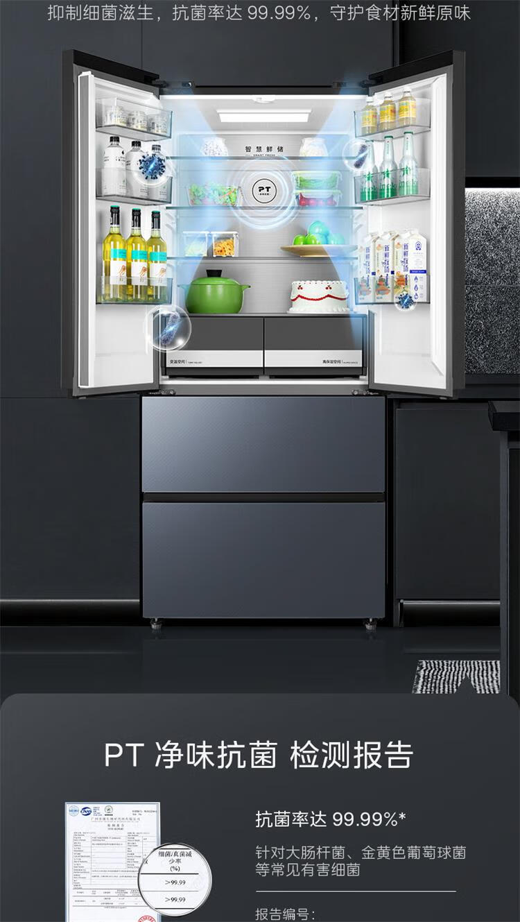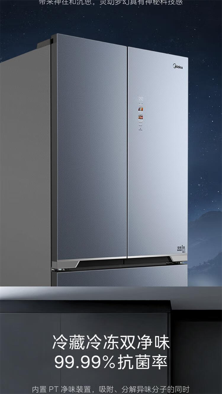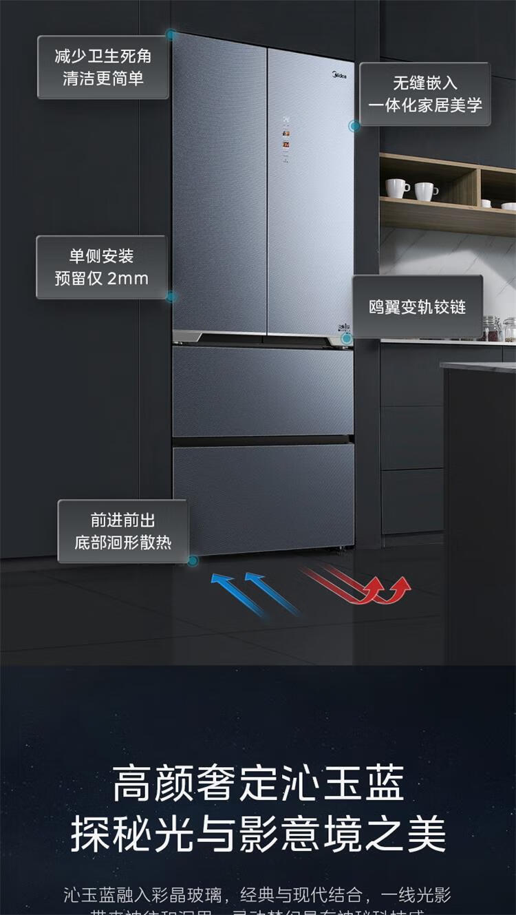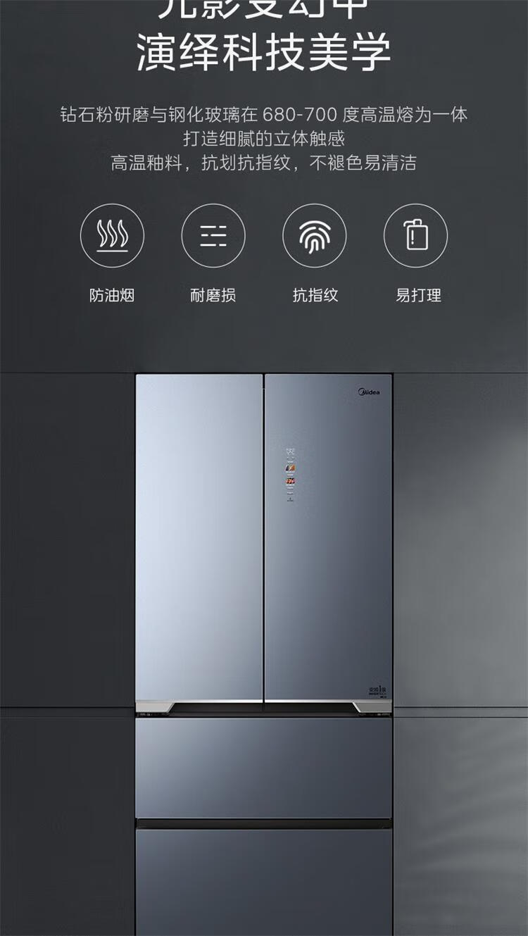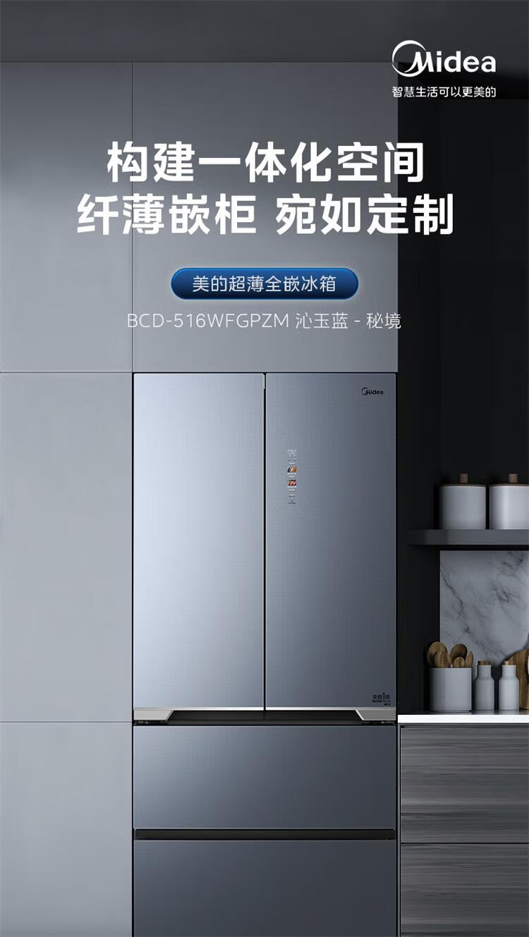 美的(Midea)516升法式四门超薄净味除菌一级能效保鲜家用电冰箱BCD-516WFGPZM沁玉蓝-秘境