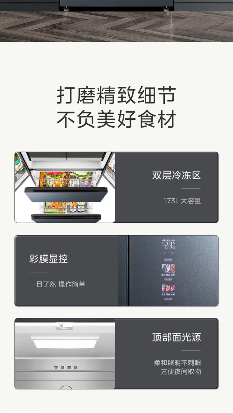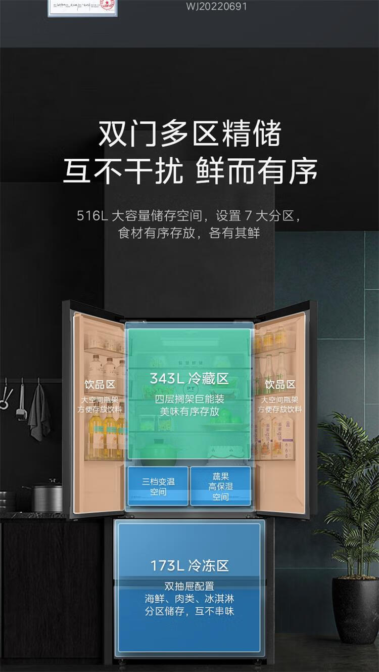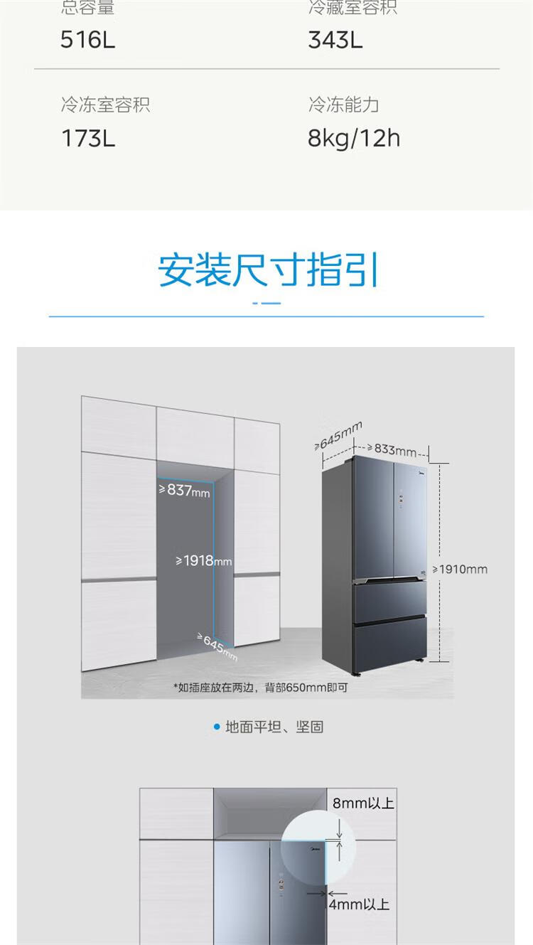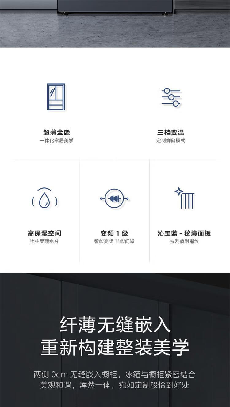 美的(Midea)516升法式四门超薄净味除菌一级能效保鲜家用电冰箱BCD-516WFGPZM沁玉蓝-秘境