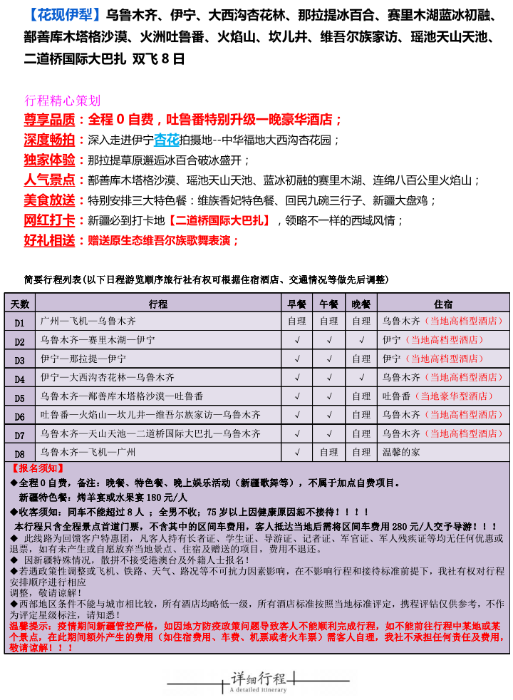 【花现伊犁】乌鲁木齐、伊宁、大西沟杏花林、那拉提冰百合、赛里木湖蓝冰初融、鄯善库木塔格沙漠、火洲吐鲁番、火焰山、坎儿井、维吾尔族家访、瑶池天山天池、二道桥国际大巴扎 双飞8日