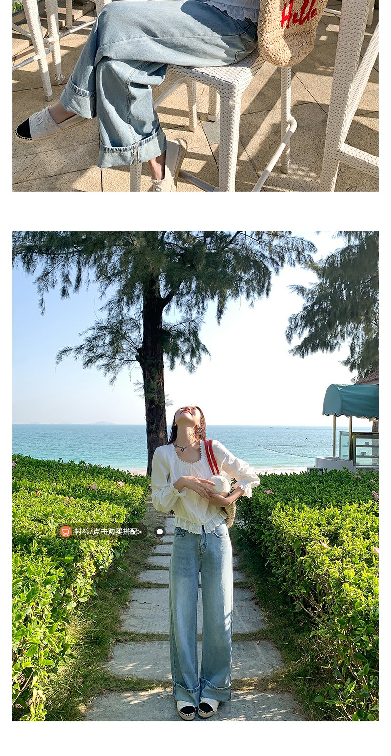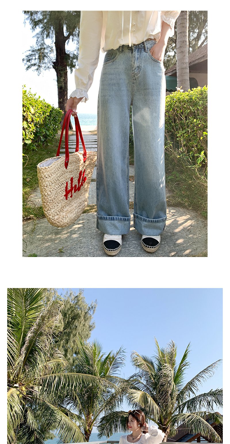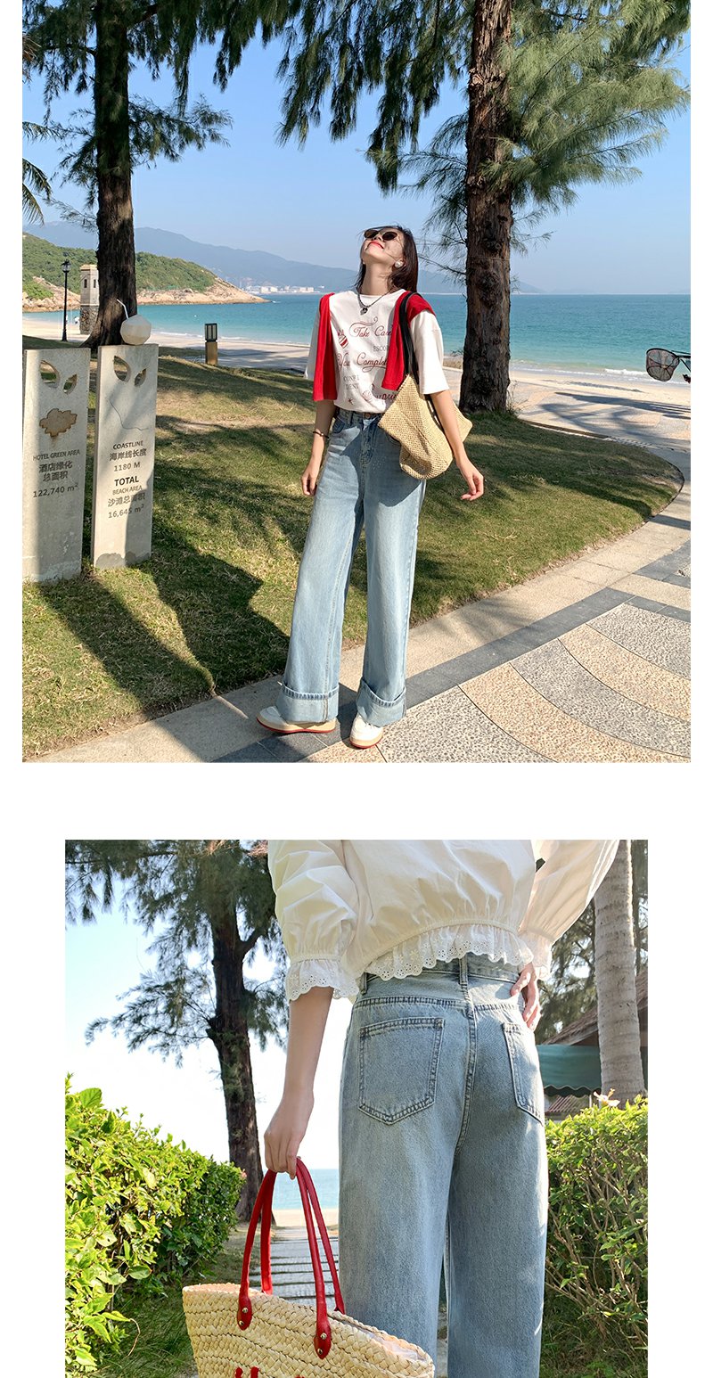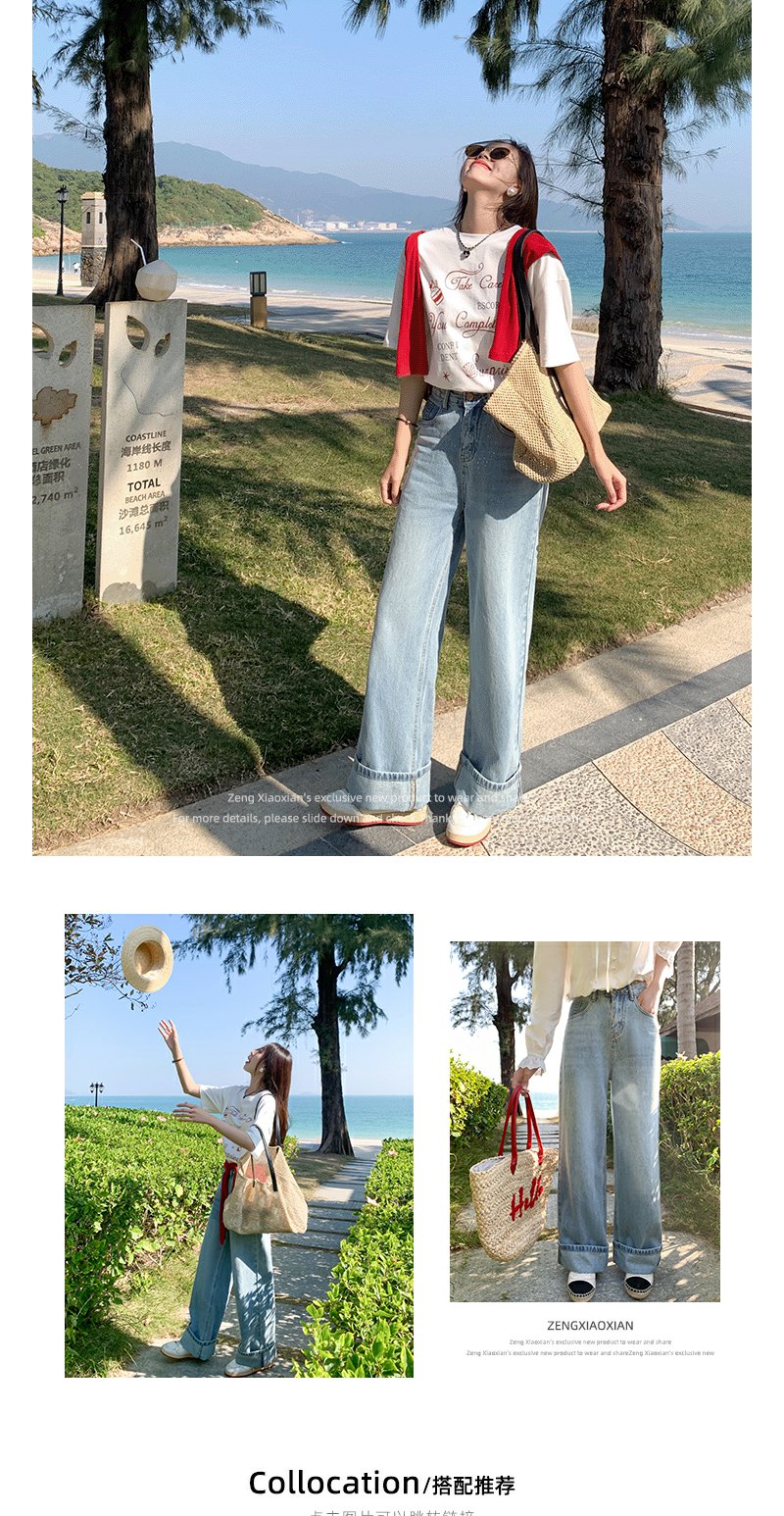 <曾小咸推荐>慵懒显瘦兰裤脚翻边高腰牛仔裤