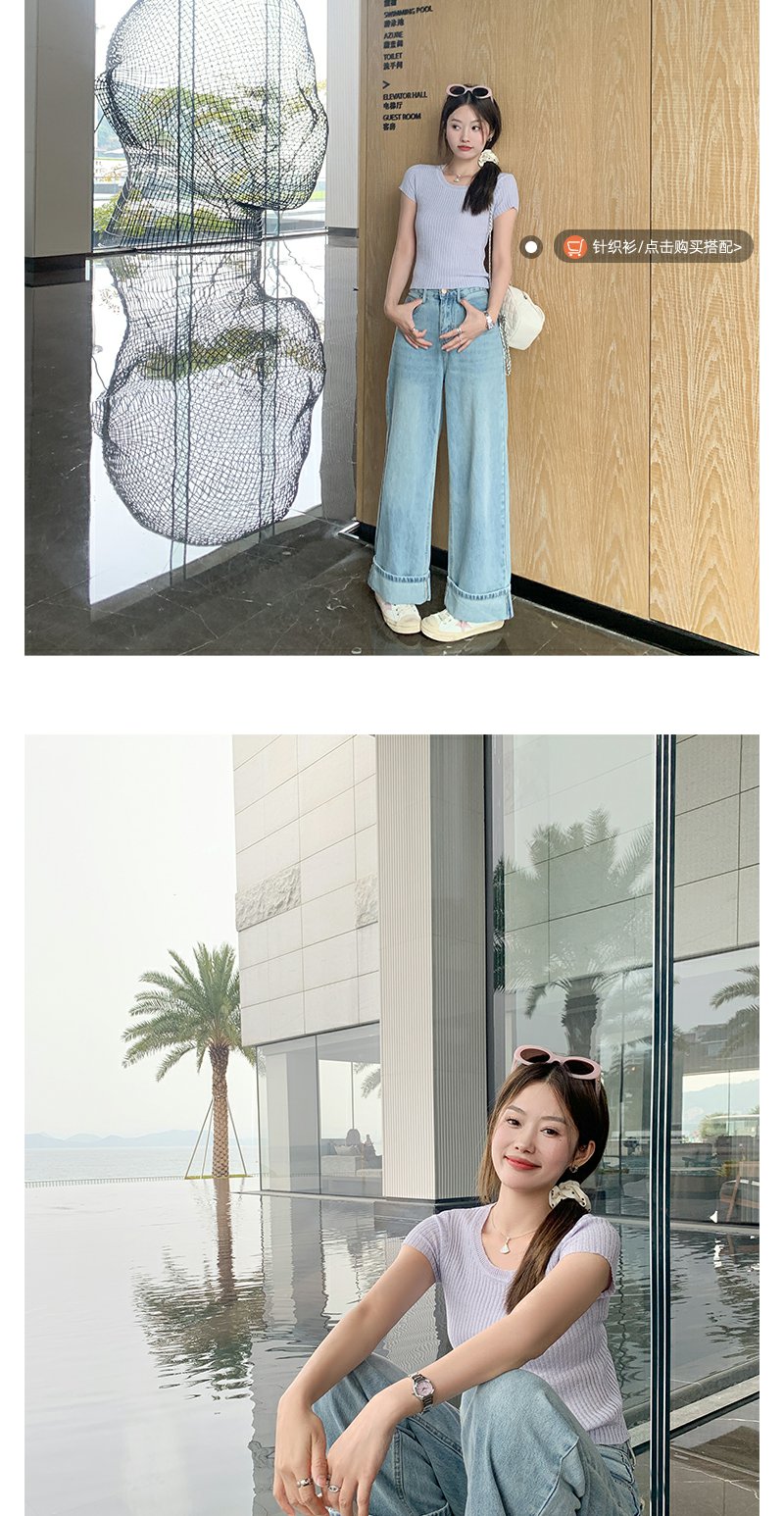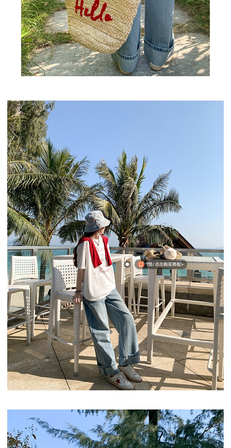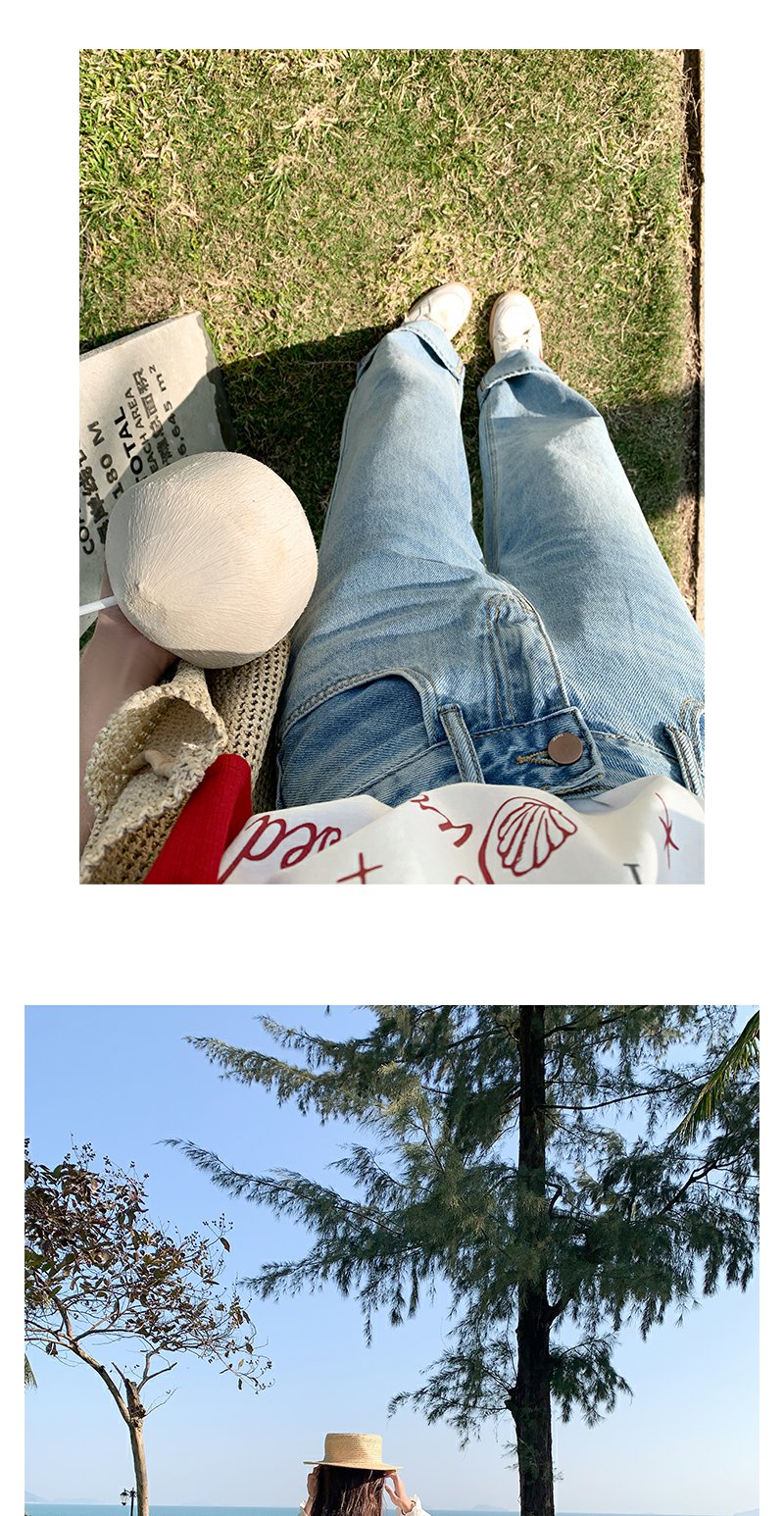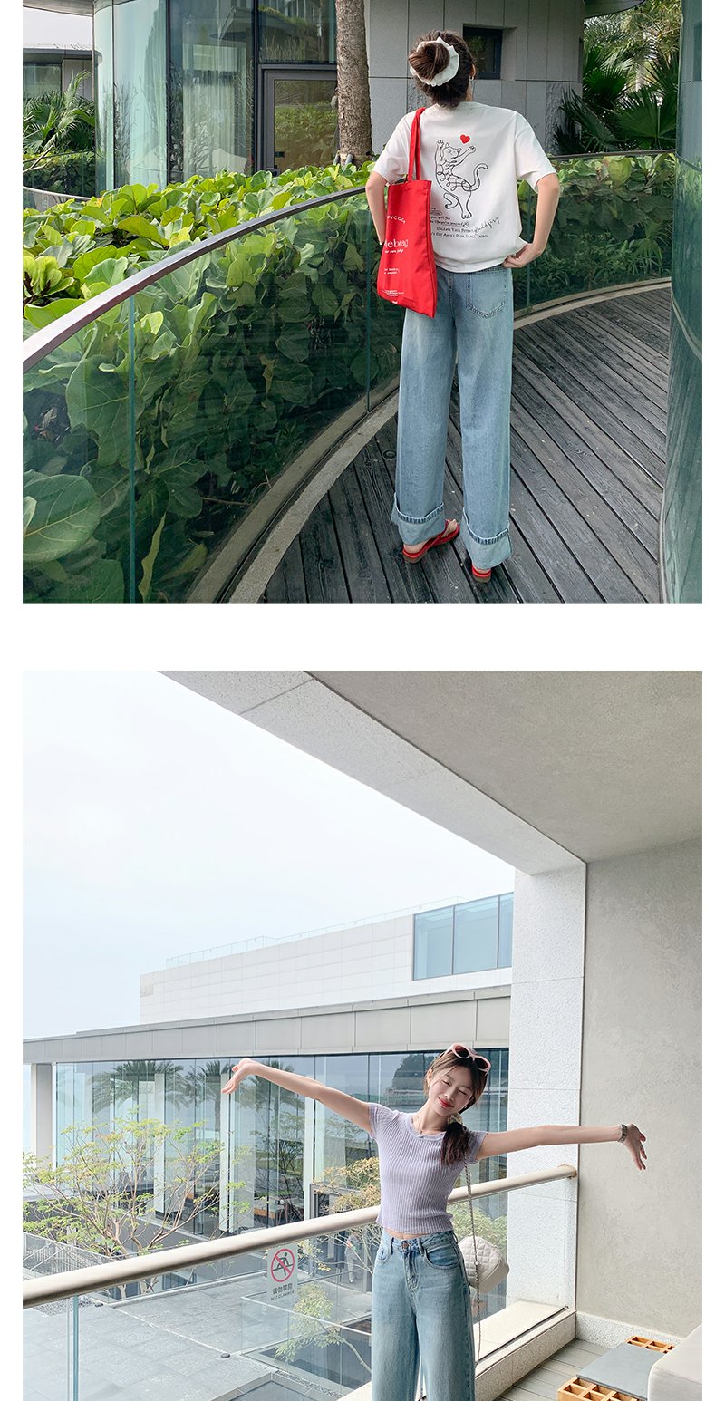 <曾小咸推荐>慵懒显瘦兰裤脚翻边高腰牛仔裤