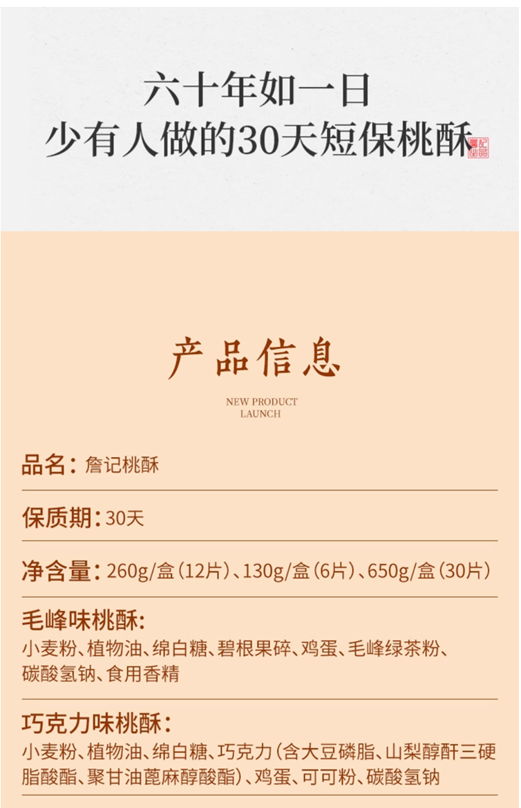 詹记 巧克力/毛峰/原味/红茶味桃酥260g 12片