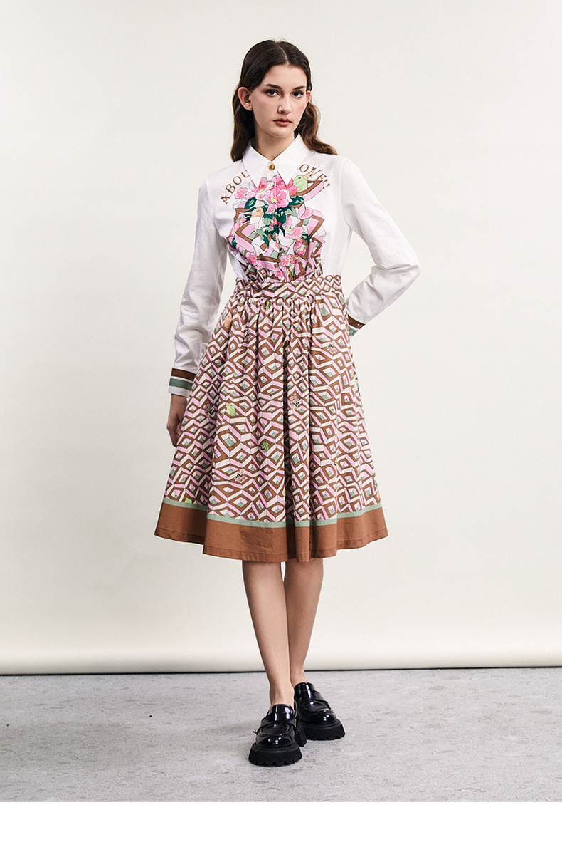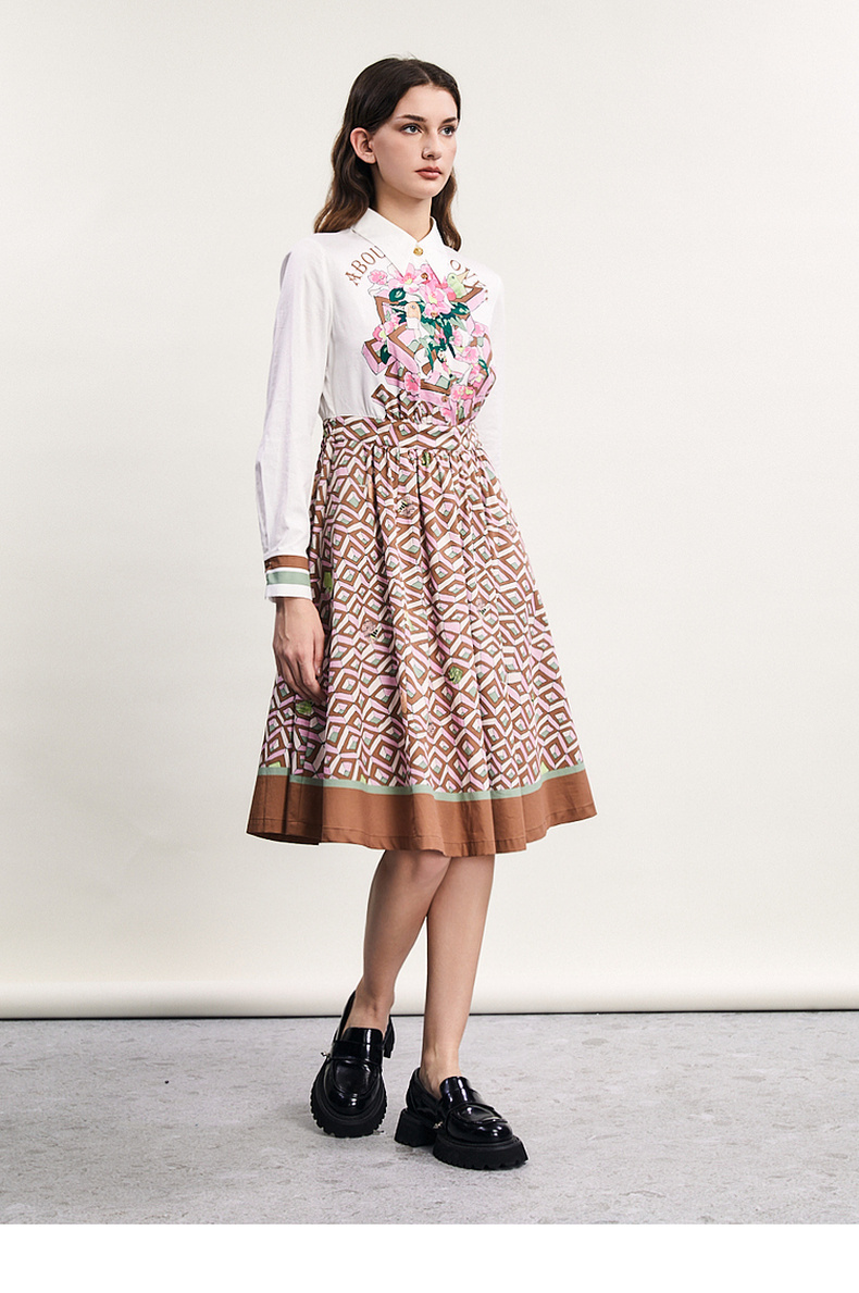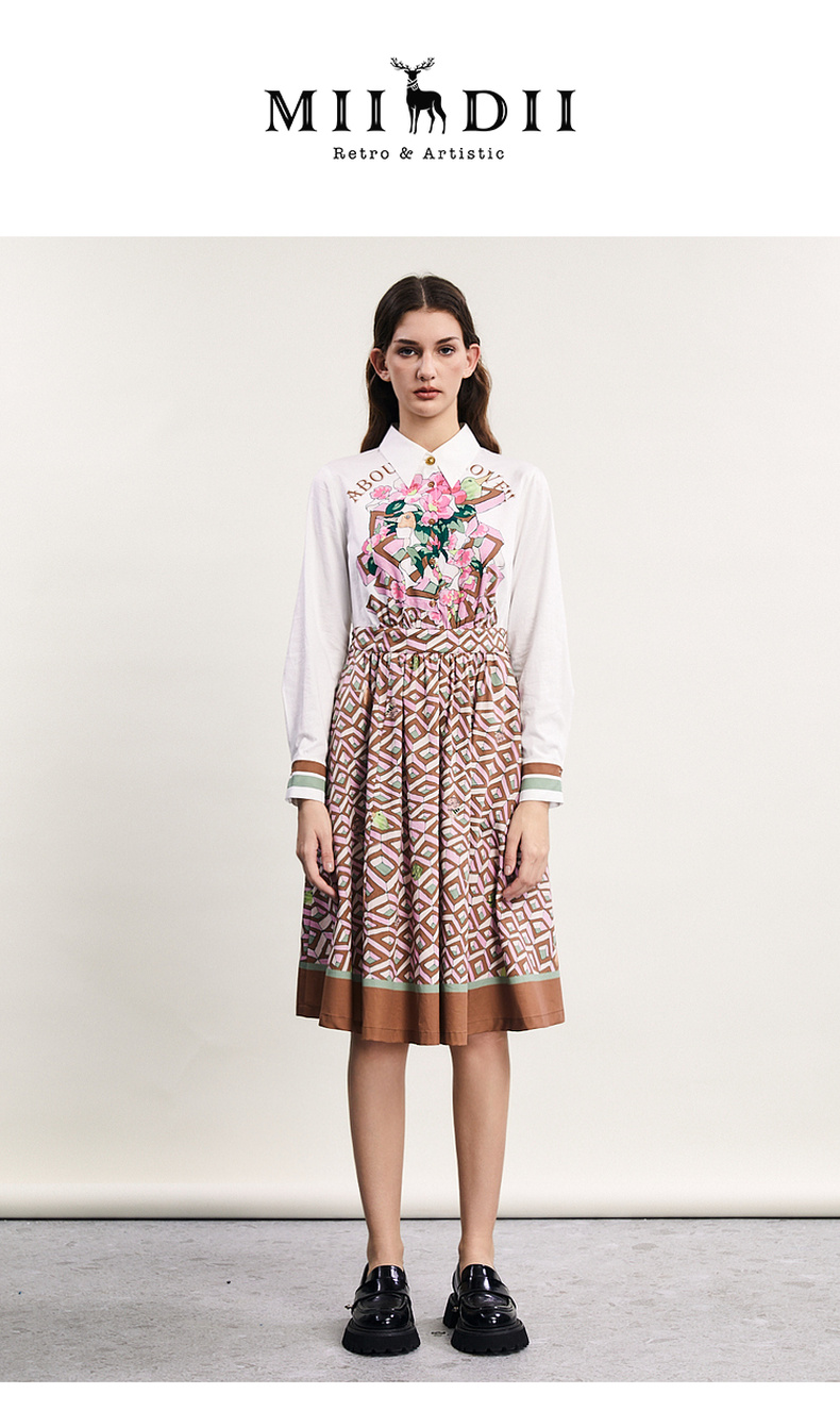 谜底衬衫式连衣裙长袖2024春新款复古印花中长款大摆裙241ML0091