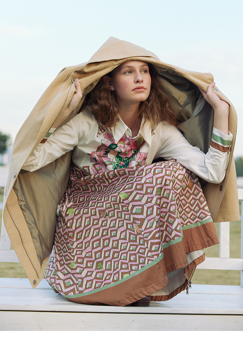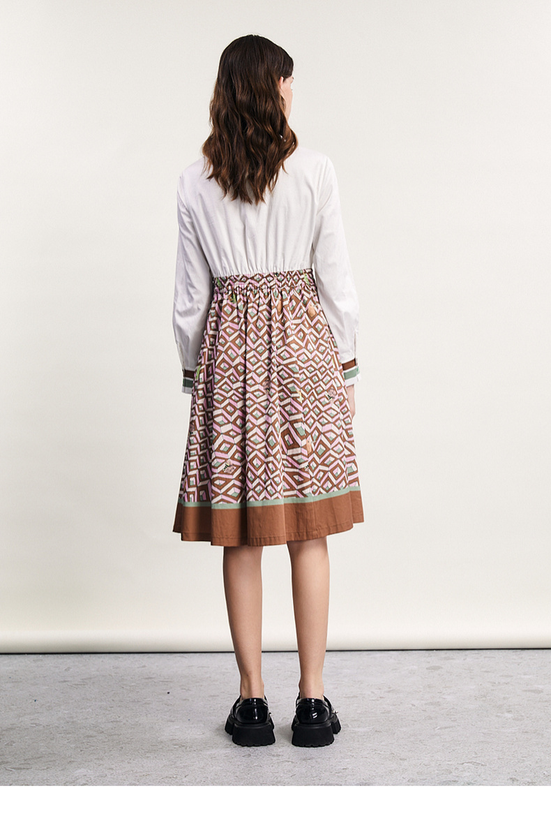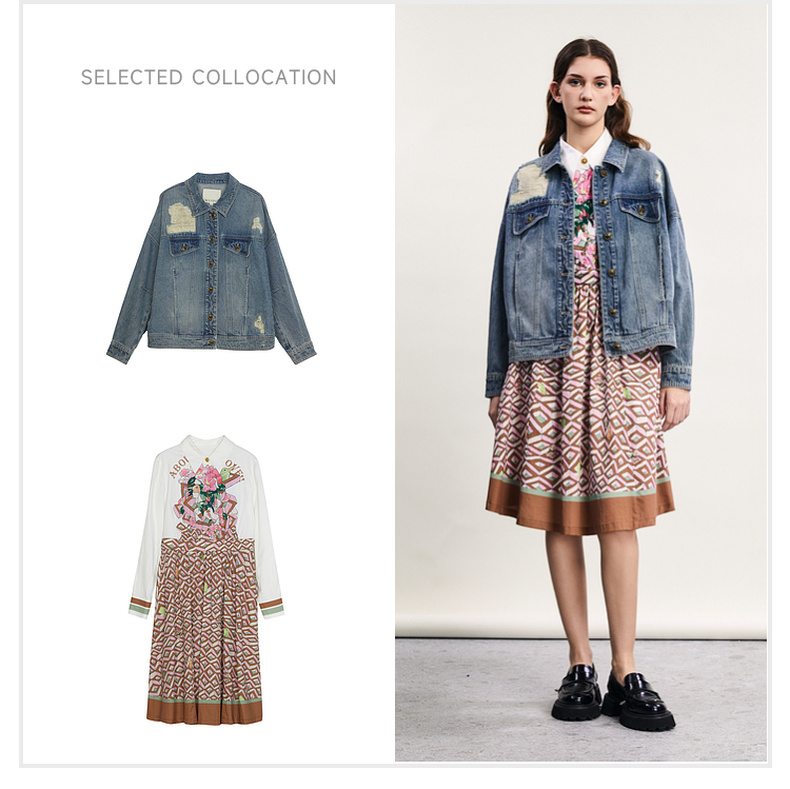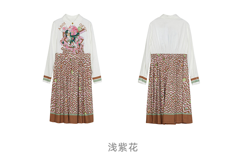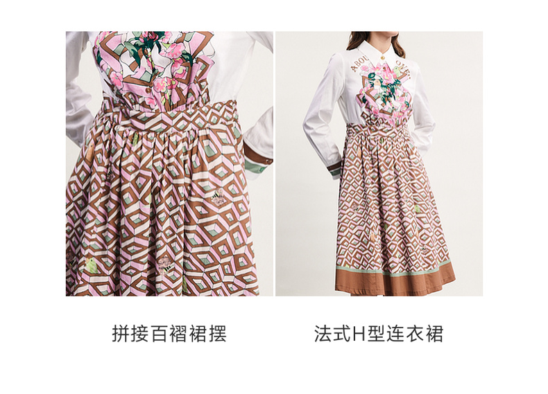 谜底衬衫式连衣裙长袖2024春新款复古印花中长款大摆裙241ML0091