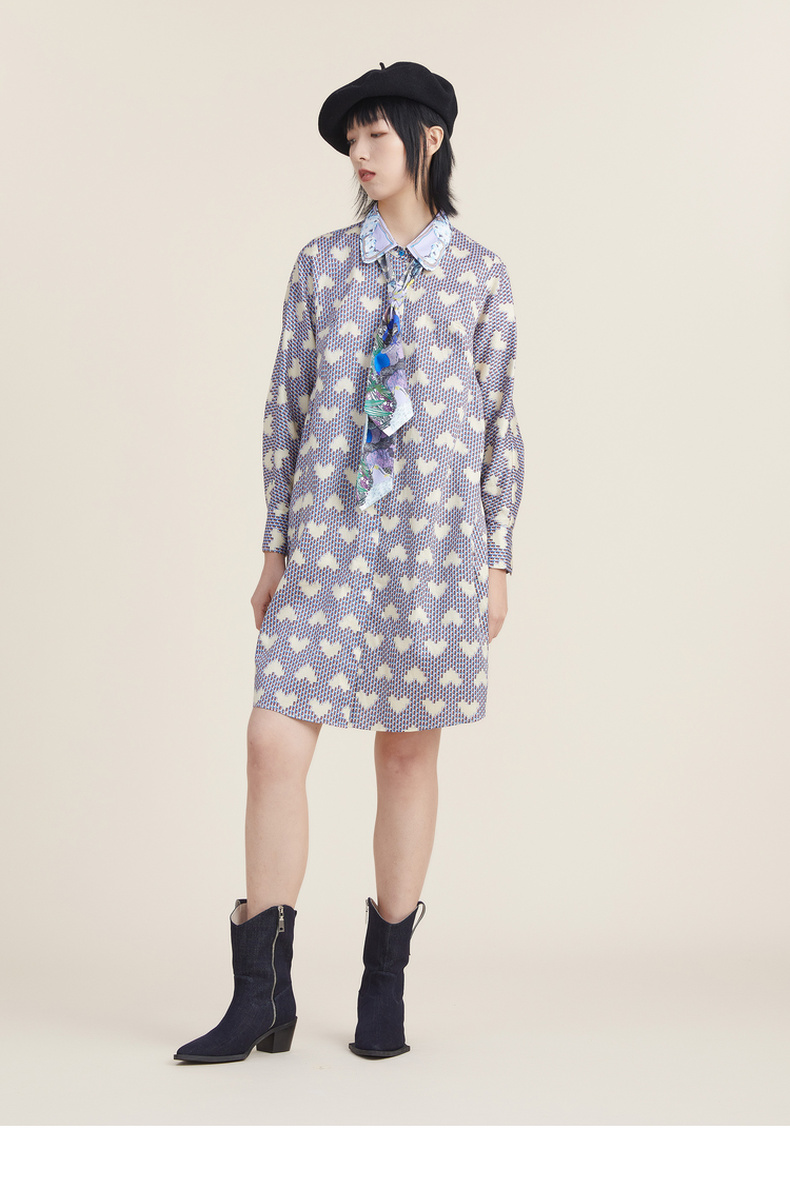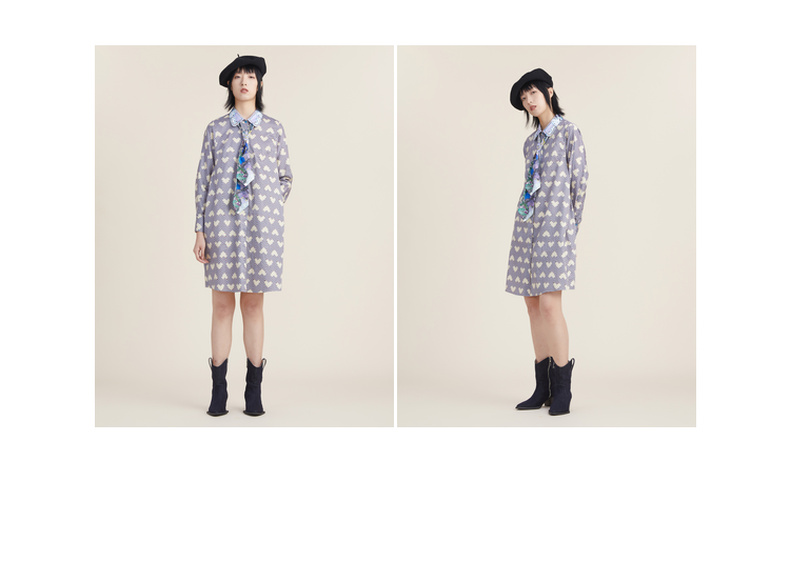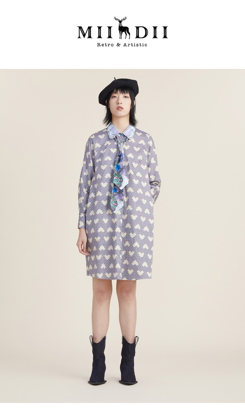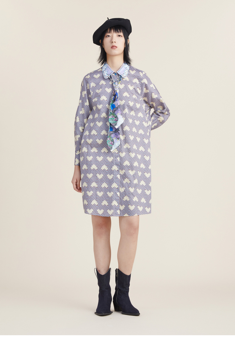 谜底纯棉衬衫连衣裙2022秋款领带设计爱心印花H型中长裙223ML1112