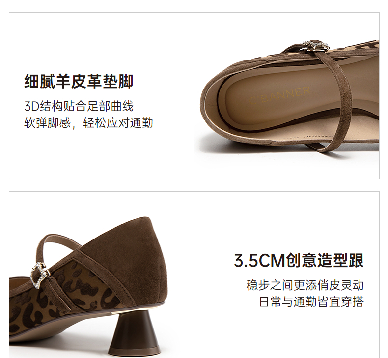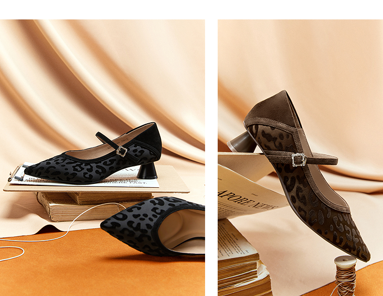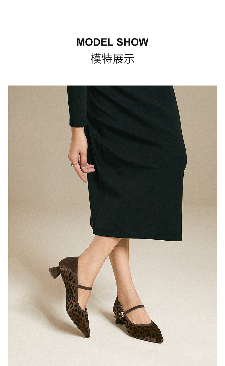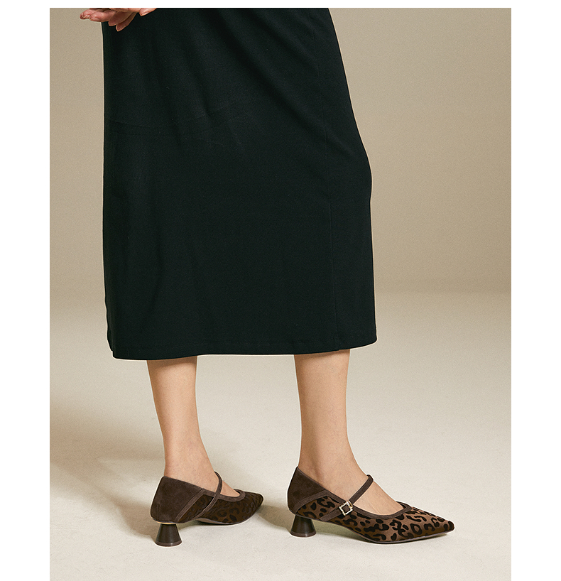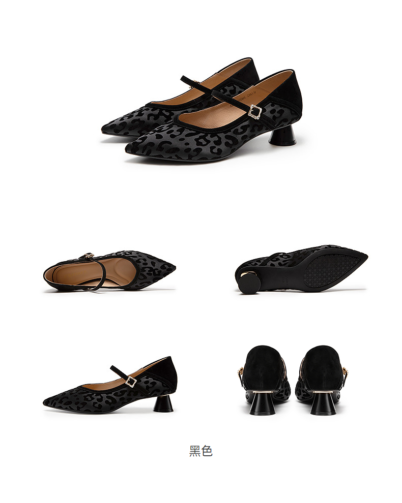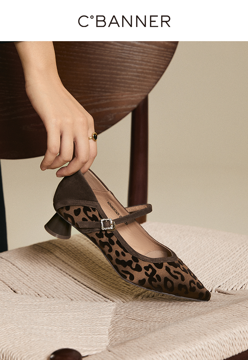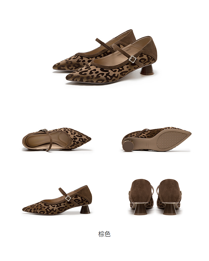 千百度豹纹中跟玛丽珍鞋女尖头轻奢高级感浅口单鞋A25406053