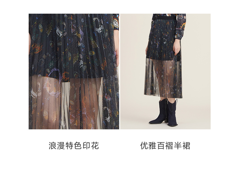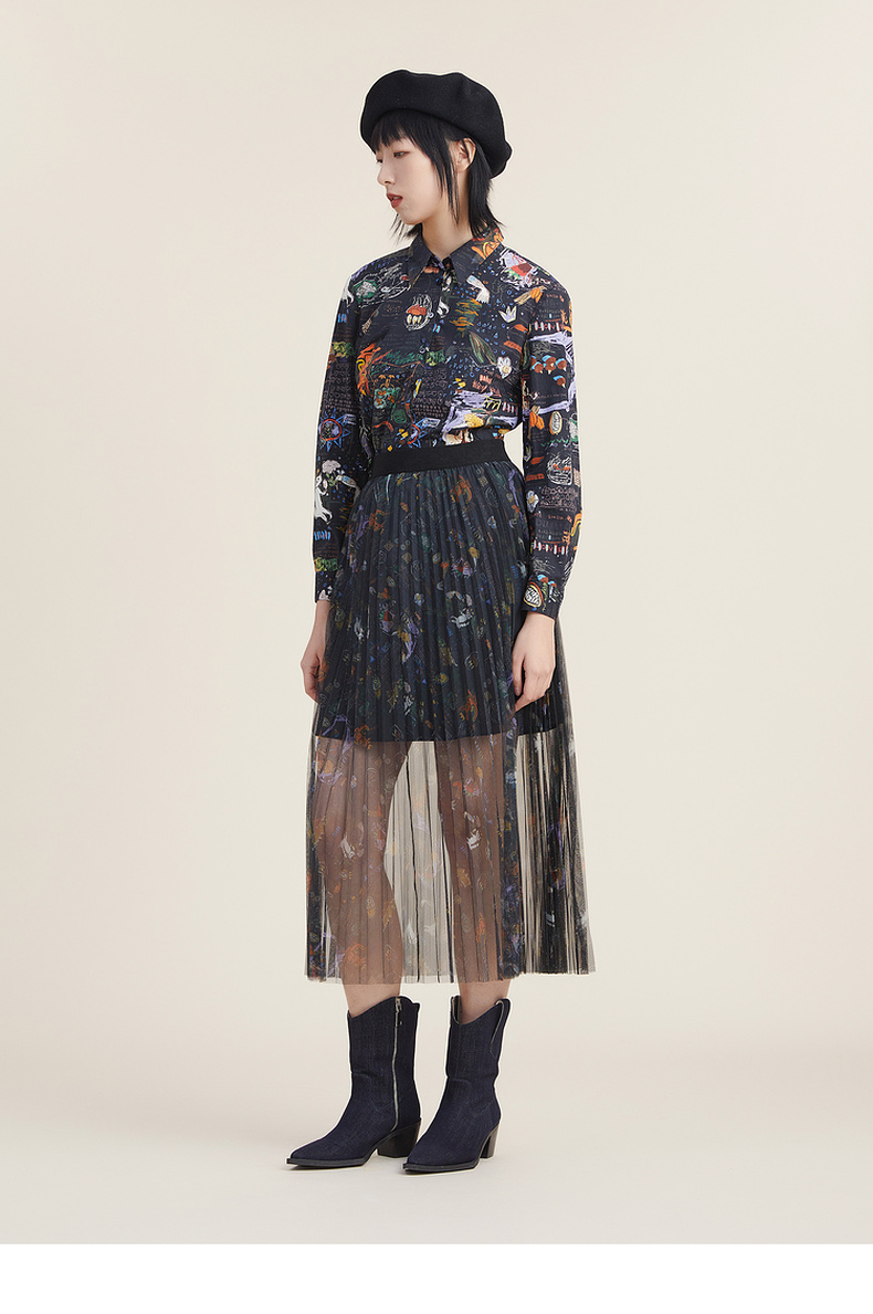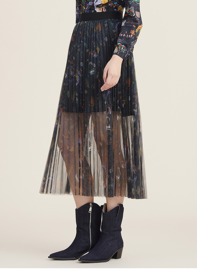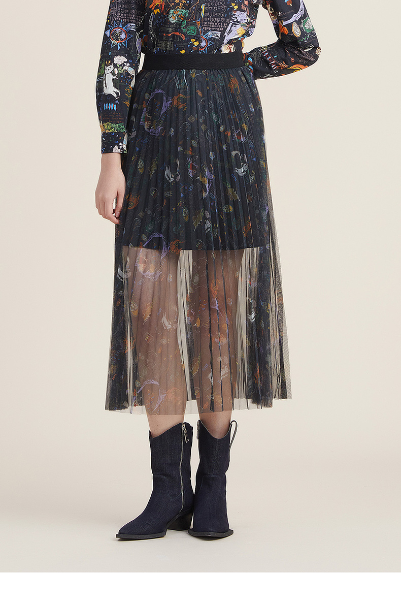 谜底2022秋新款复古印花网纱裙A型百搭百褶设计半身裙女223MB1040