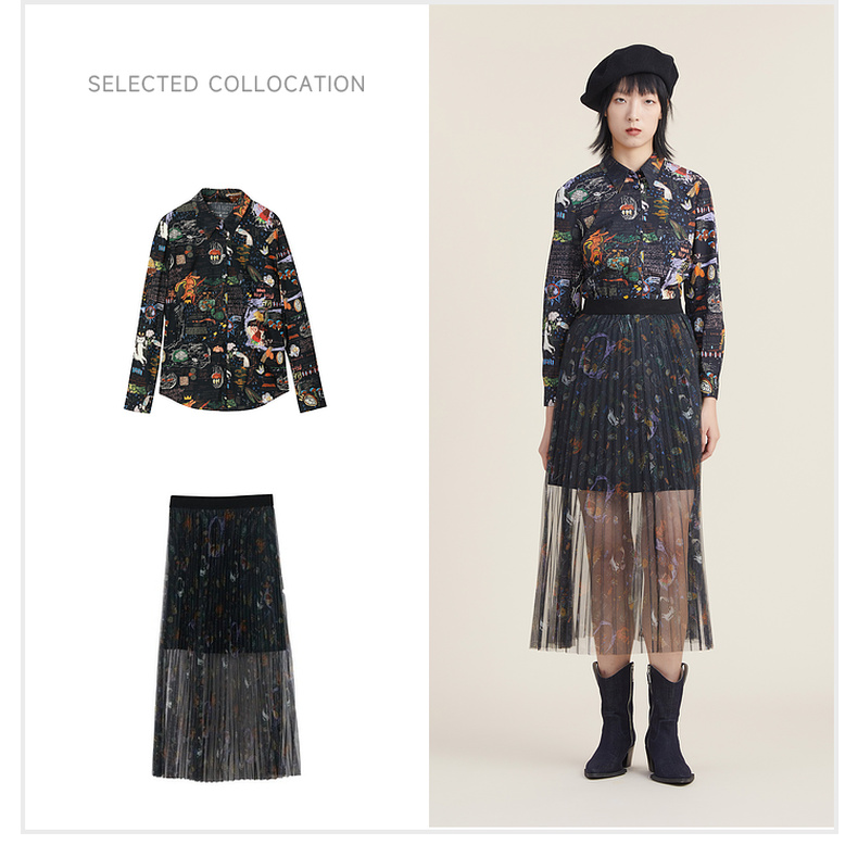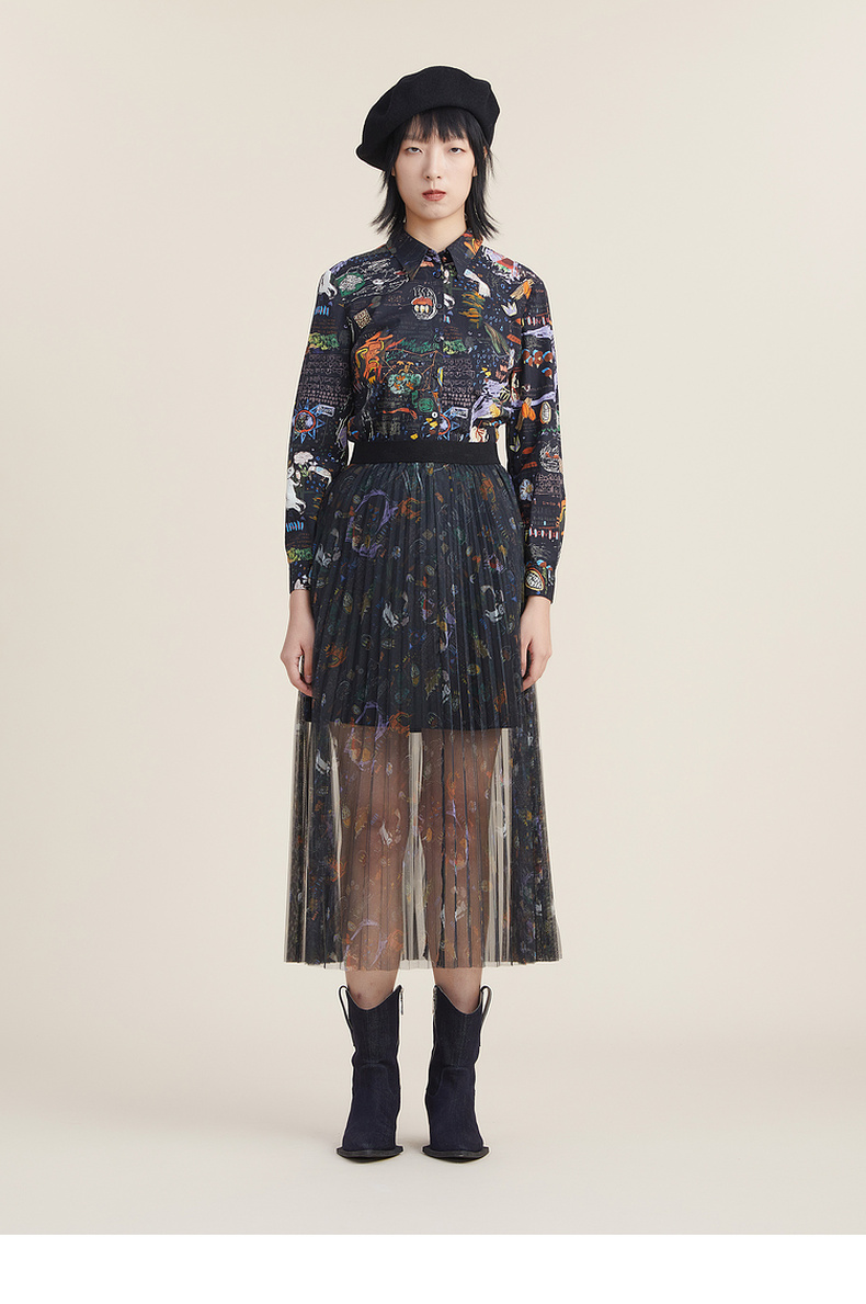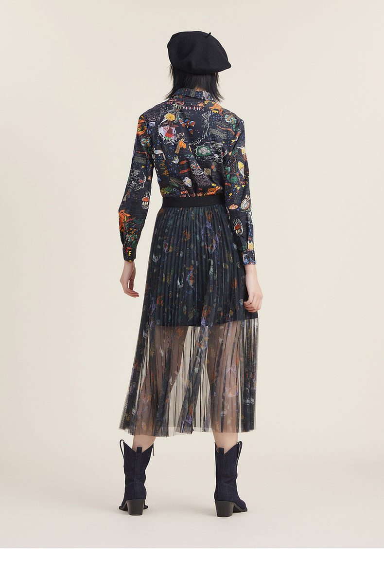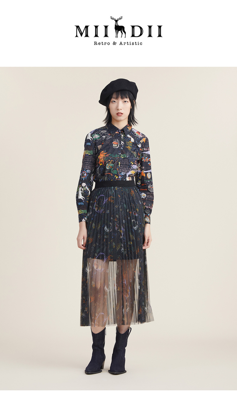 谜底2022秋新款复古印花网纱裙A型百搭百褶设计半身裙女223MB1040