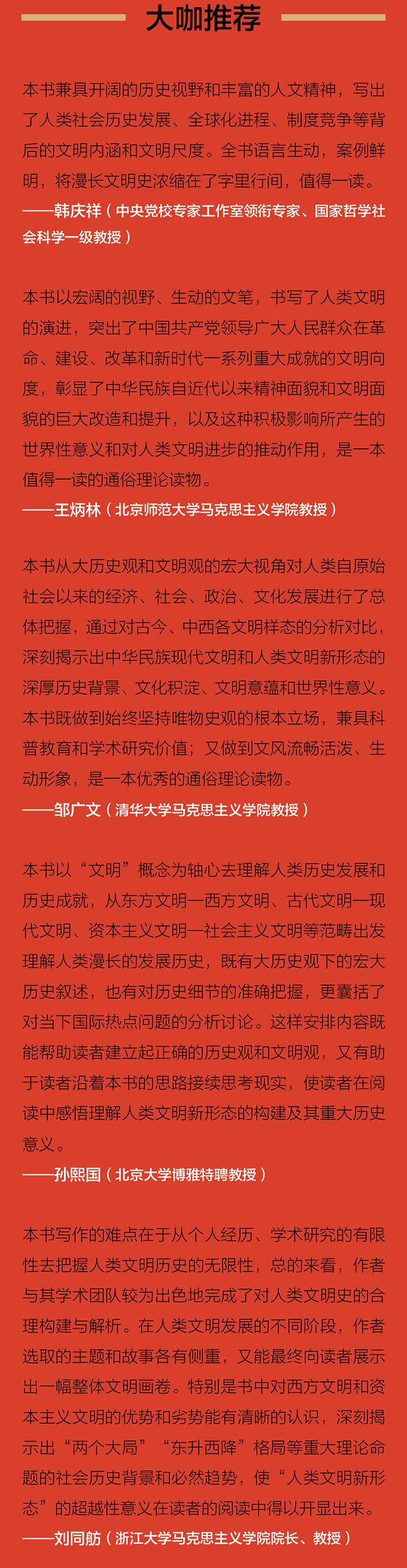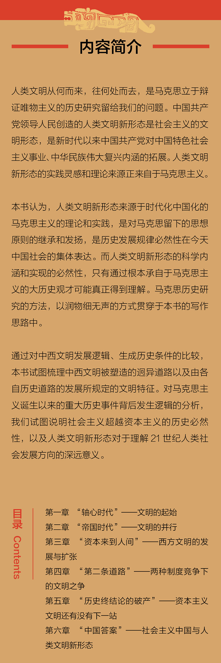 本书认为,人类文明新形态来源于时代化中国化的马克思主义的理论和实践,是对马克思留下的思想原则的继承和发扬,是历史发展规律必然性在今天中国社会的集体表达。而人类文明新形态的科学内涵和实现的必然性,只有通过根本承自于马克思主义的大历史观才可能真正得到理解。马克思历史研究的方法,以润物细无声的方式贯穿于本书的写作思路中。
