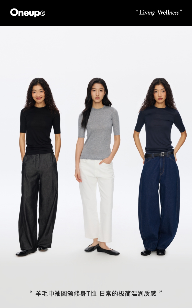 Oneup羊毛中袖圆领修身T恤