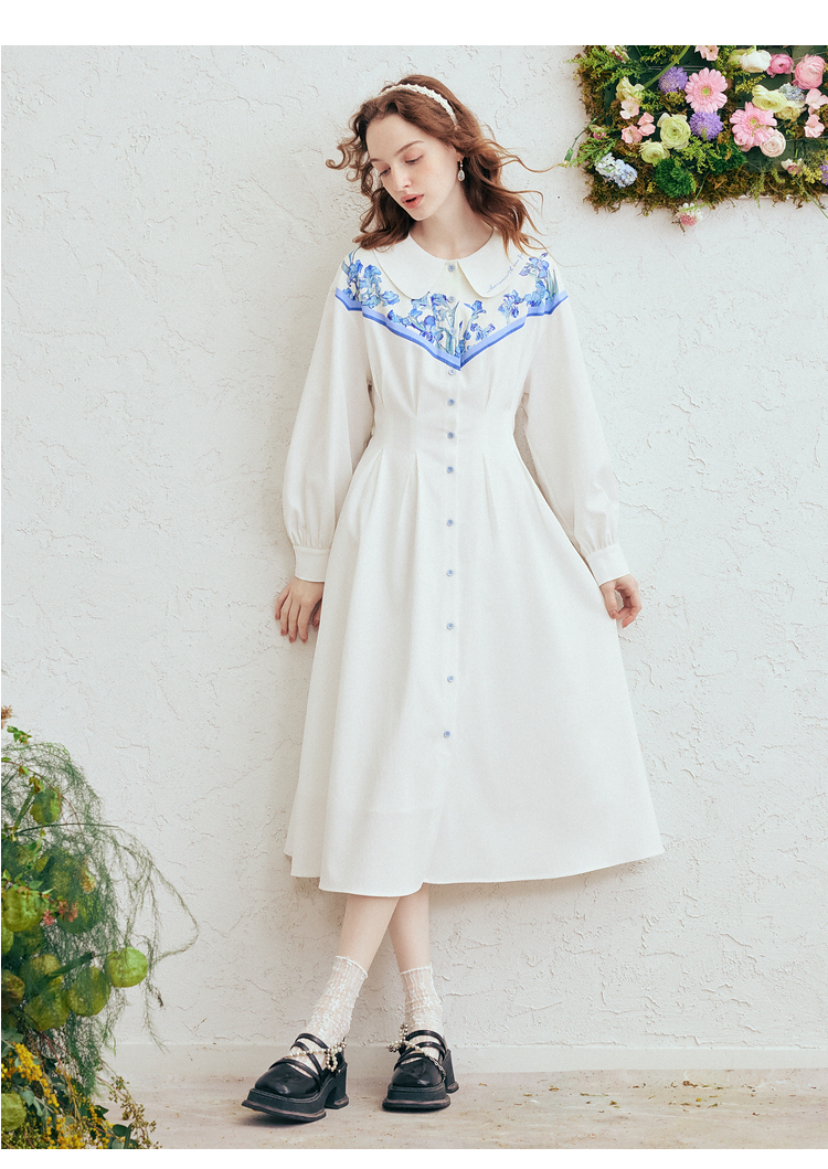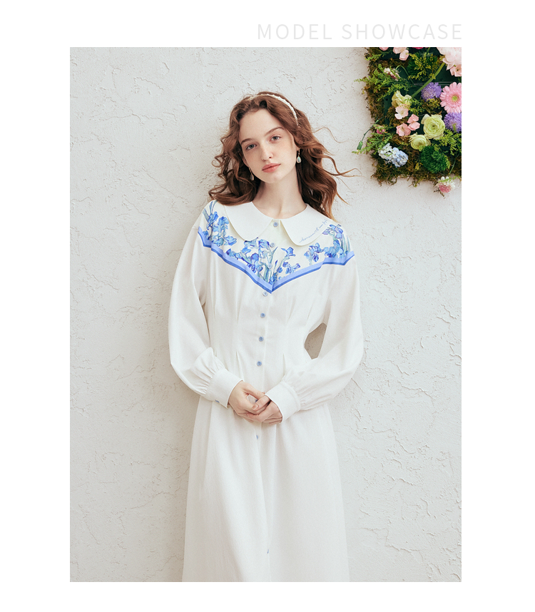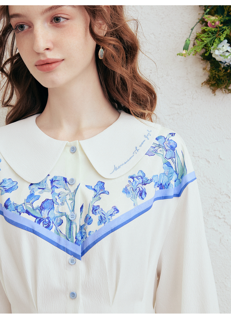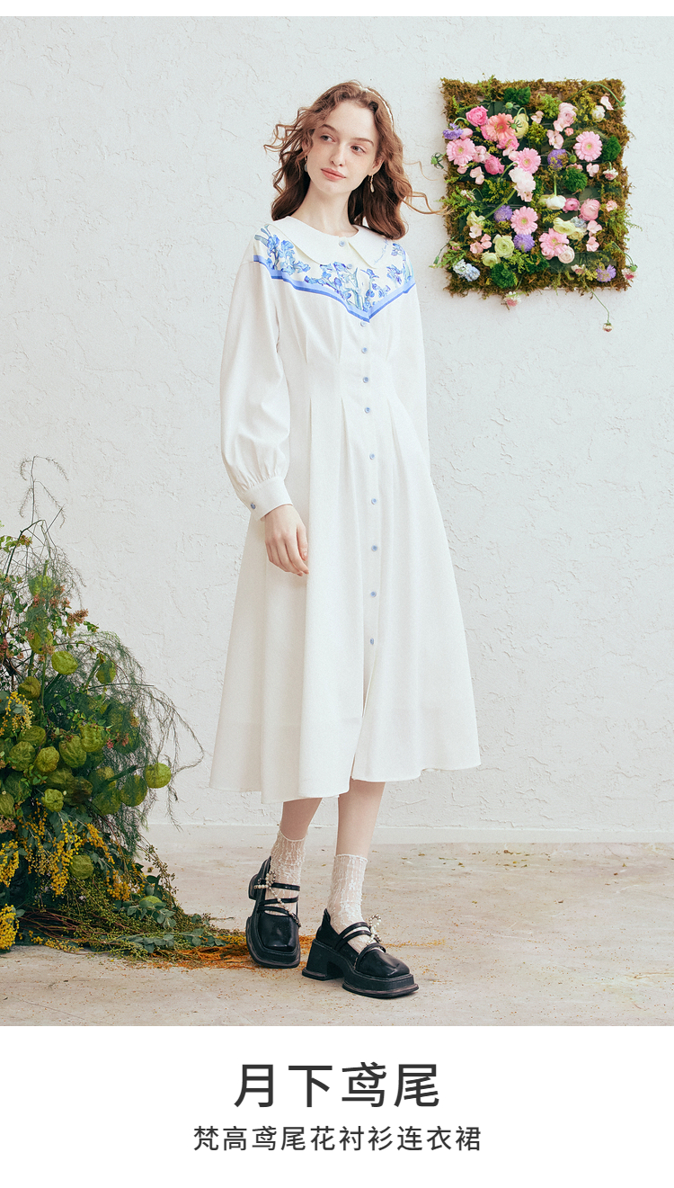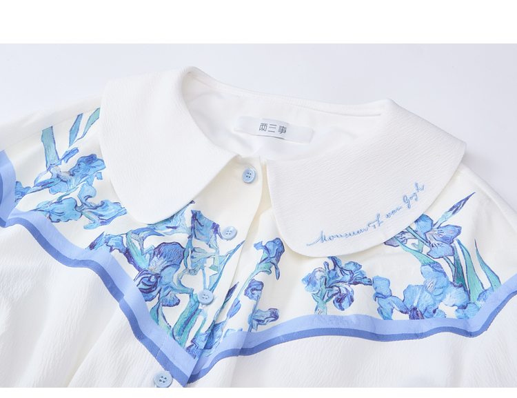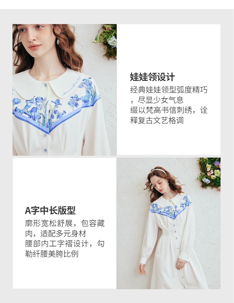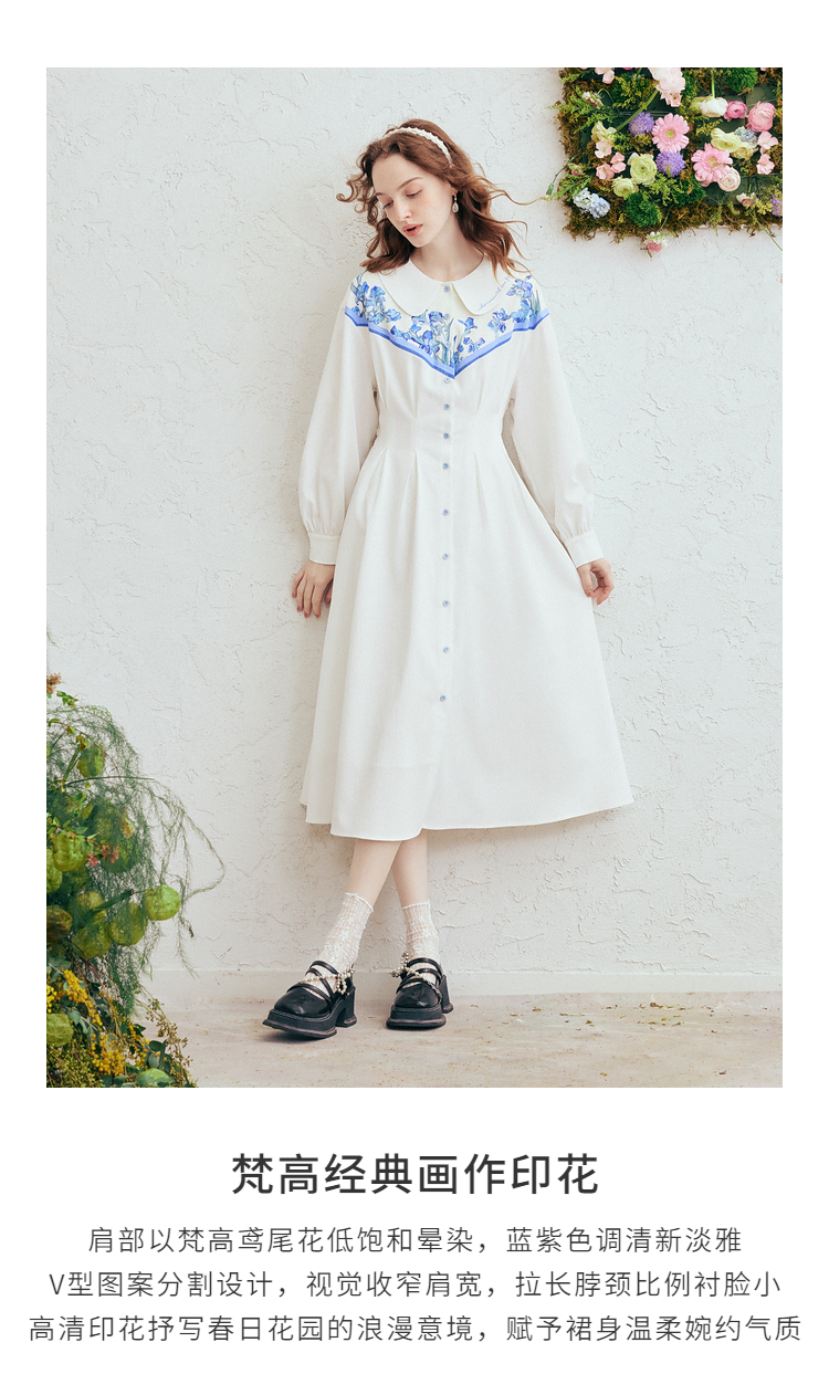 两三事梵高文艺月下鸢尾2026春季新款复古刺绣翻领印花a字连衣裙