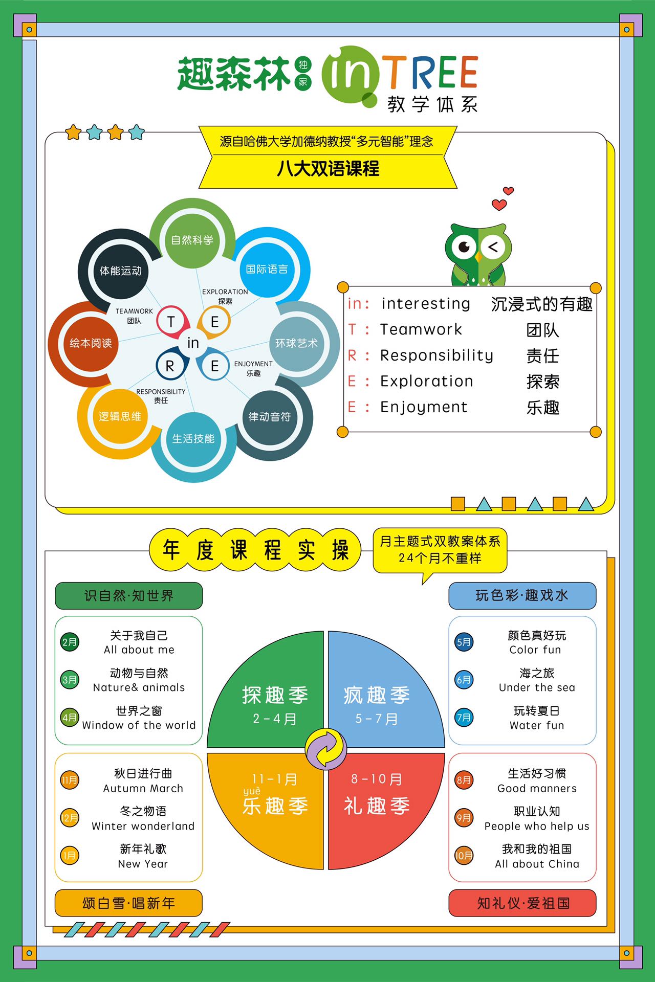 年度课程实操,一年分为,探趣季(2-4月),疯趣季(5-7月),礼趣季(8-10月),乐趣季(11-1月),内容充足,活动丰富,体验多多,月主题式的双教案体系,24个月不重样