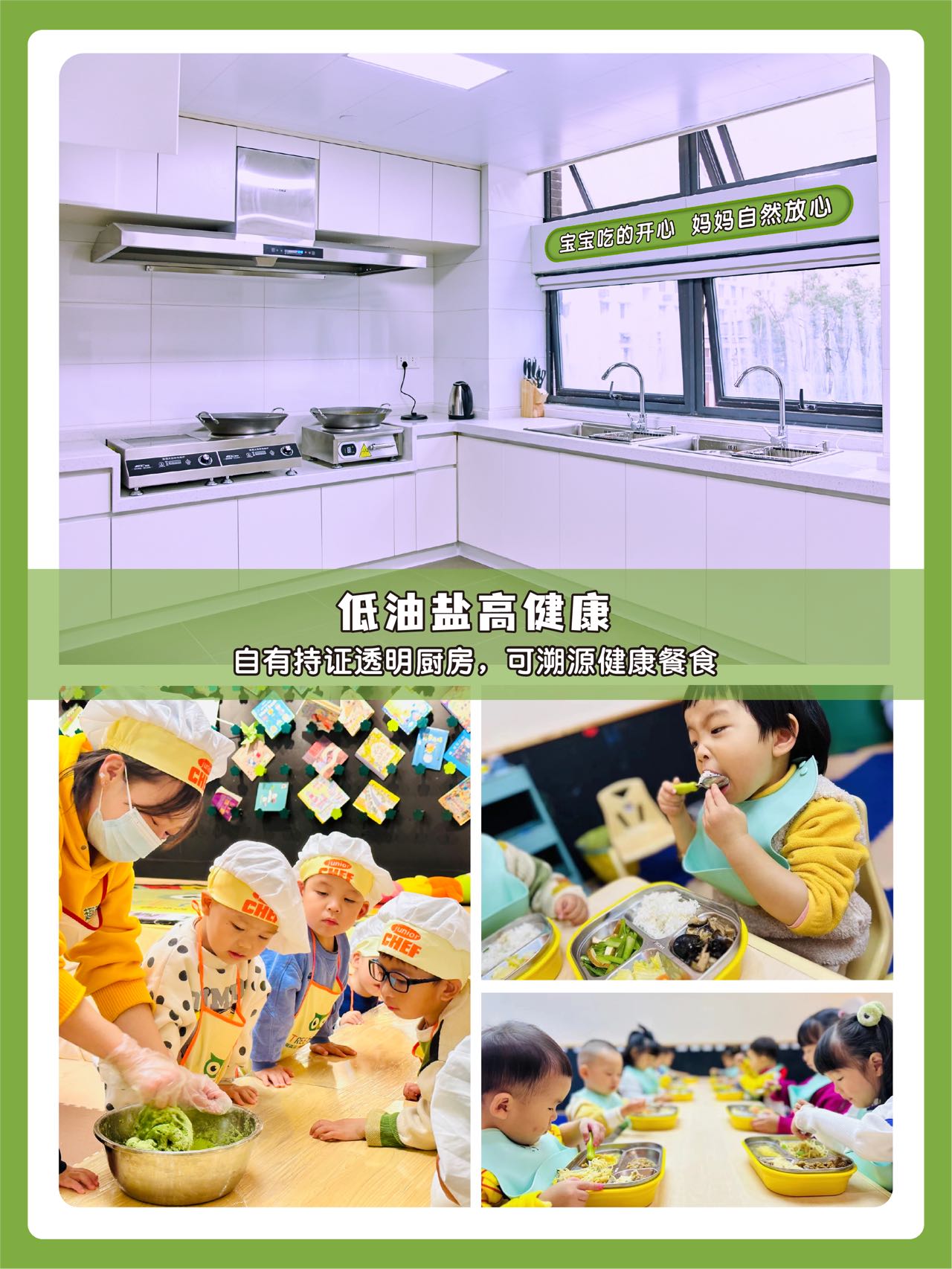 1️⃣吃的好:拥有独立持证厨房,严格筛选食材,根据宝宝们营养需求定制专业食谱,保证低油盐,高健康,宝宝吃的开心,妈妈自然放心!