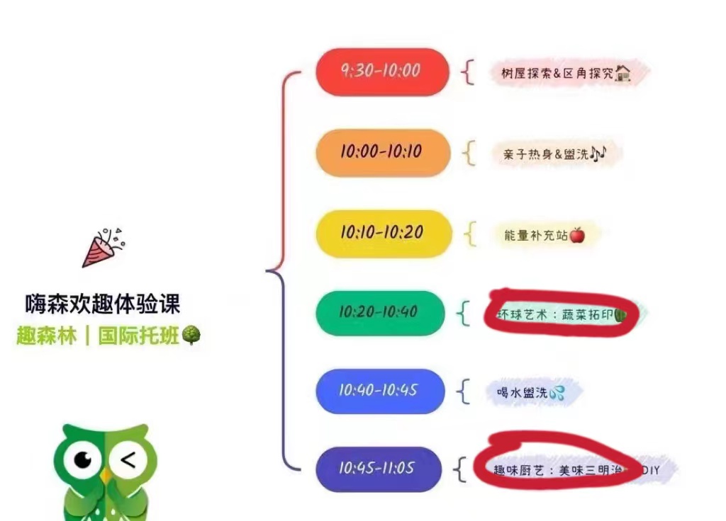 🎁免费体验课:每周六下午托班嗨森体验课,时长一个小时左右,包含两节主题课,每周会安排不一样的课程