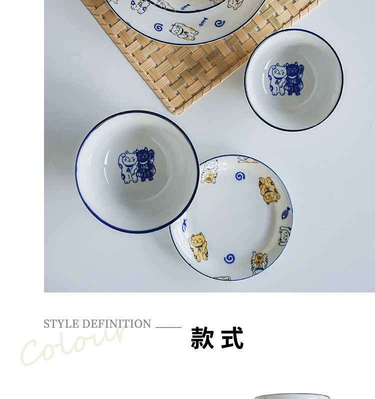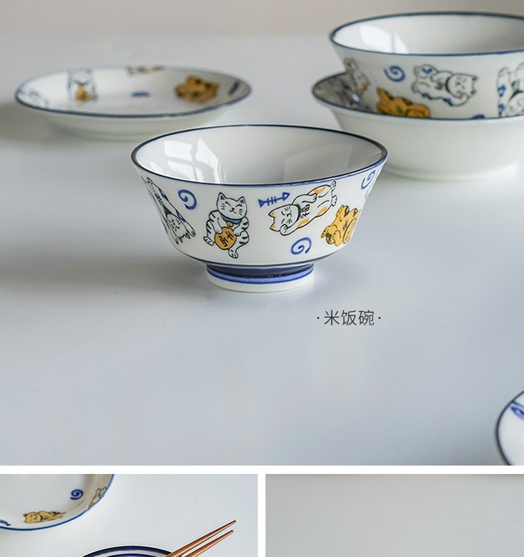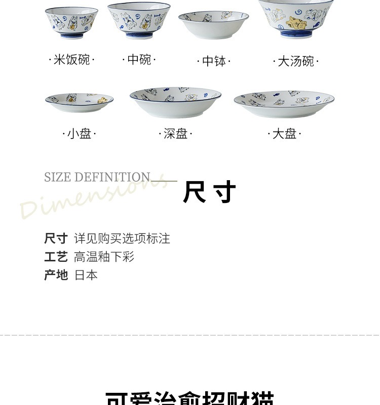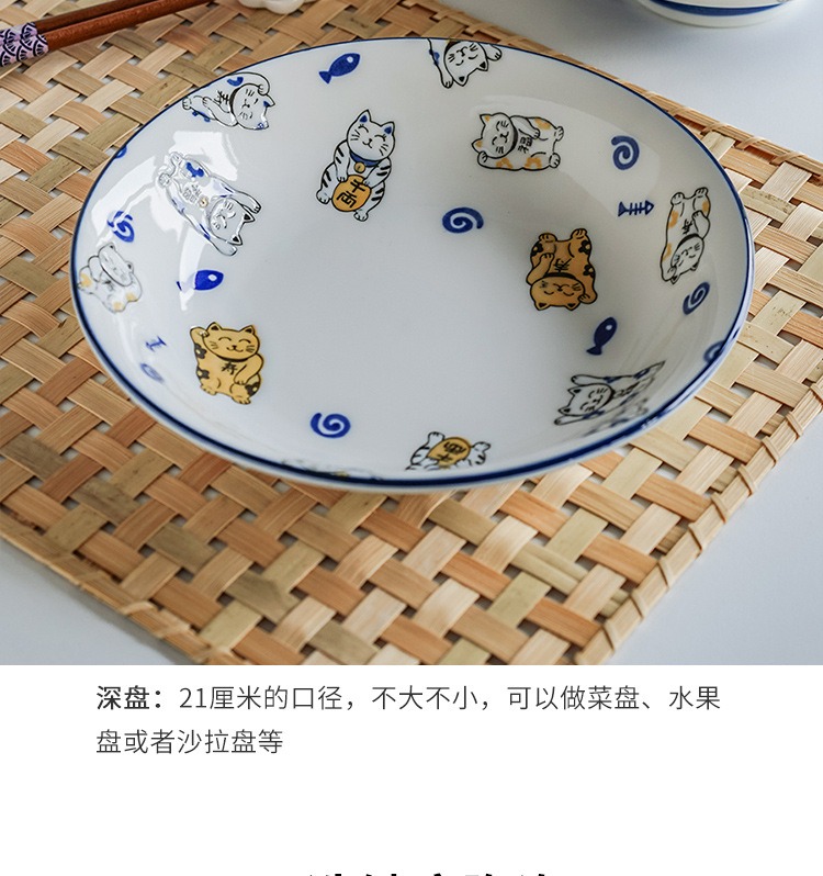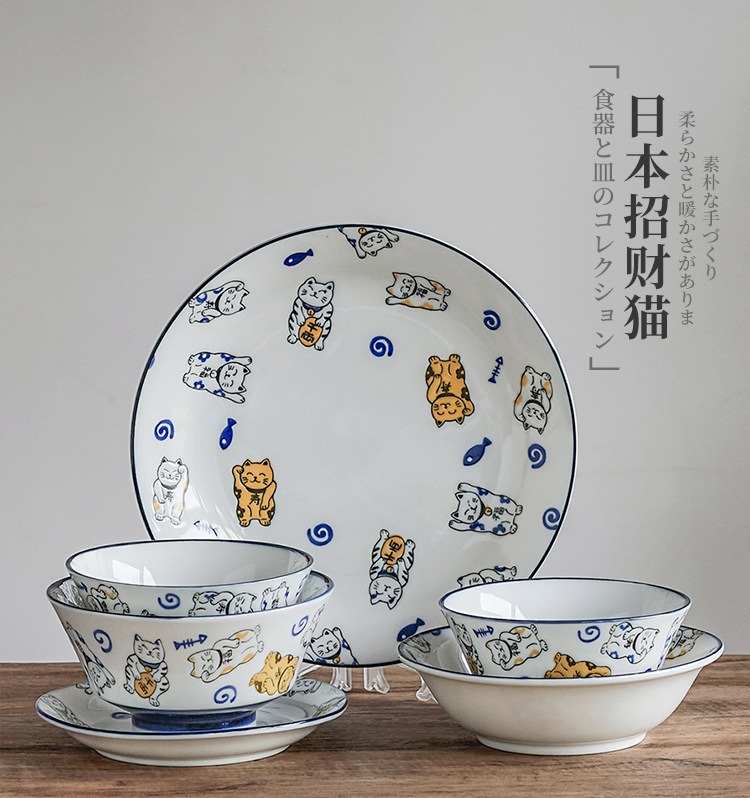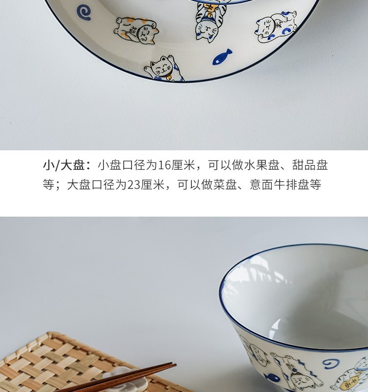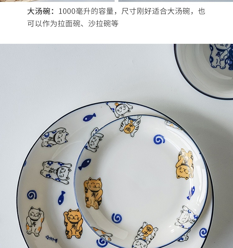 日本进口碗盘套装日式清新可爱手绘招财猫米饭碗汤碗小碟菜盘大盘美浓烧幸运猫散件