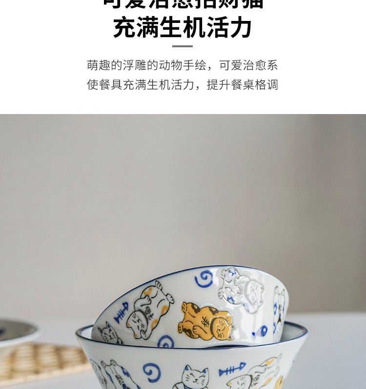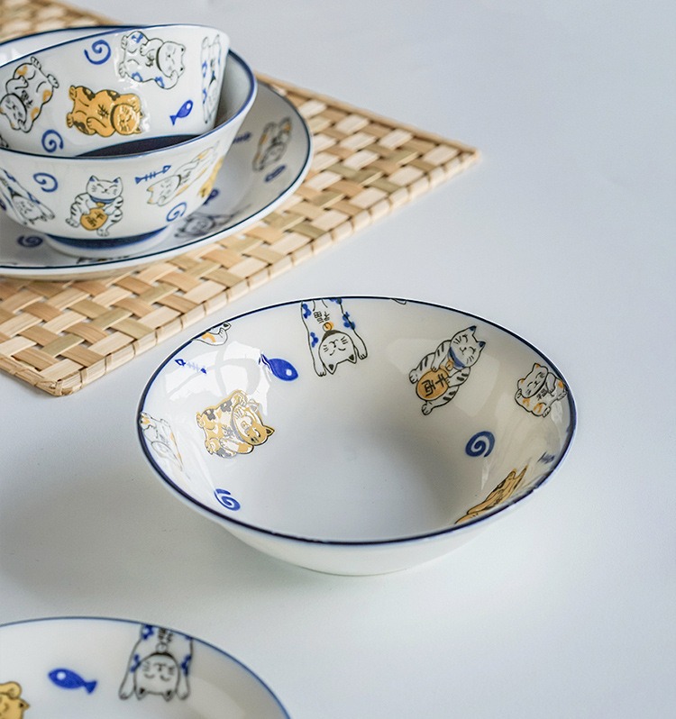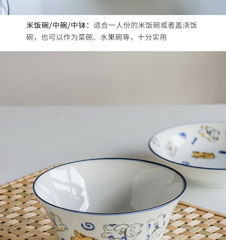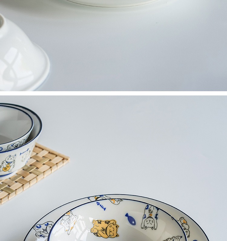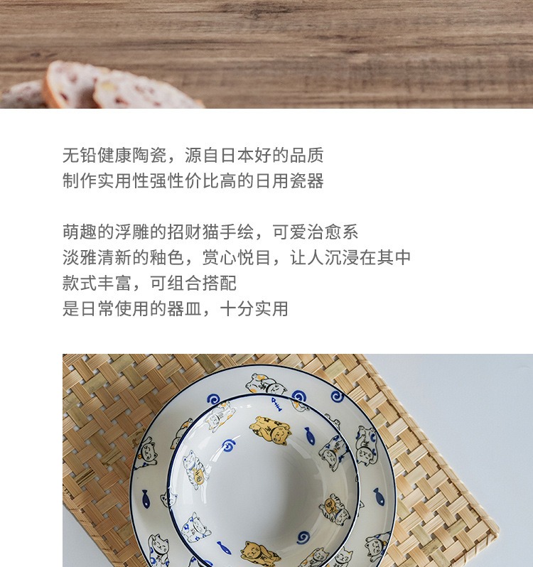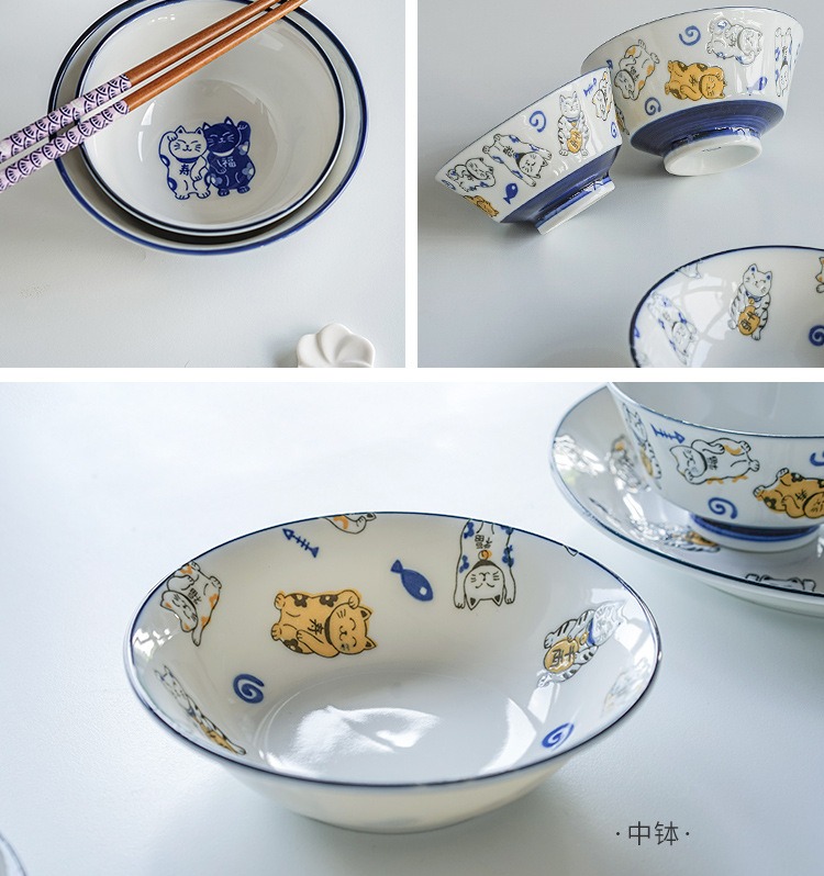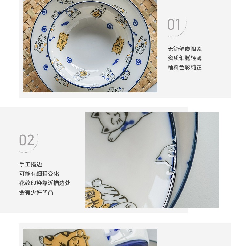 日本进口碗盘套装日式清新可爱手绘招财猫米饭碗汤碗小碟菜盘大盘美浓烧幸运猫散件
