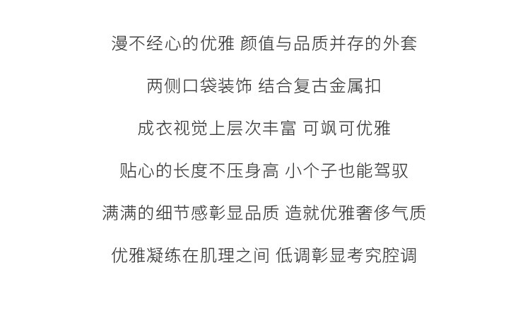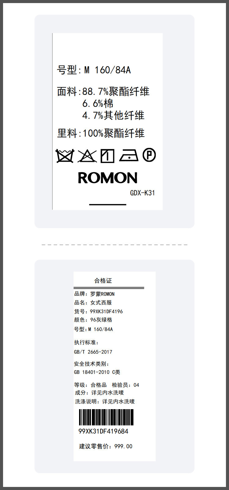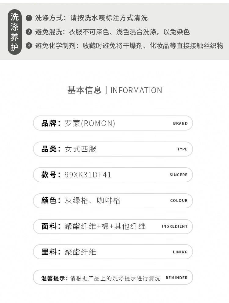 面料:88.7%聚酯纤维 6.6%棉 4.7%其他纤维 里料:100%聚酯纤维