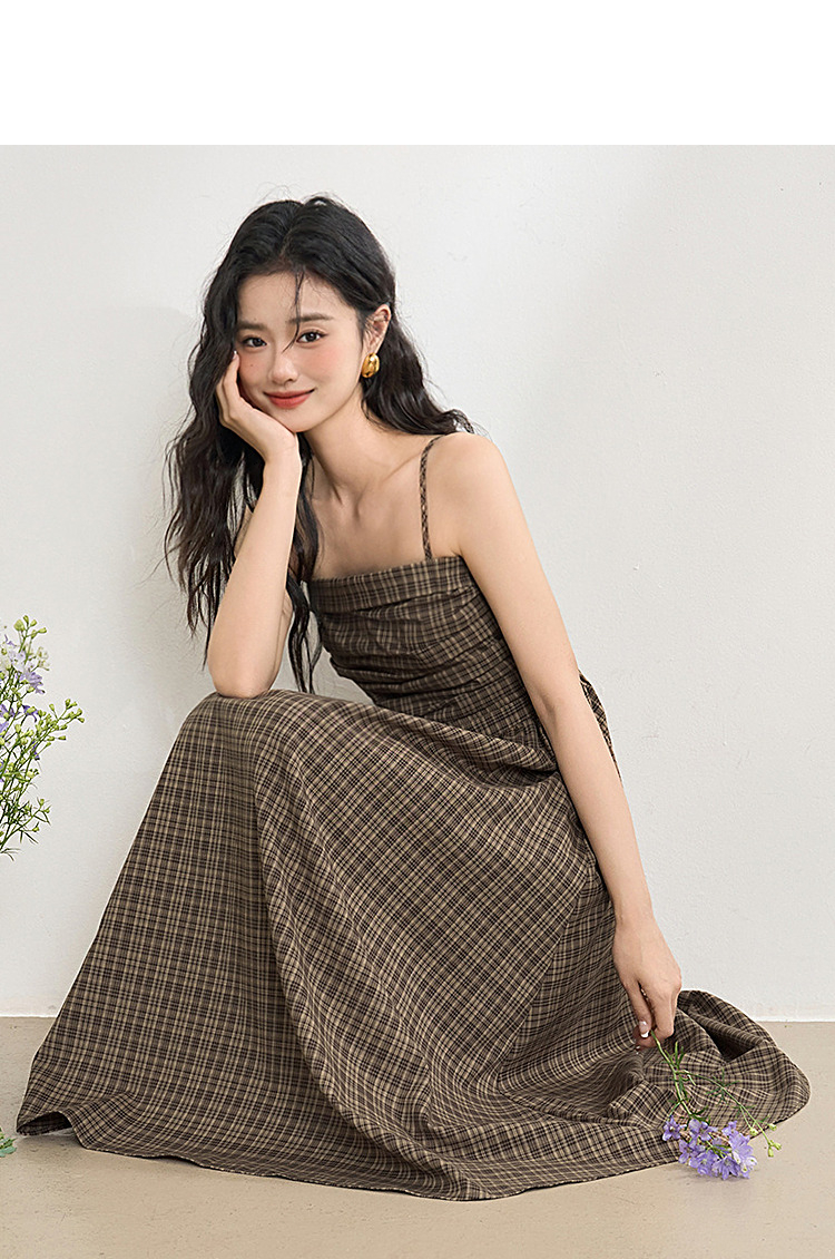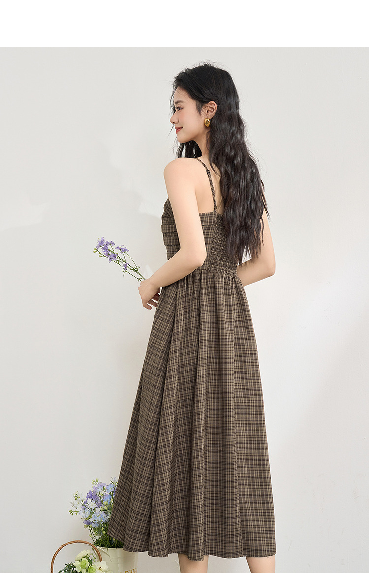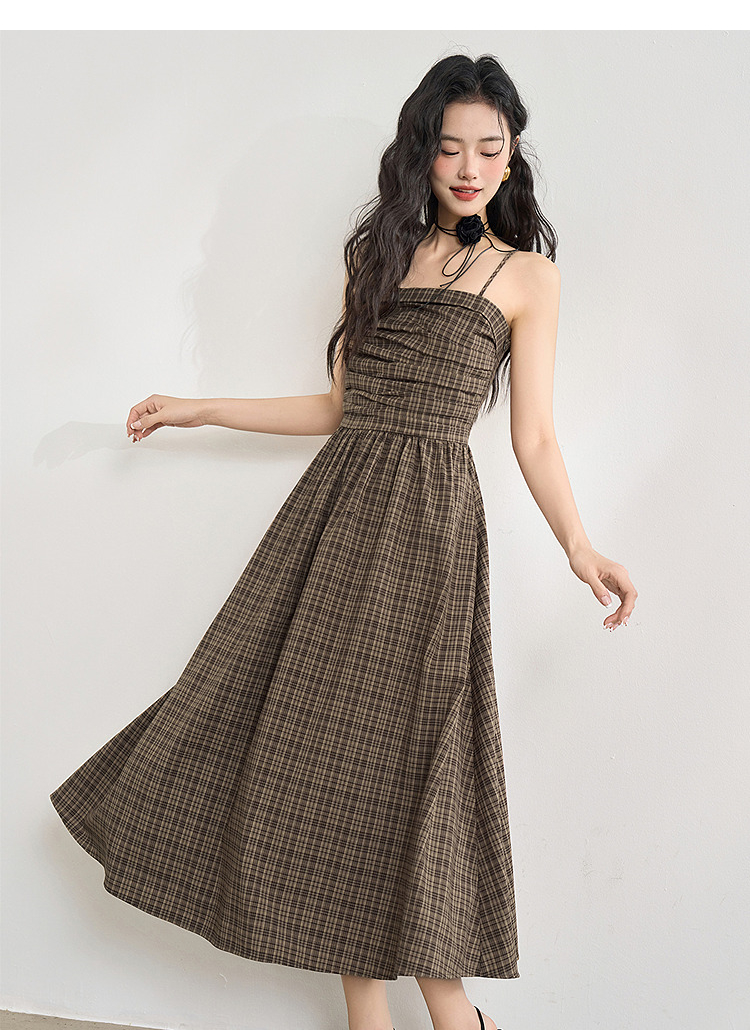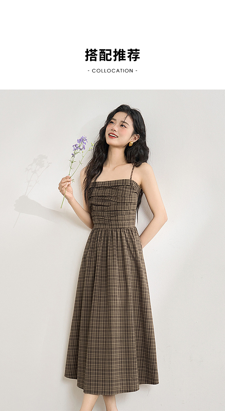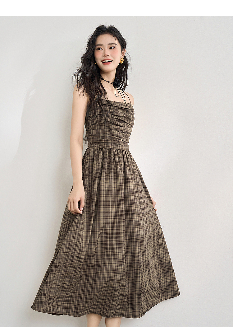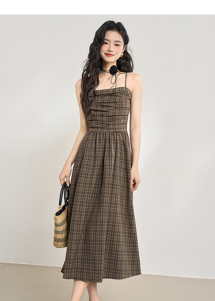 美拉德法式复古格纹吊带裙女夏季收褶打揽收腰连衣裙V1050584