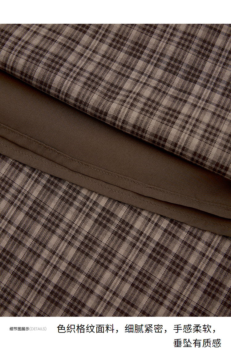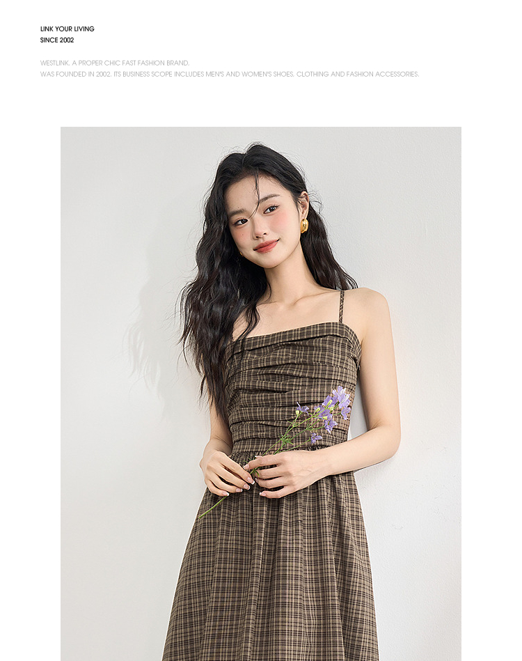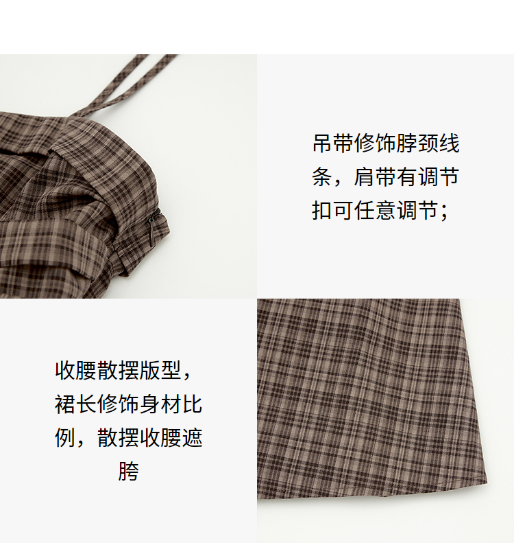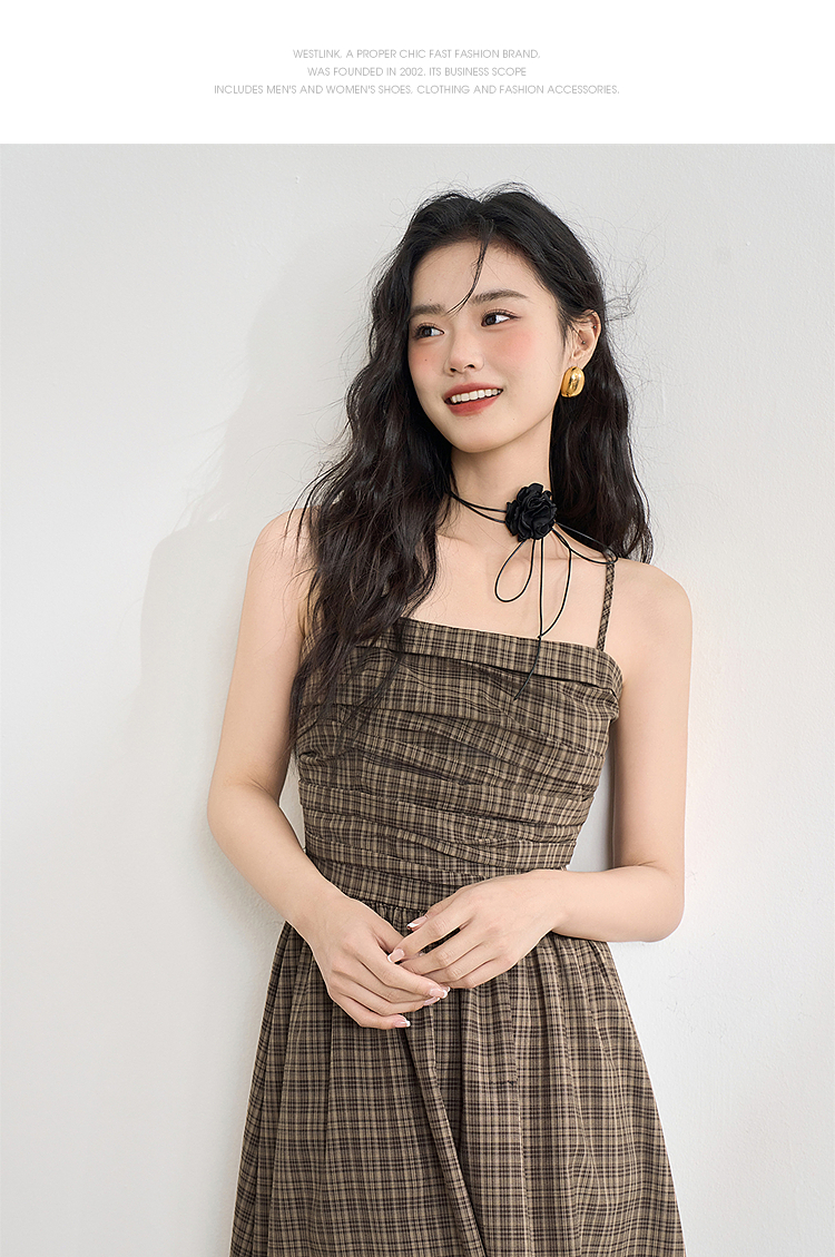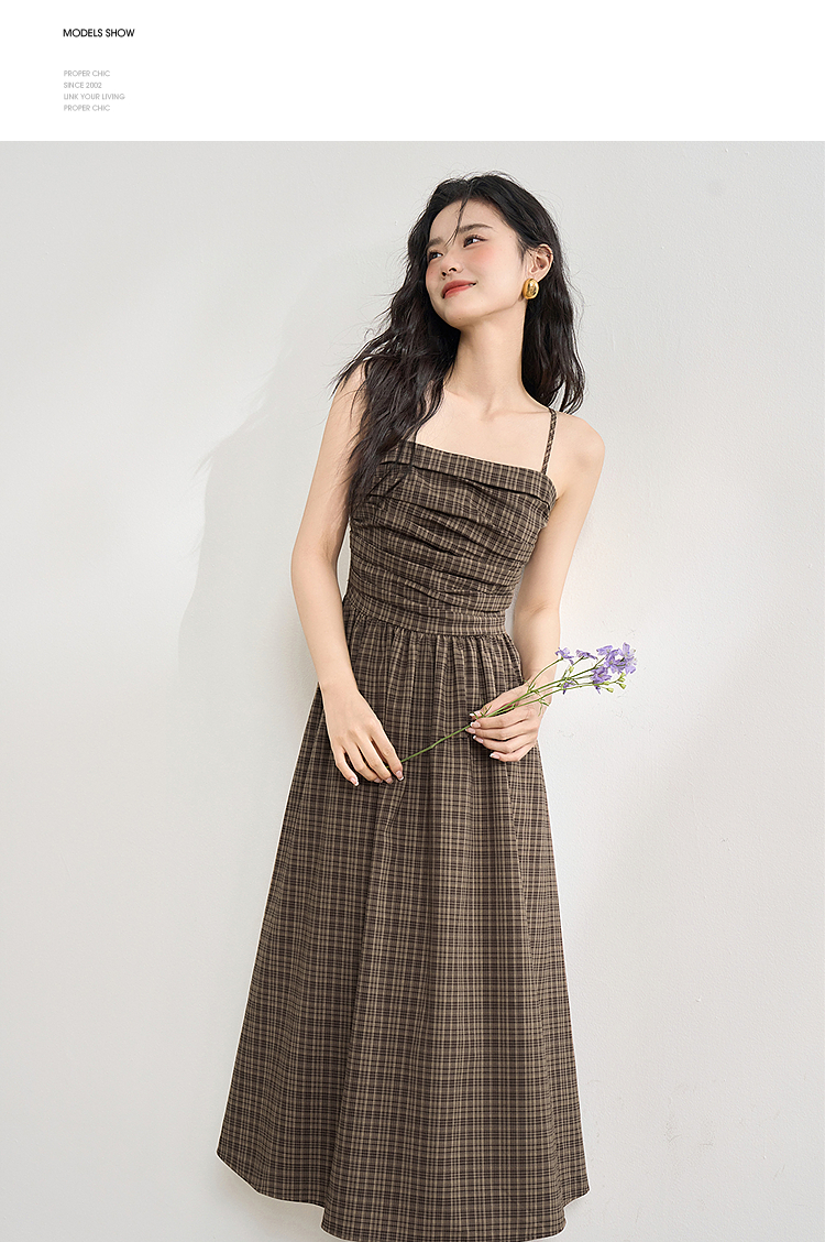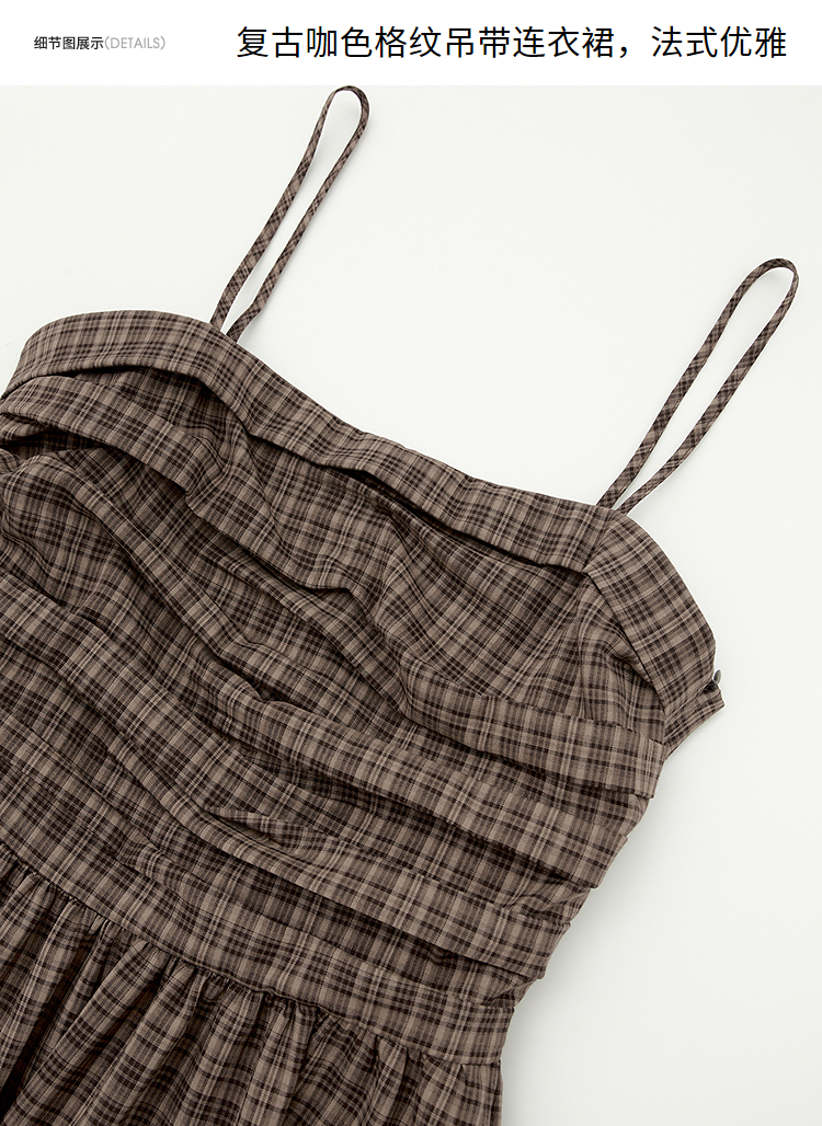 美拉德法式复古格纹吊带裙女夏季收褶打揽收腰连衣裙V1050584