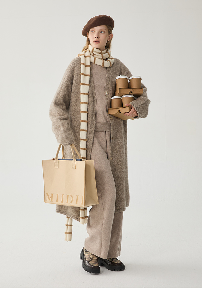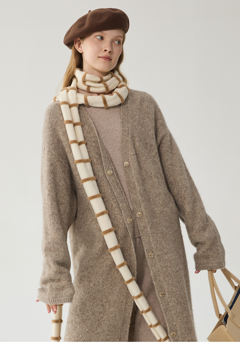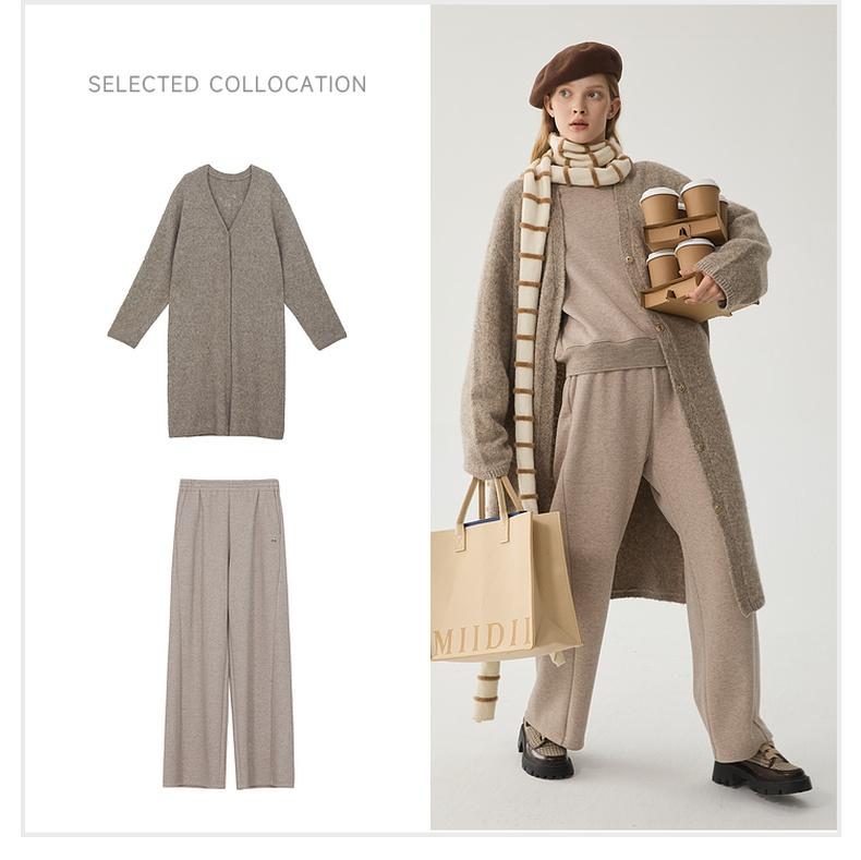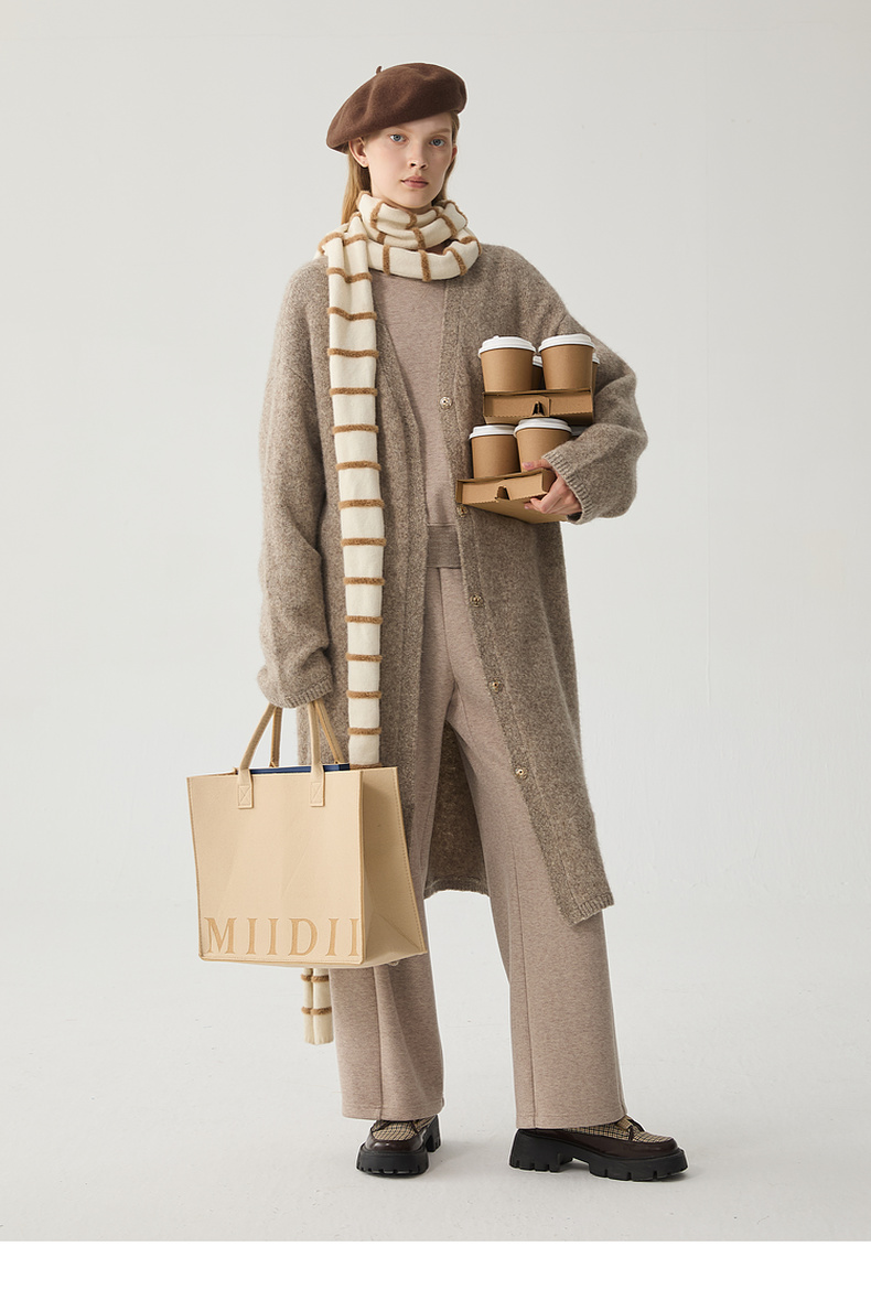 谜底长款针织开衫女2024冬新品慵懒风纯色羊毛保暖毛衣244MZ1869